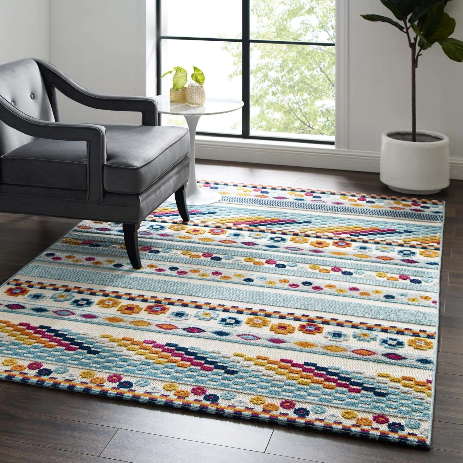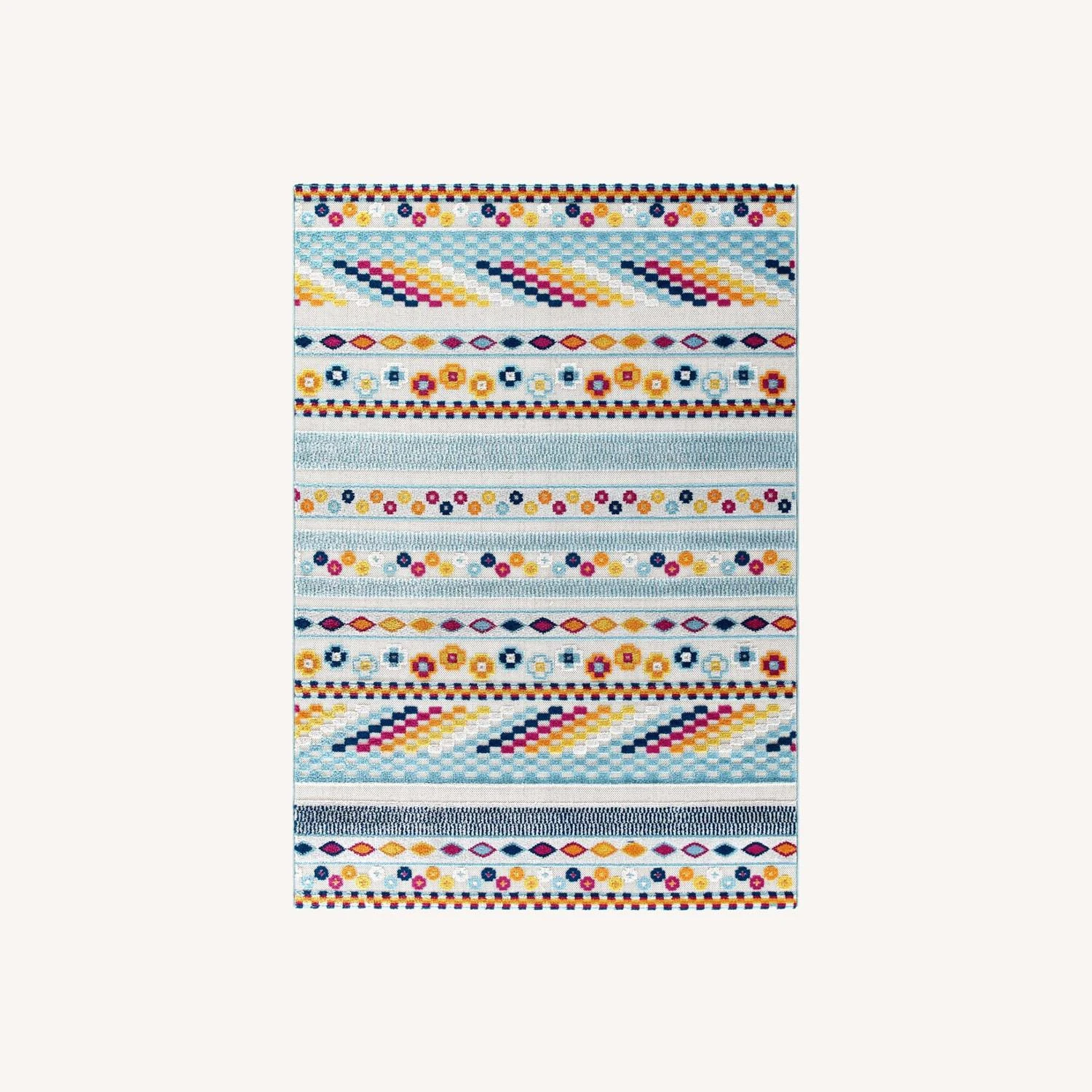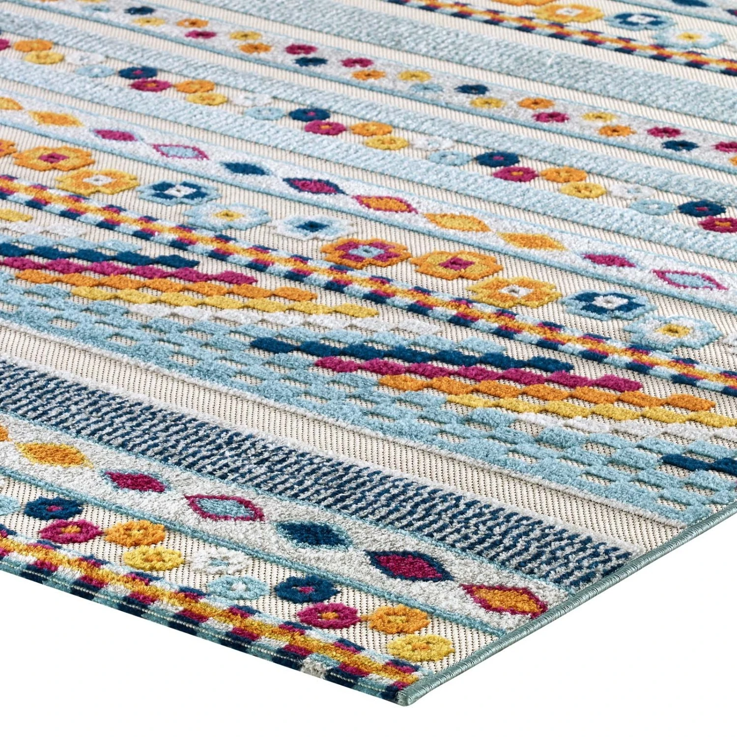 โข Featuring a distressed abstract geometric design with a low two-tier pile weave and gripping rubber bottom, this all-weather area rug is a perfect addition to the outdoor patio, porch, deck, or inside the house in the living room, bedroom, kitchen or dining room.