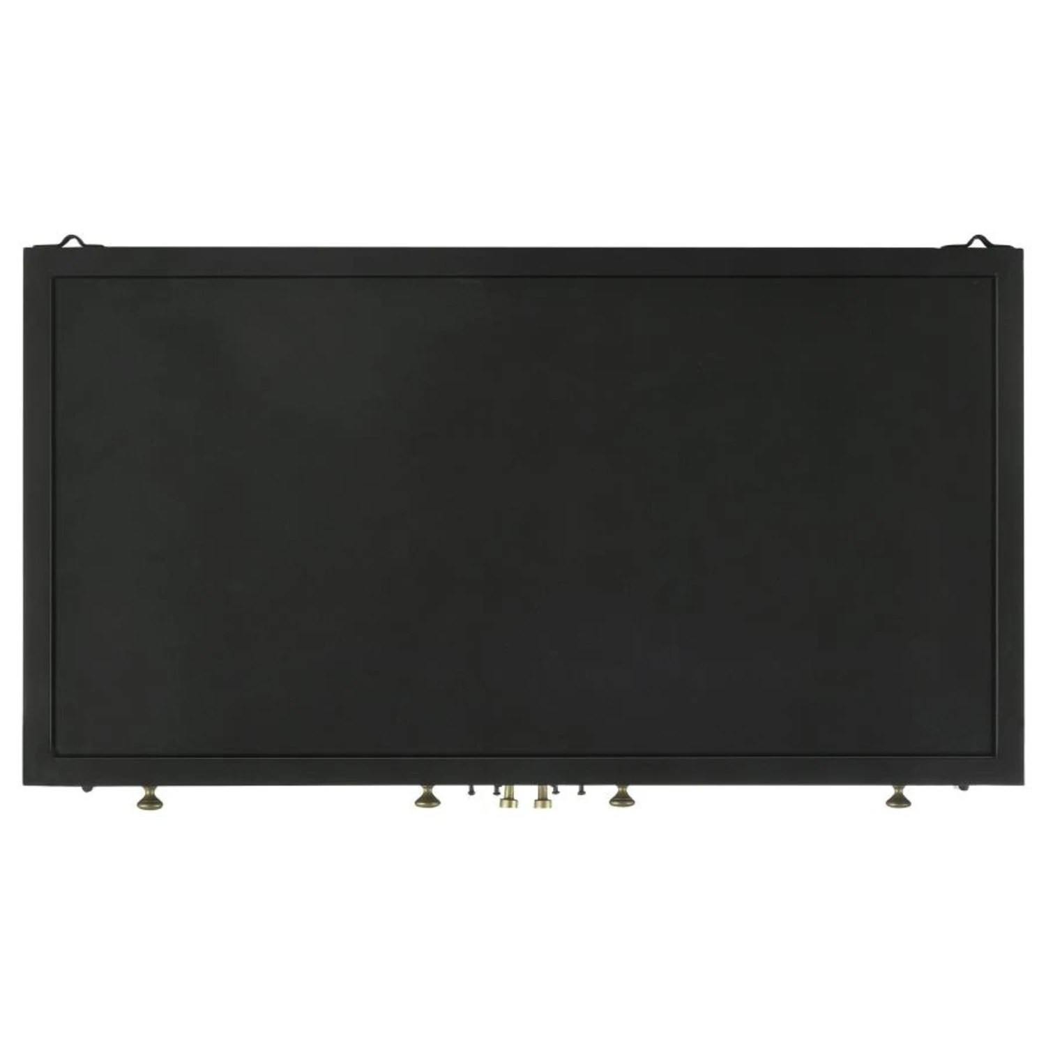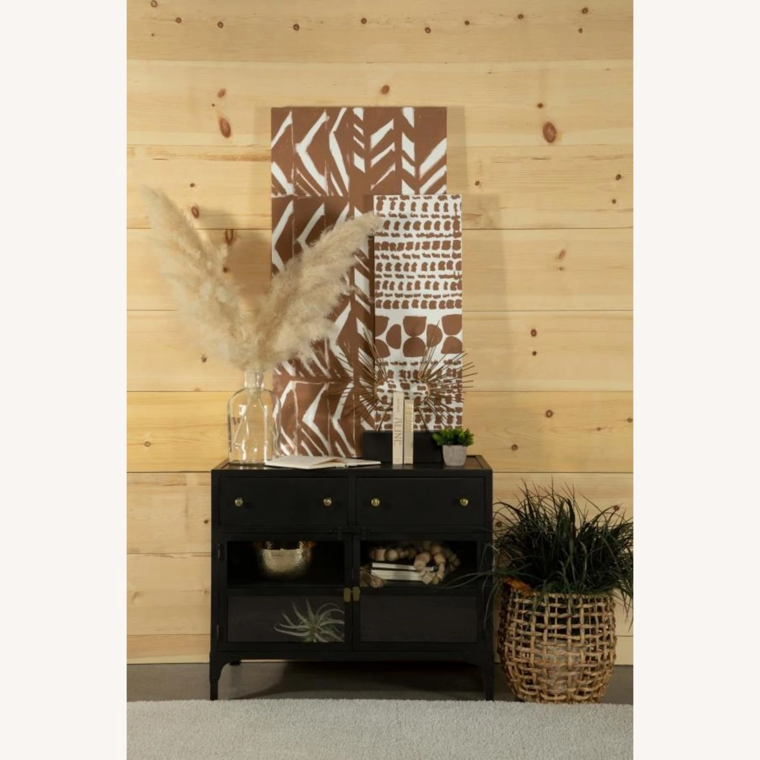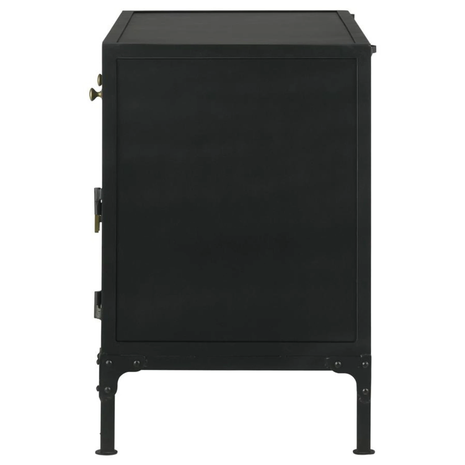 โข Industrial inspired accent cabinet features a matte black metal finish and tempered glass
