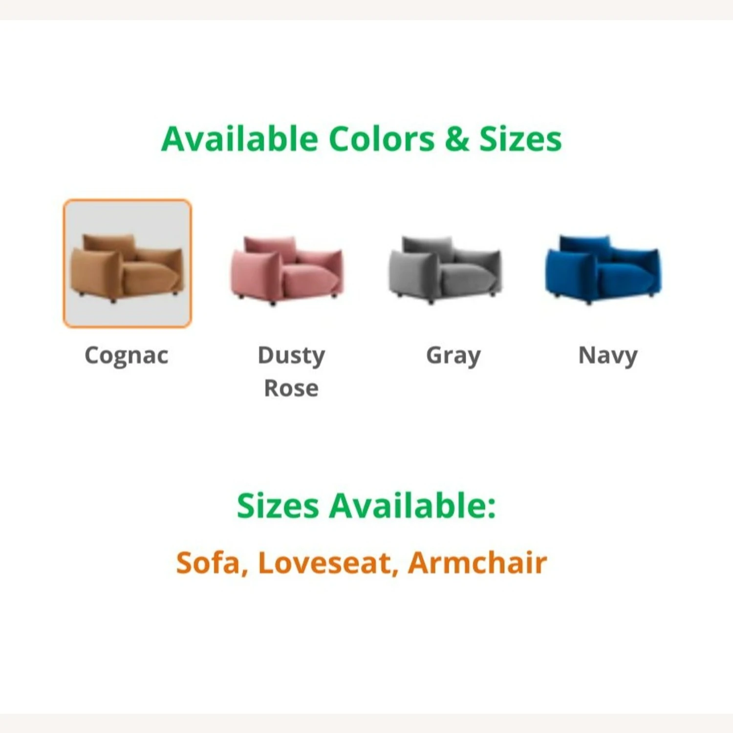 This model comes in these colors: COGNAC, DUSTY ROSE, GRAY, & NAVY, and these sizes: SOFA, LOVESEAT, & ARMCHAIR. If you are interested in a color/size other than that of this listing, and if the quantity you wish to purchase is greater than what is listed here, please message us for availability.