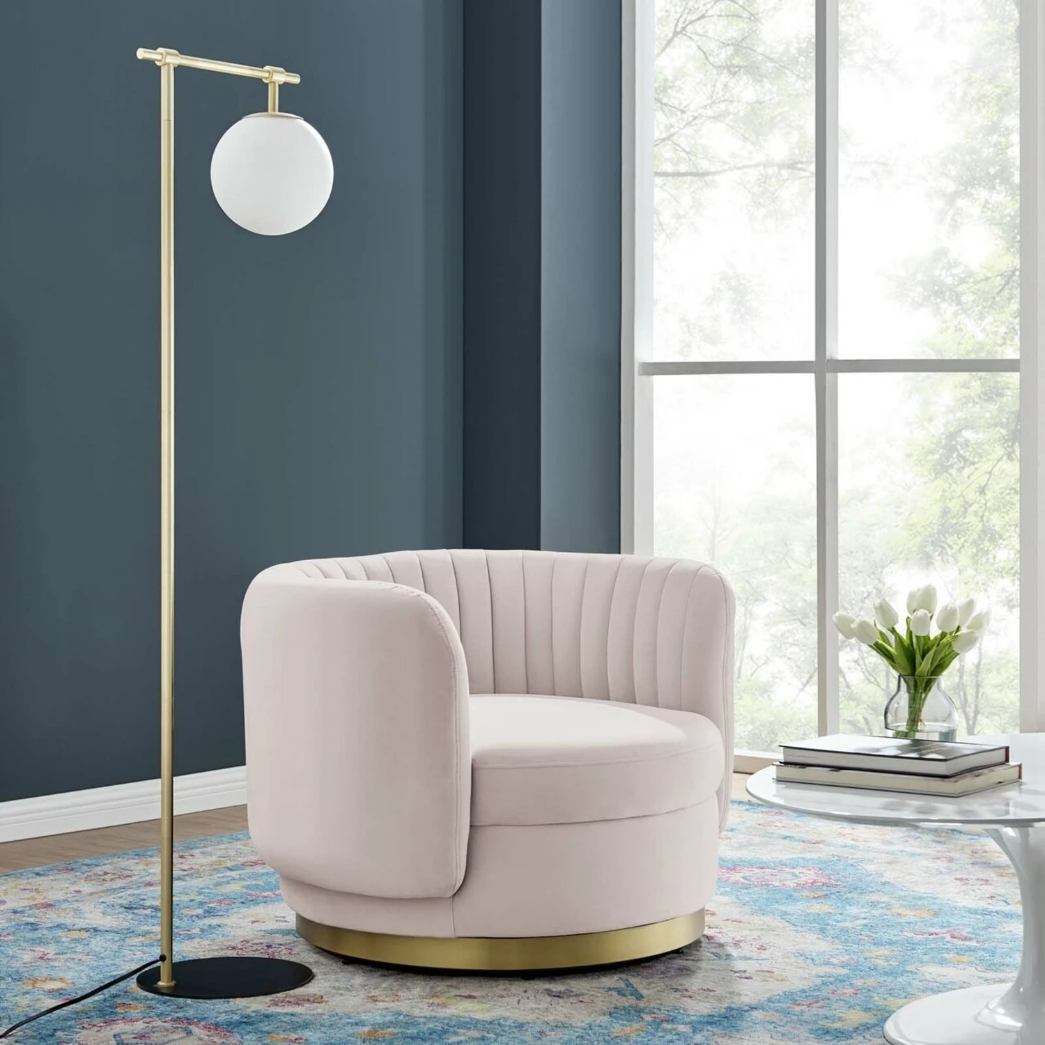 • Adorned with vertical channel tufting, gold metal accents, and a beautiful curved silhouette, this velvet accent chair brings vintage modern luxury and glam deco style to a living room, bedroom, entryway, home office, or seating area.