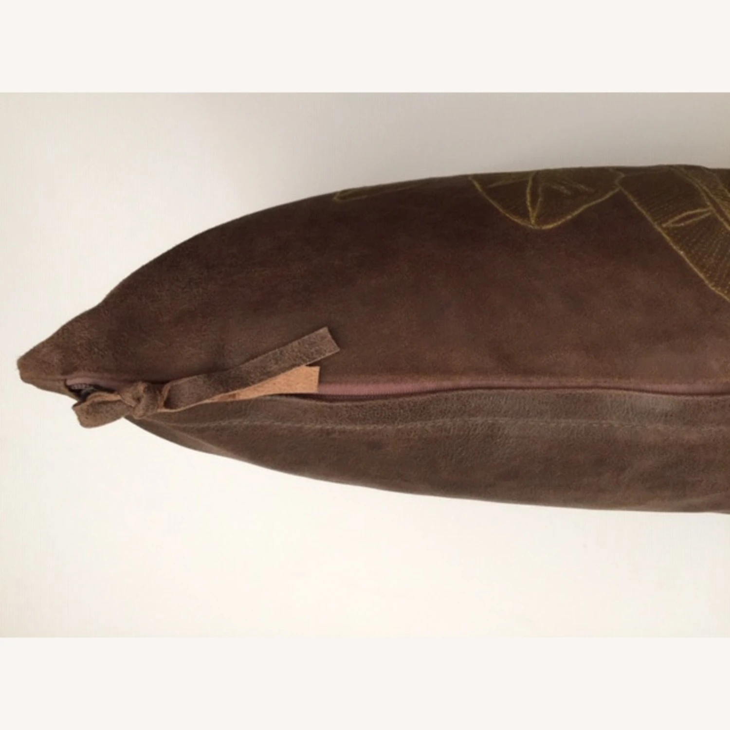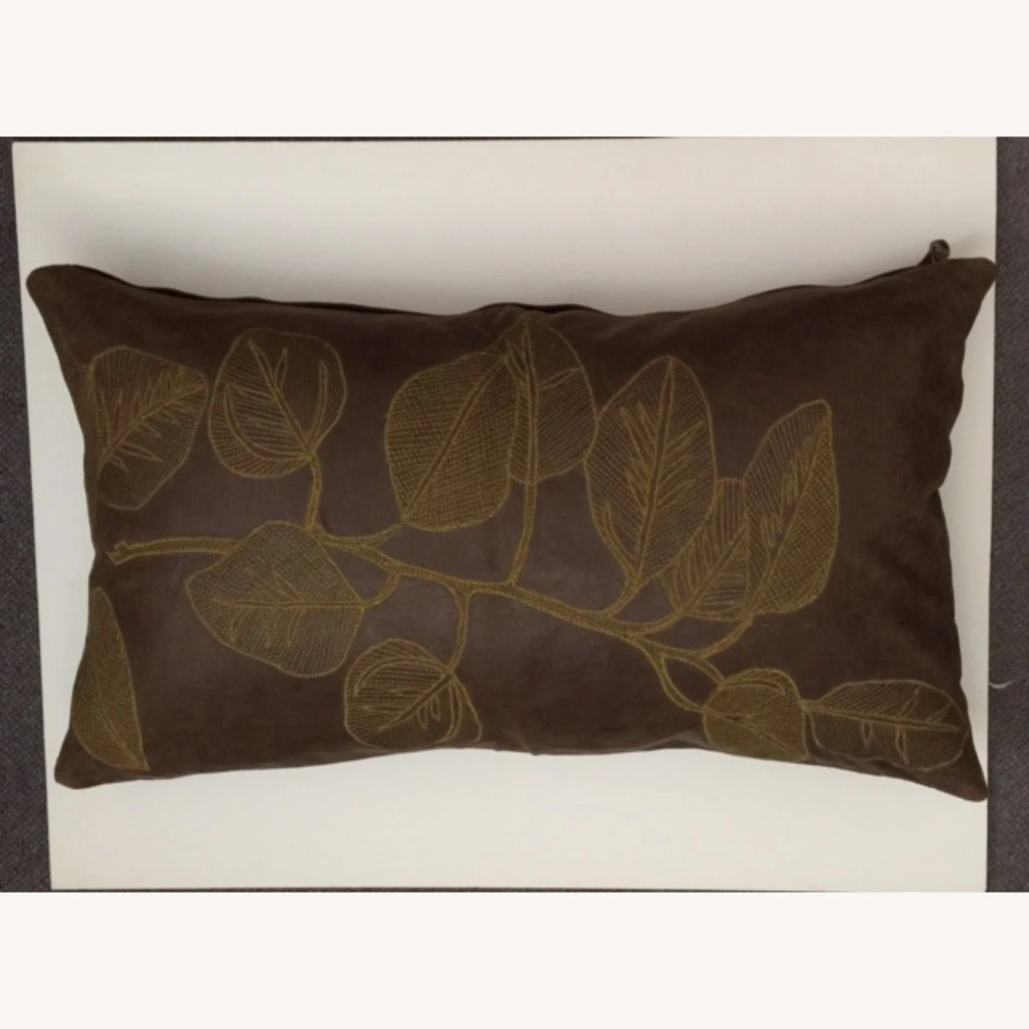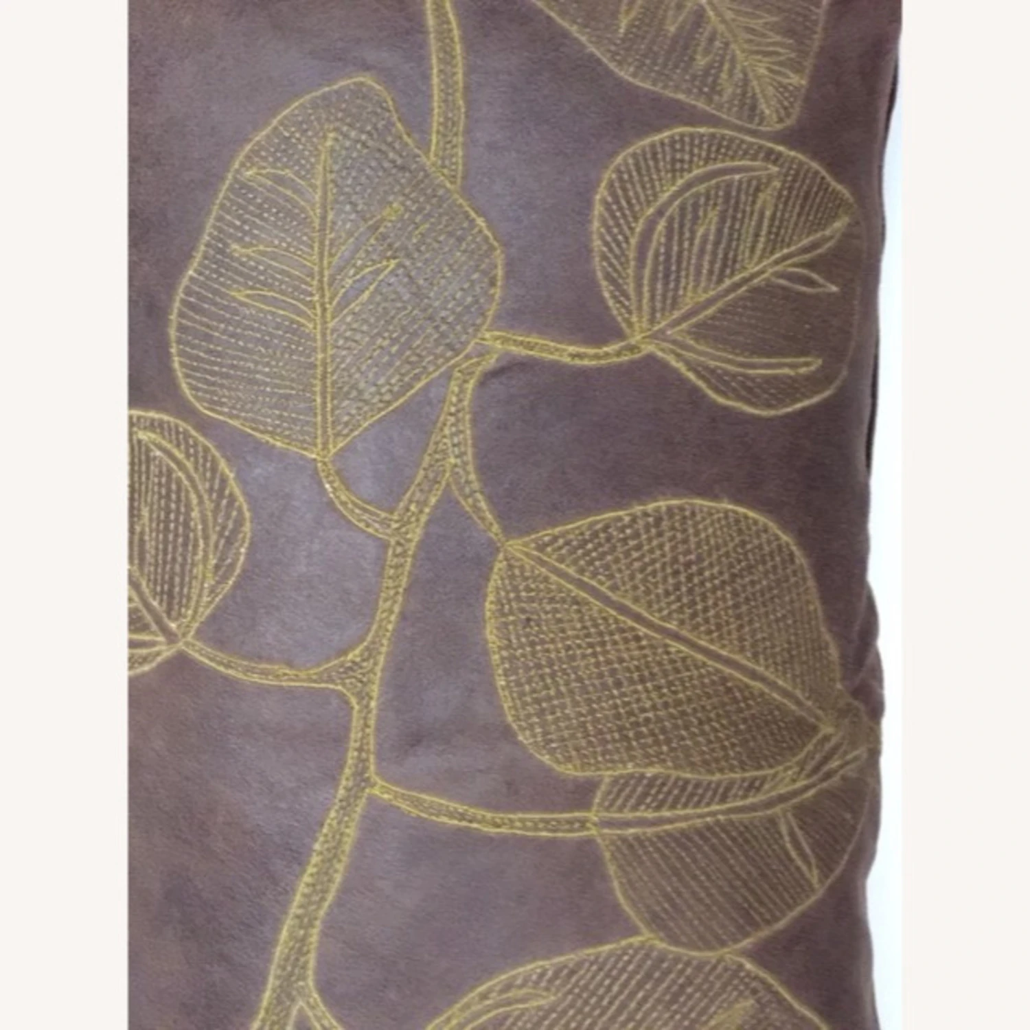 Seller’s Notes: Beautifully intricately hand-embroidered in contrast embroidery thread, this botanical leaf branch design takes a modern look in this large-scale with this intricate etching embroidery technique. Amazing decor and perfect to pair with a print or solid color story theme. Front and back is 100% soft distress leather in a Cocoa color. Feather/Down pillow insert included for a soft and comfortable luxurious feel.
