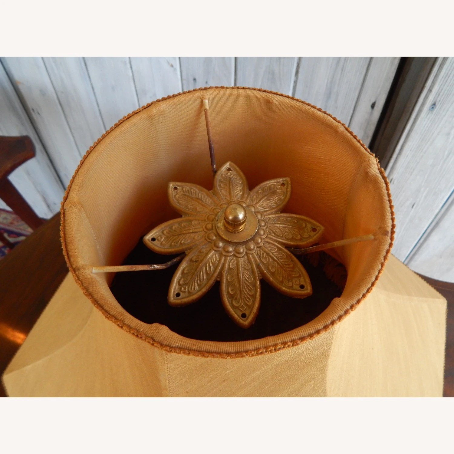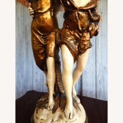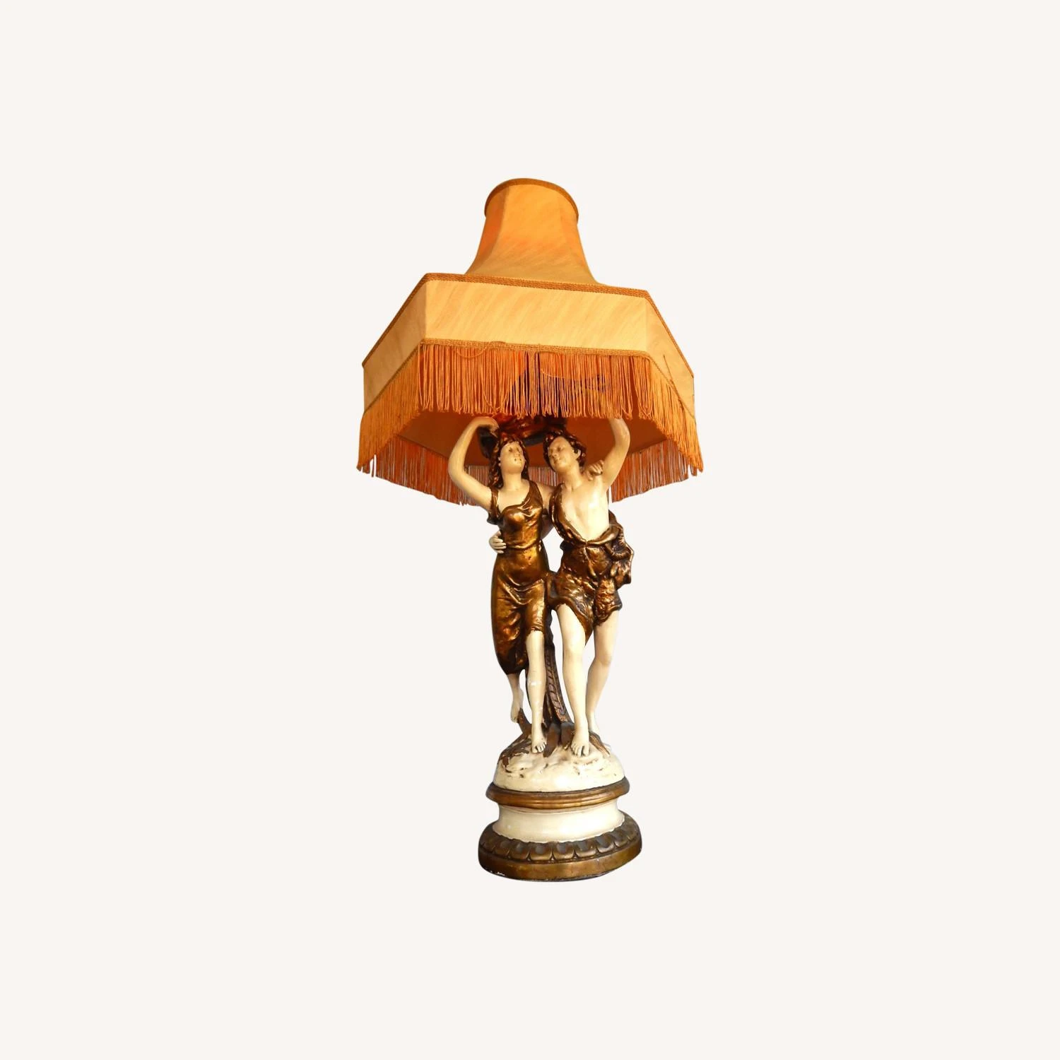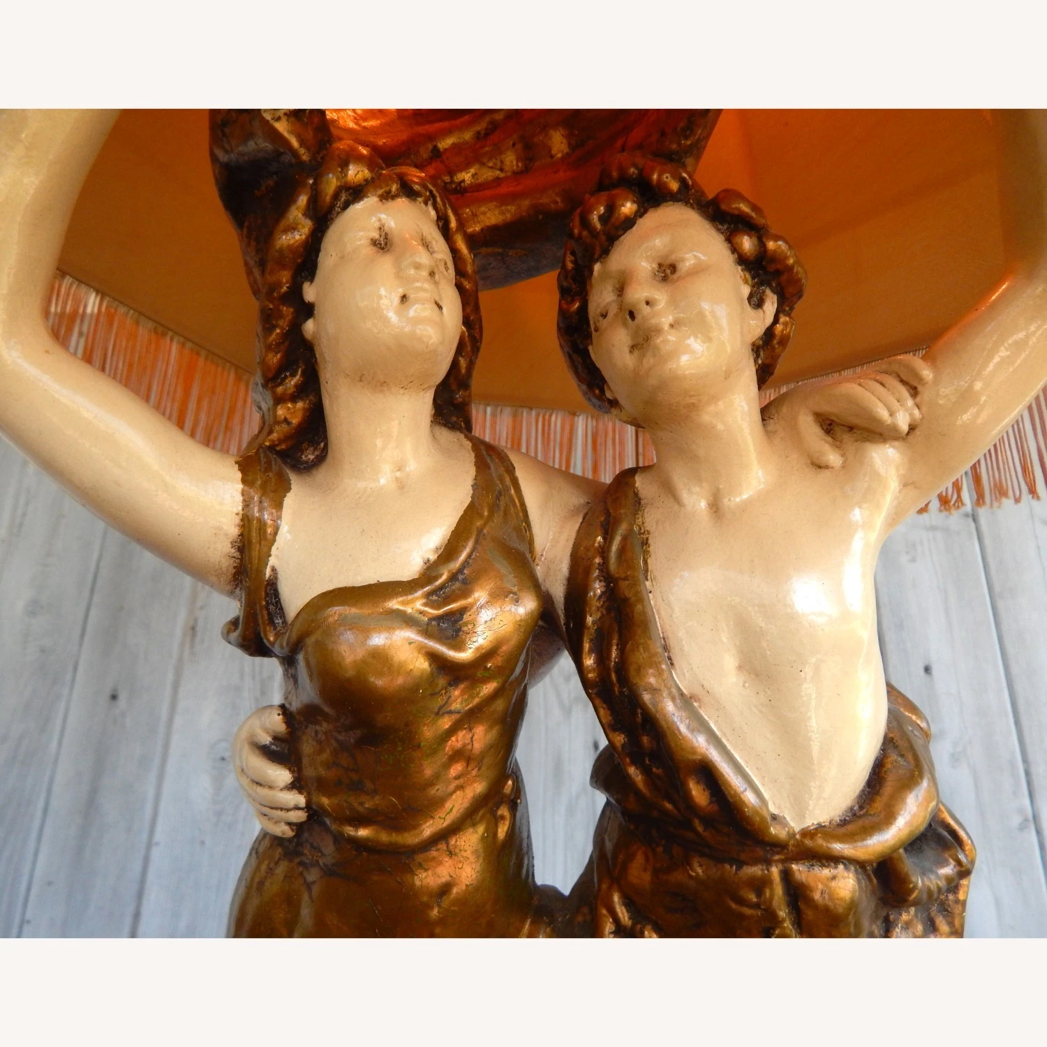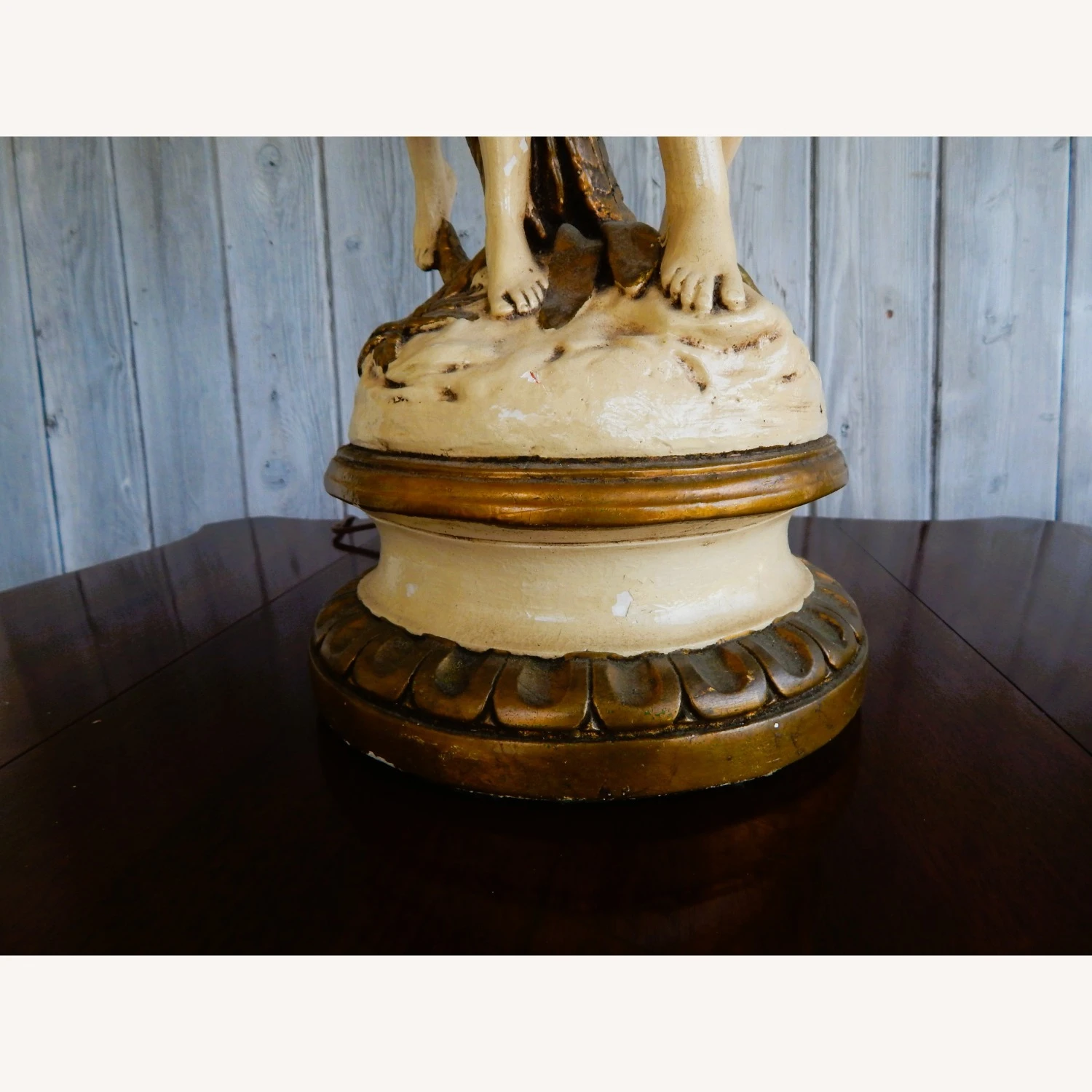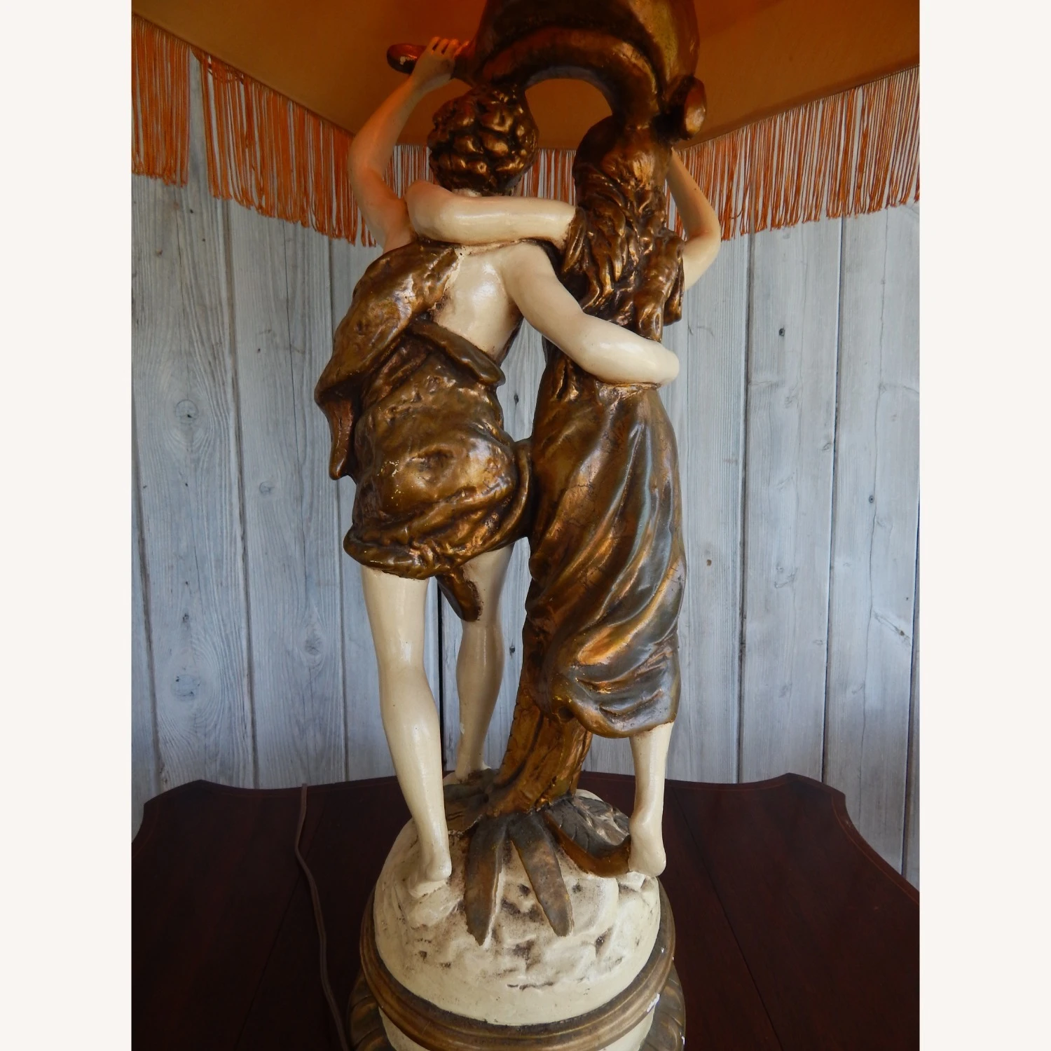 Seller’s Notes: If you’re looking to make a statement, this will surely do the trick. 30″ base, 39″ total to top of harp. Very heavy cast plaster, hand painted French style table lamp. Works perfectly. A few small shallow chips that can be remedied with a few touches of gold craft store paint.