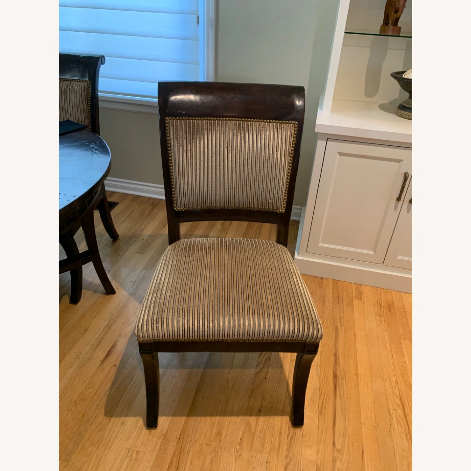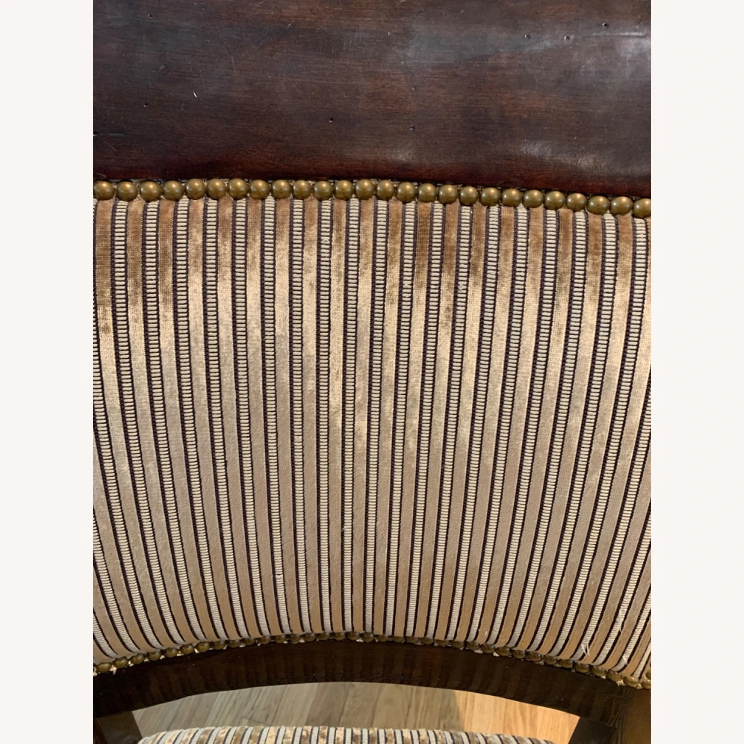 The chairs are custom upholstered with a soft Bergamo goldish chenille fabric and brass nail heads. The chairs measure 22x19x40.