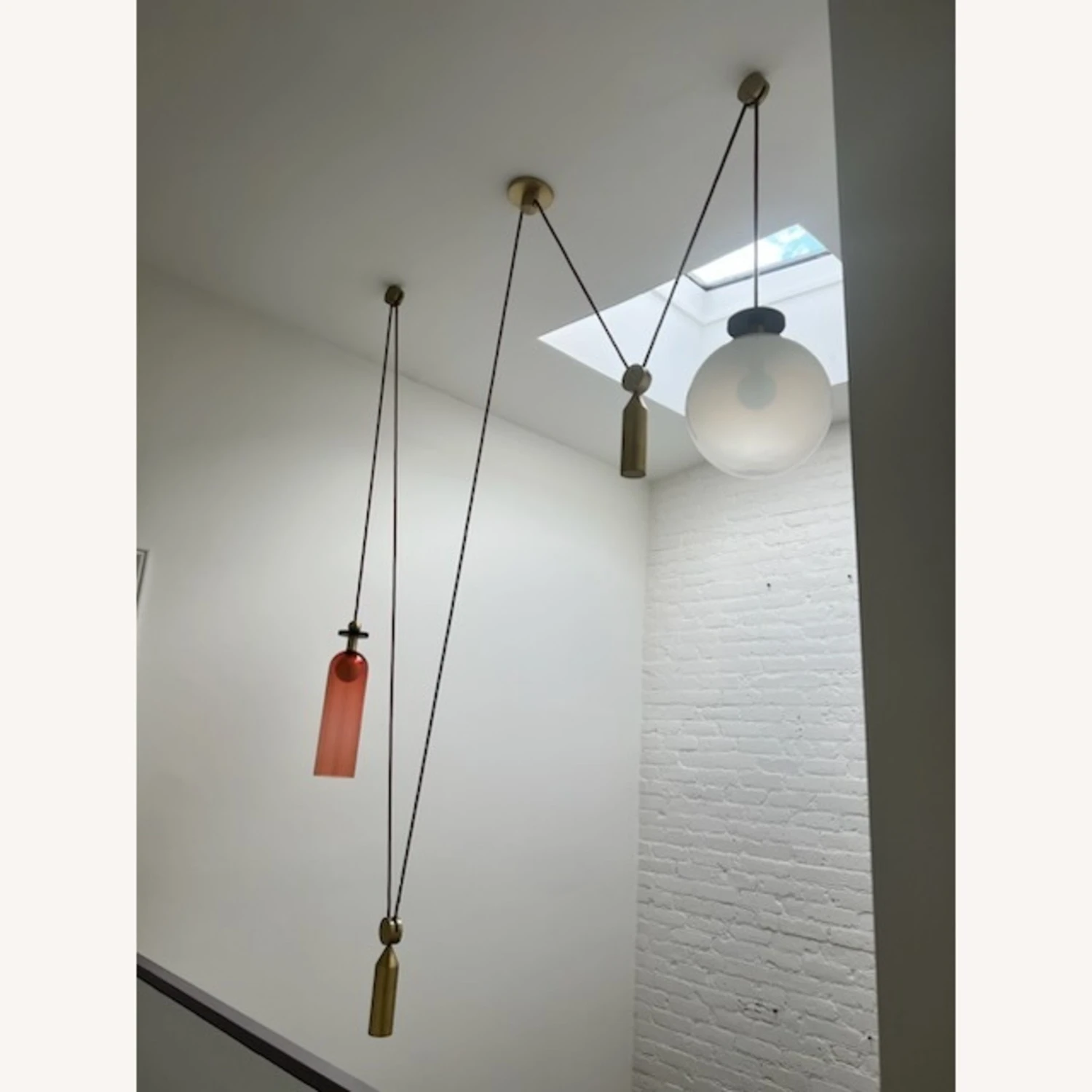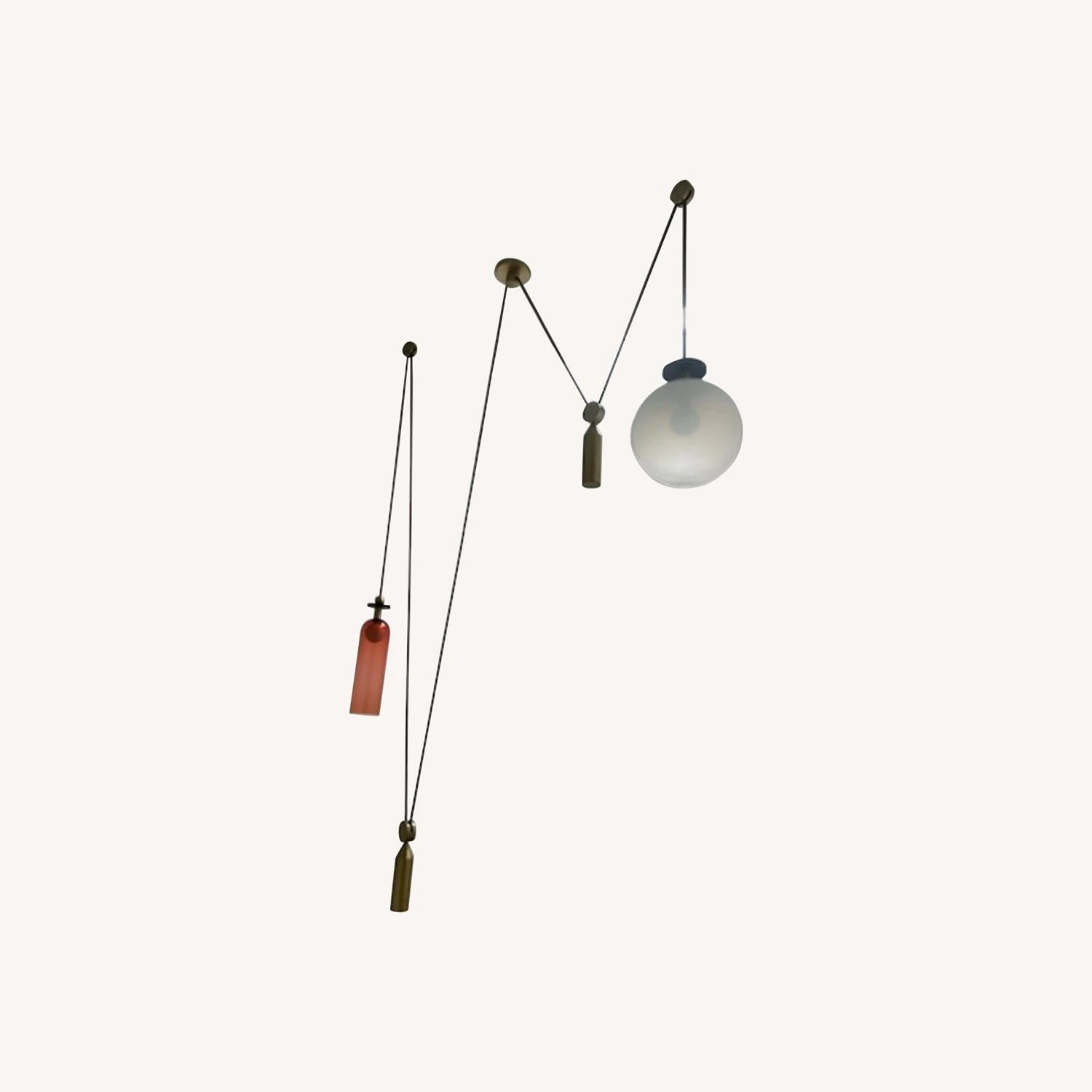 This 2 pc configuration pairs a cone and cylinder pendant to a single wired canopy. Each pendant is adjustable in height at any time via the solid brass counterweight and pulley hardware.
