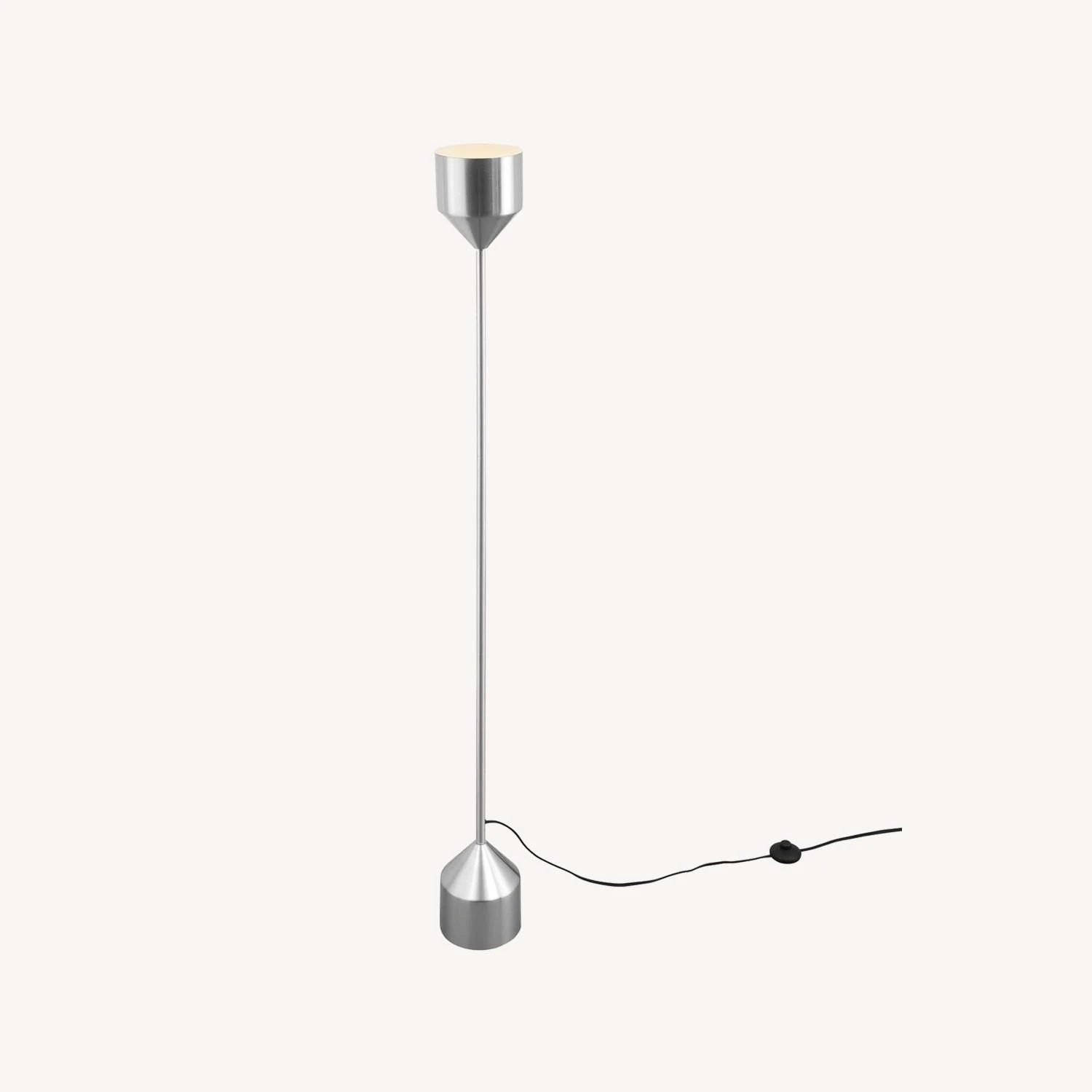 โข This floor lamp emanates elegance and symmetry with the cone-shaped shade mirrored by the matching base, connecting at the peaks by a single rod.