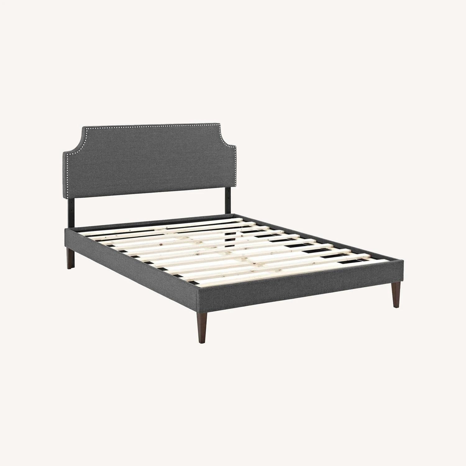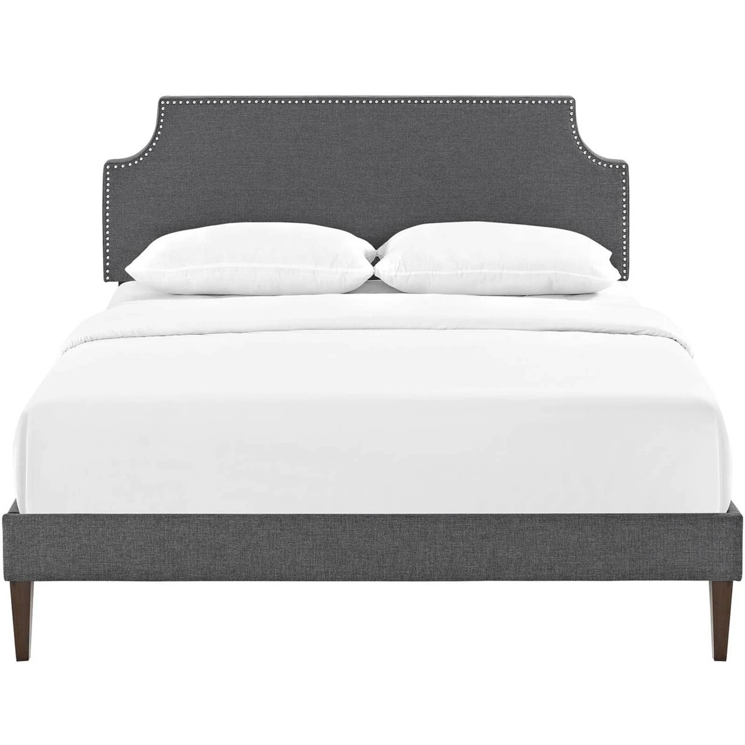 โข Made with a solid wood frame upholstered in polyester fabric, this full bed features tapered wood legs, plastic foot glides, stylish headboard, and ten sturdy wood slats with a centered supporting bar and two support legs for enhanced stability.