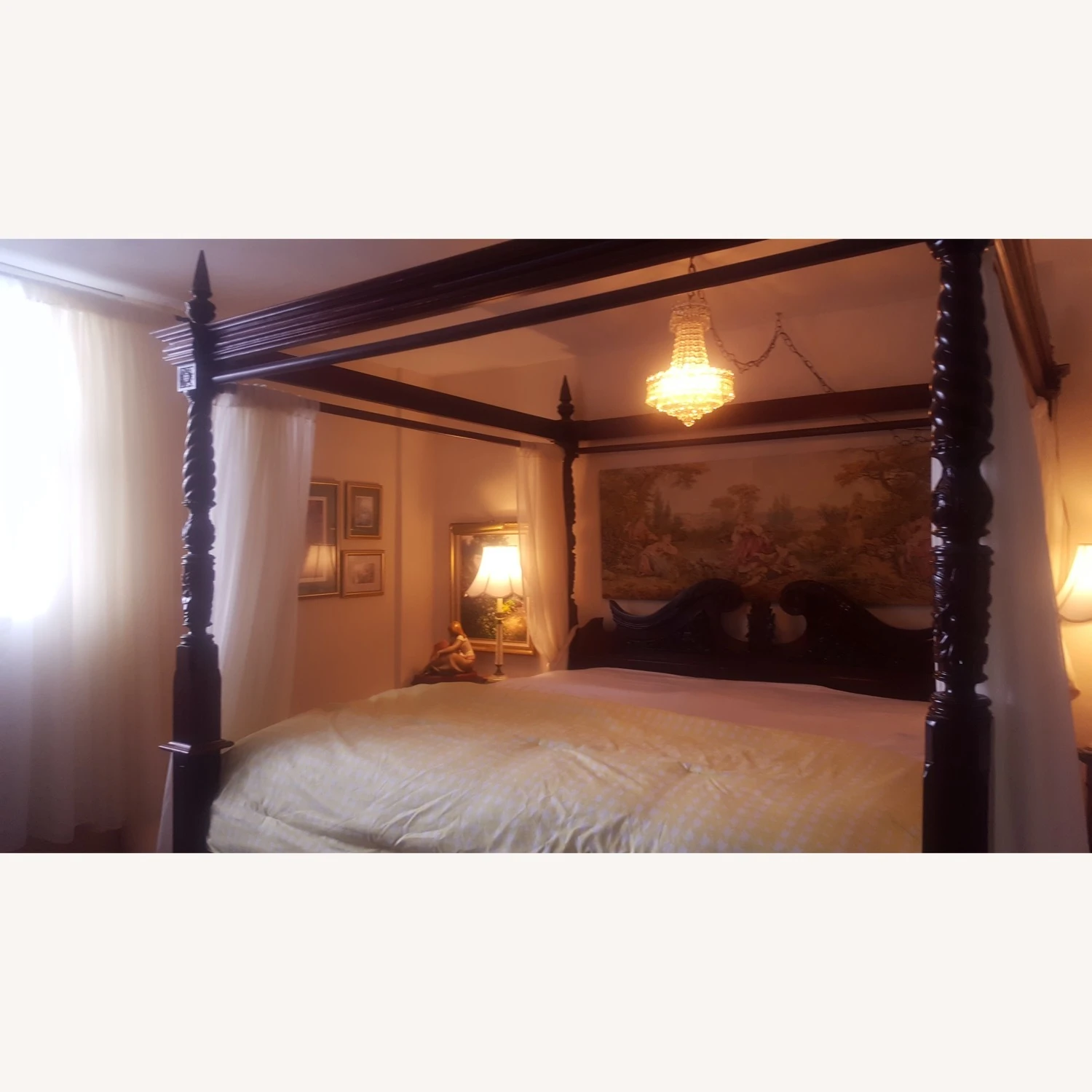 Seller’s Notes: This is a very fine piece of furniture that is a classic and authentic and representative to it’s time. This is a Tudor Style 4 Poster Bed made of fine wood. My house was decorated in this style that doesn’t quite fit my taste anymore. It was purchased from one of the finest sellers and I now want to decorate in a completely different style. I have many pieces replicating this era: a settee, 2 dining chairs, 2 end tables and a secretary if you are interested in a bundle package I am open to selling it all as one and would negotiate a price for all or any pieces that are all in very good condition through AptDeco.