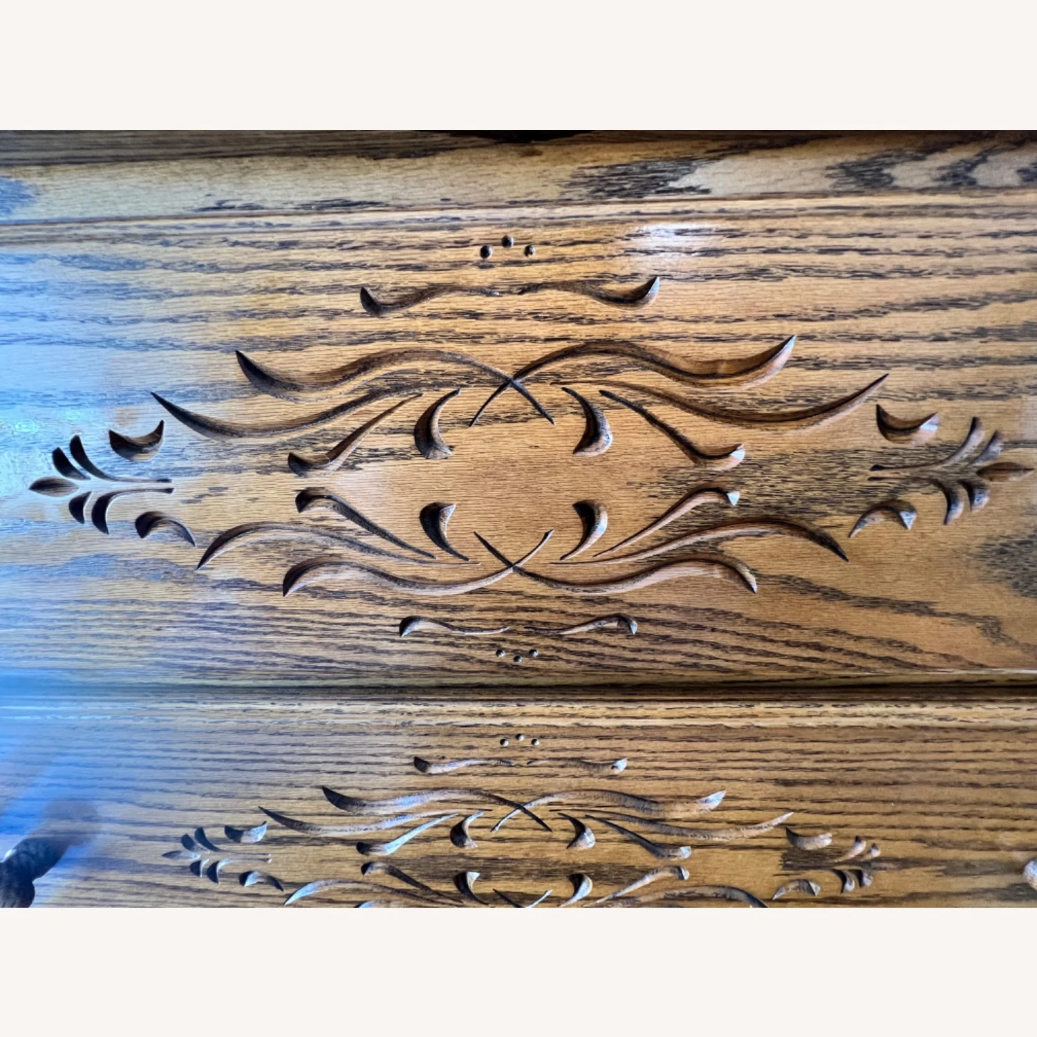 Seller’s Notes: Handmade solid oak dresser from the Mennonite community in western New York State. Crafted with care and solidly built to last. This unique custom piece has hand-carved finishes and modern sliding hardware inside. Minor wear and tear along edges, most not visible. This dresser will fit in among your eclectic antiques and modern home alike.