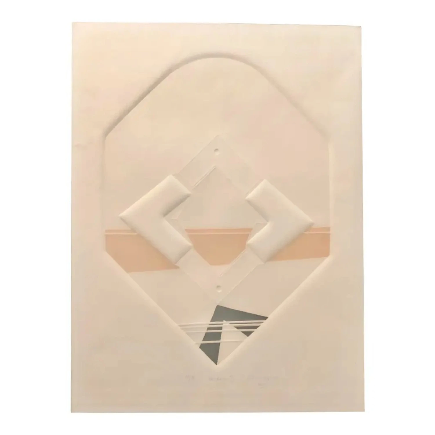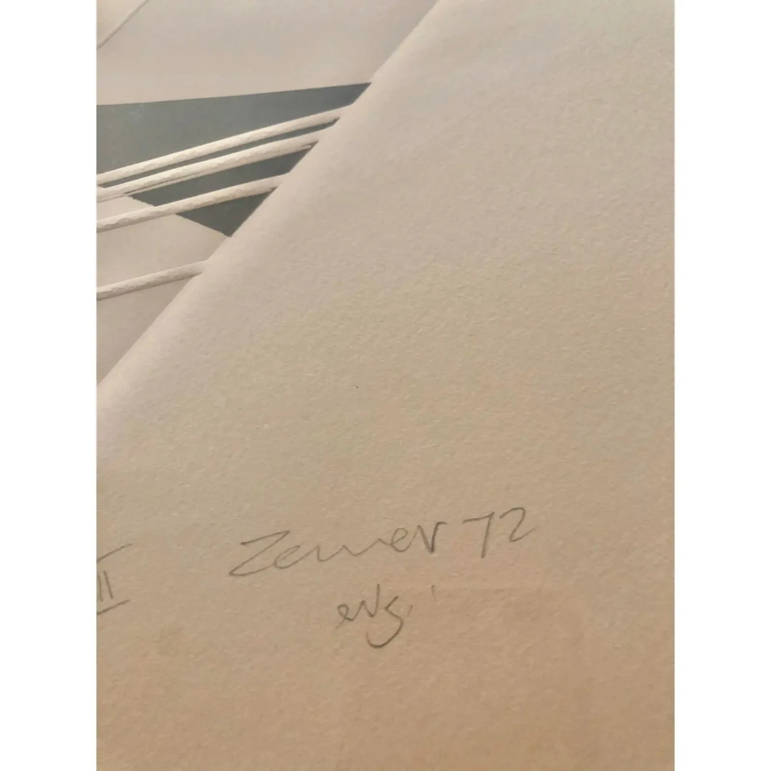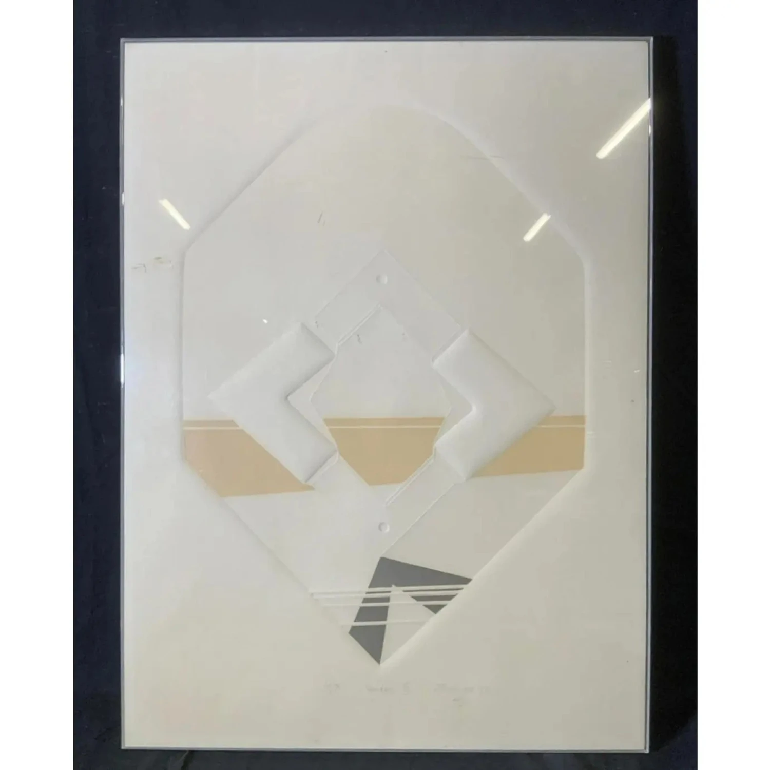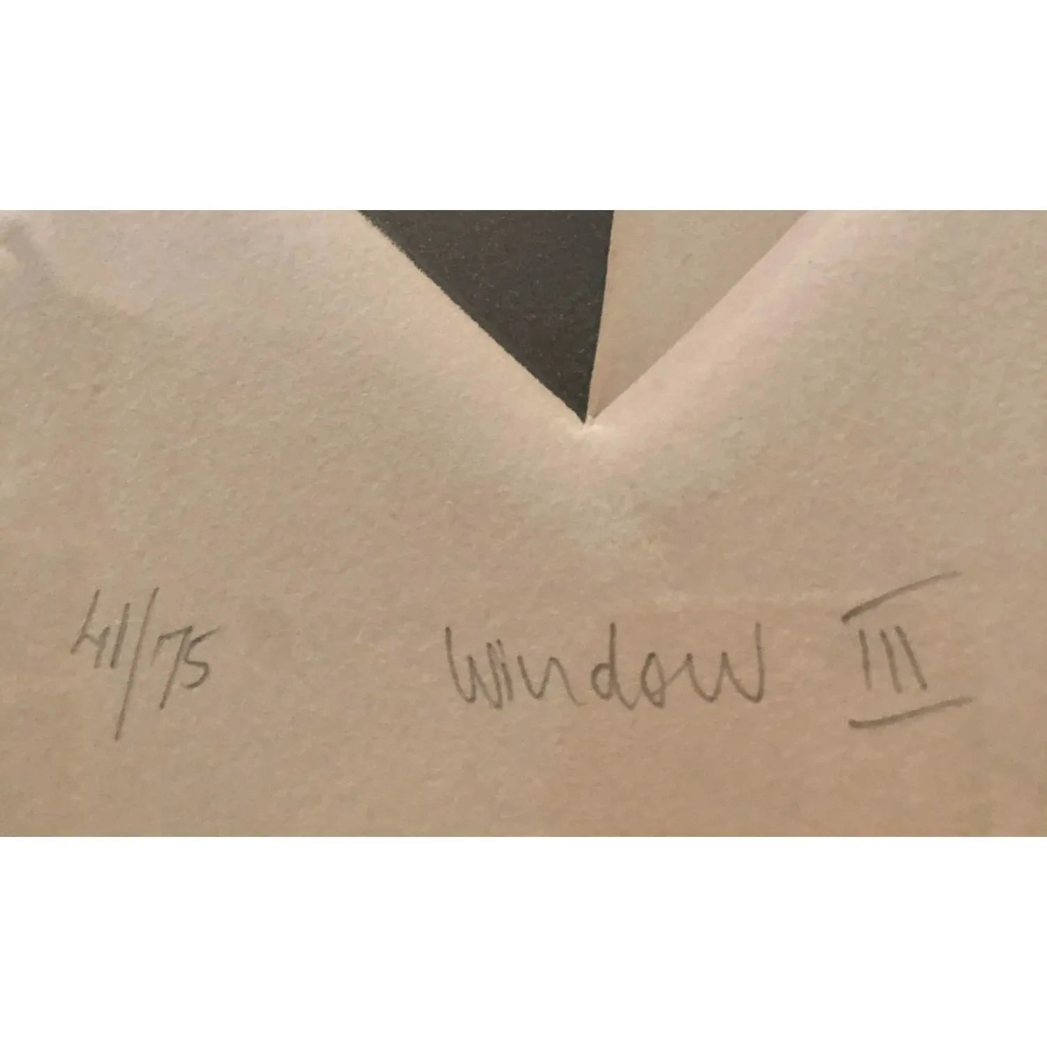 Seller’s Notes: Signed geometric abstract screen print, embossed lithograph 1972, signature to lower right reads โZEMER 72โ, other inscription illegible, edition reads โ41/75โ, other inscription reads โWindow IIIโ, label to reverse reads โThe Uptown Galleriesโ, measures approximately 29″ x 22″ inches, professionally framed, presented in acrylic box frame. Minor wear on frame. Signed YIGAL ZEMER.