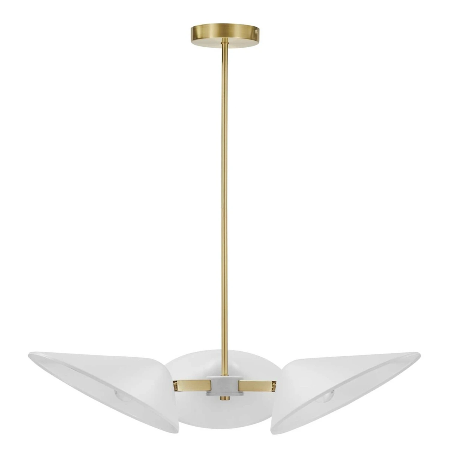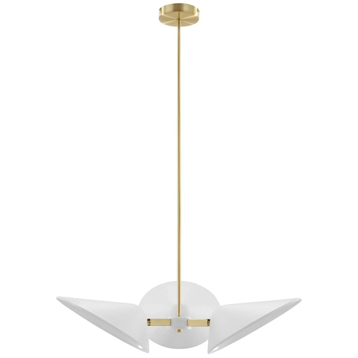 โข A satin brass ceiling canopy and height-adjustable hanging rods enhance the radiating essence of this elegant pendant light fixture.