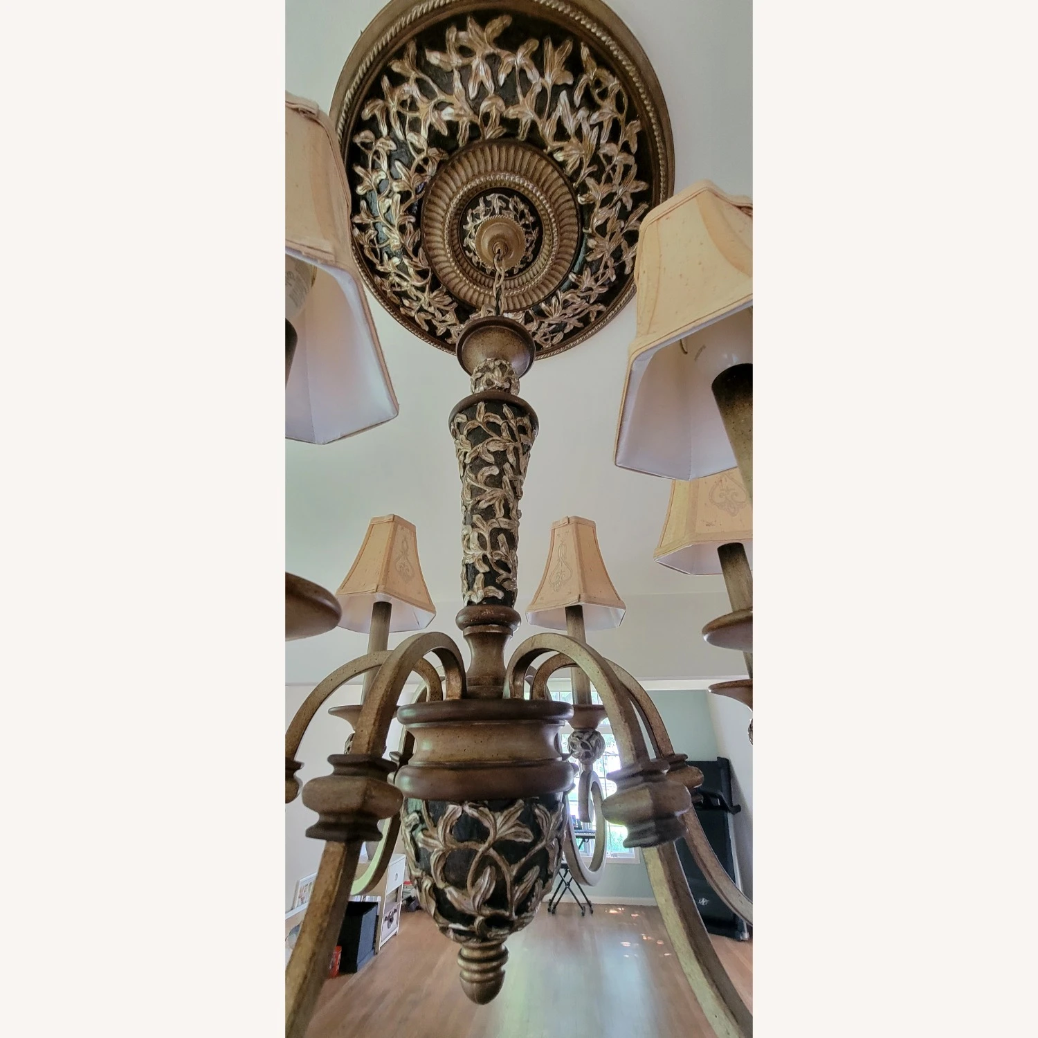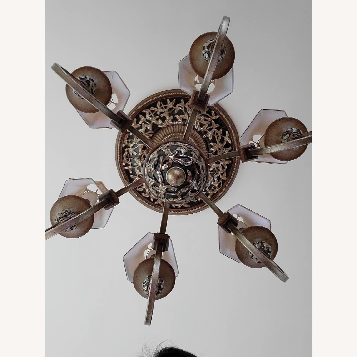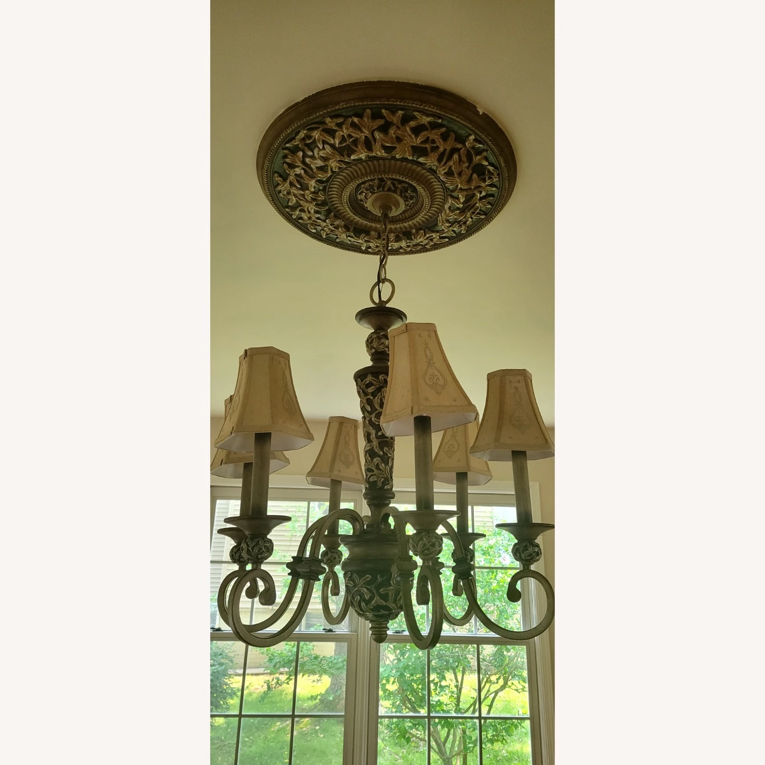 Seller’s Notes: Beautiful chandelier statement peice perfect for dining room or living room. Was used in dining room for many years. Florence patina finish with warm yellow light. Heavy and durable.