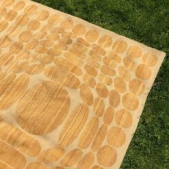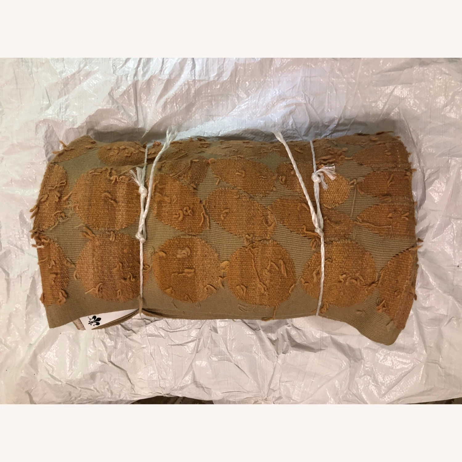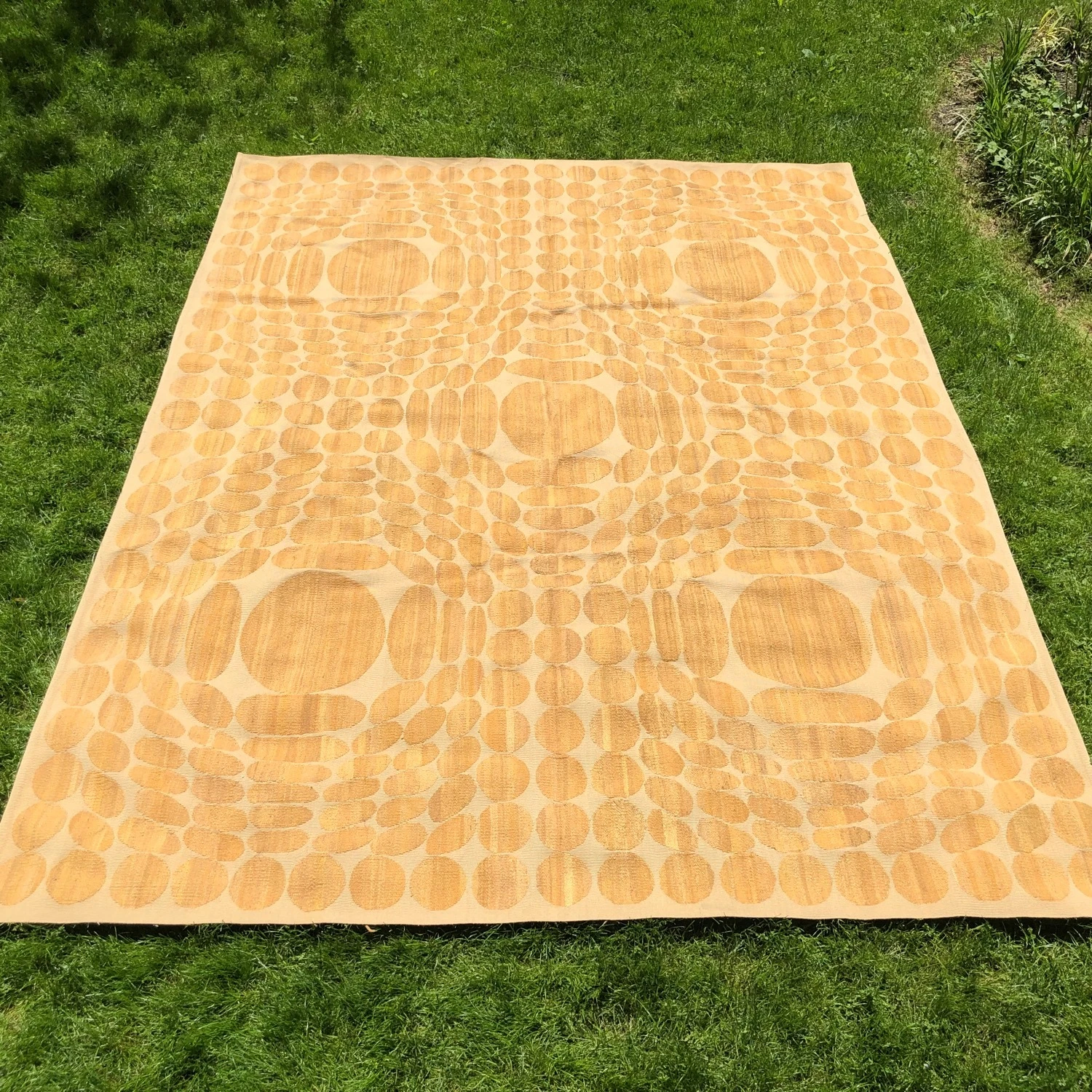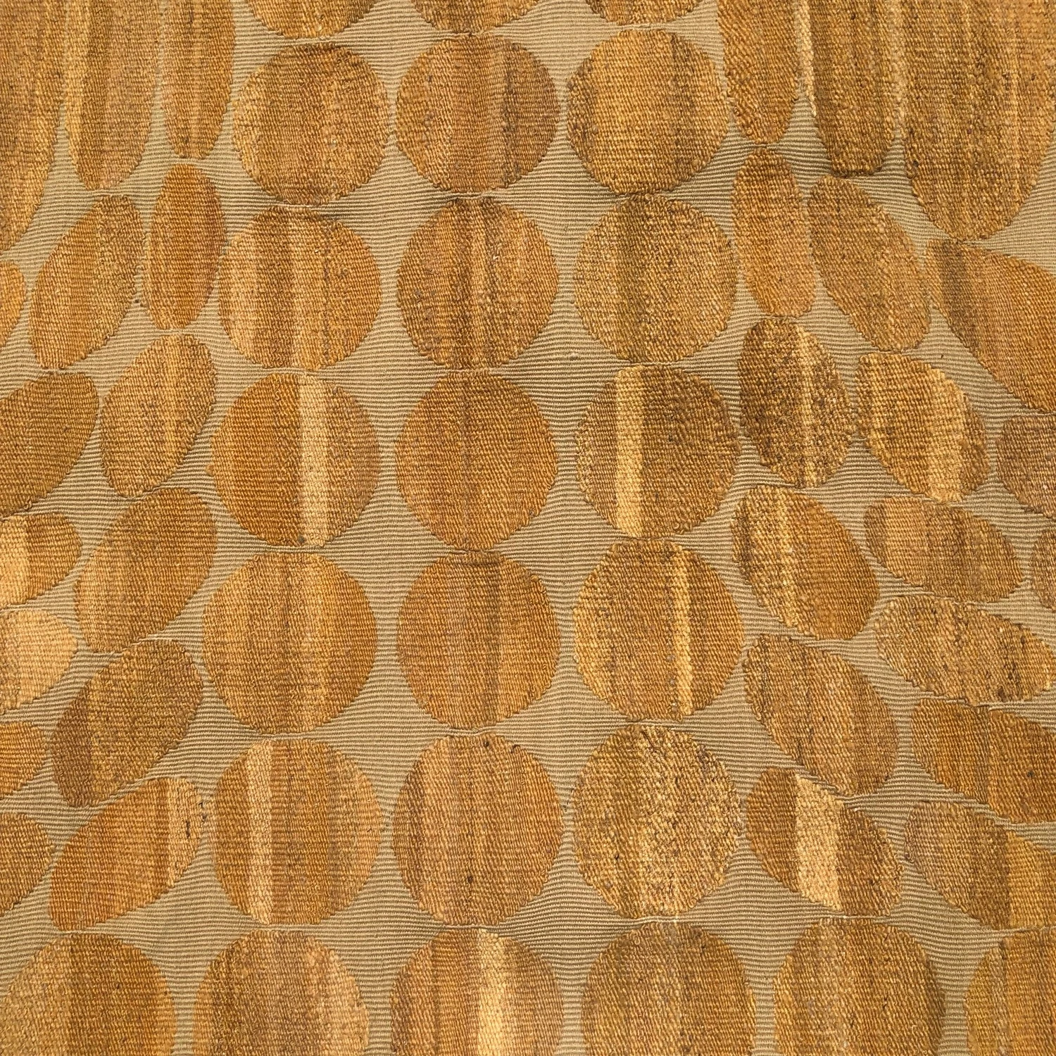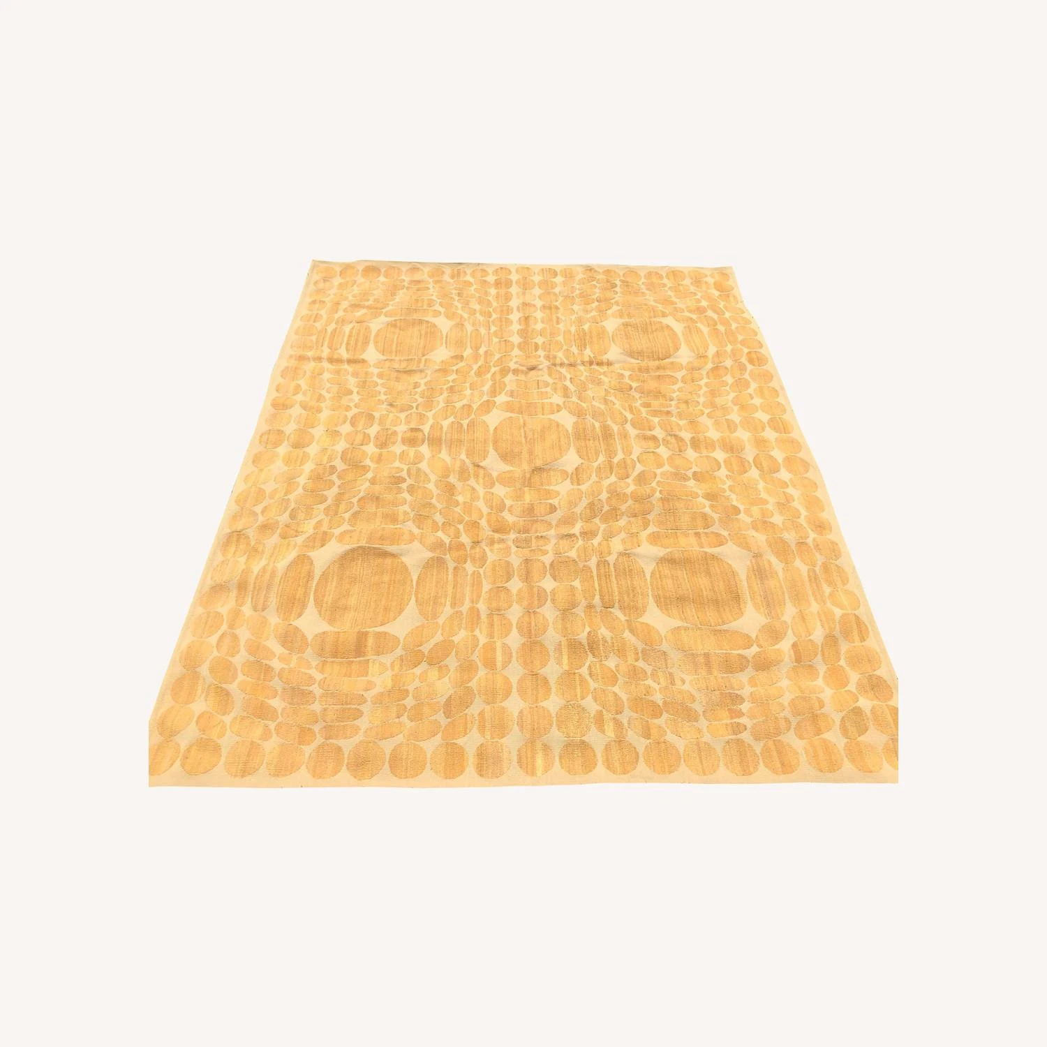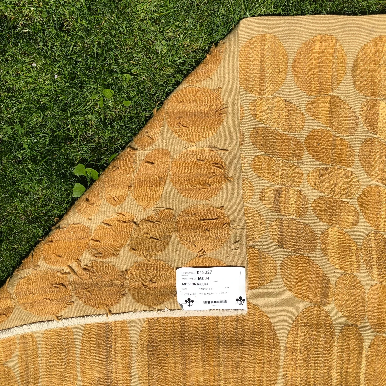 Seller’s Notes: This is a brand new handwoven kilim made of wool and silk measuring 7’10” x 10′. It has a neutral background color with a woven orange-gold pattern. It has been photographed in outdoor natural lighting, but may appear differently depending on the lighting in your home. It is definitely bright under direct lighting and darker/more orange under other conditions.