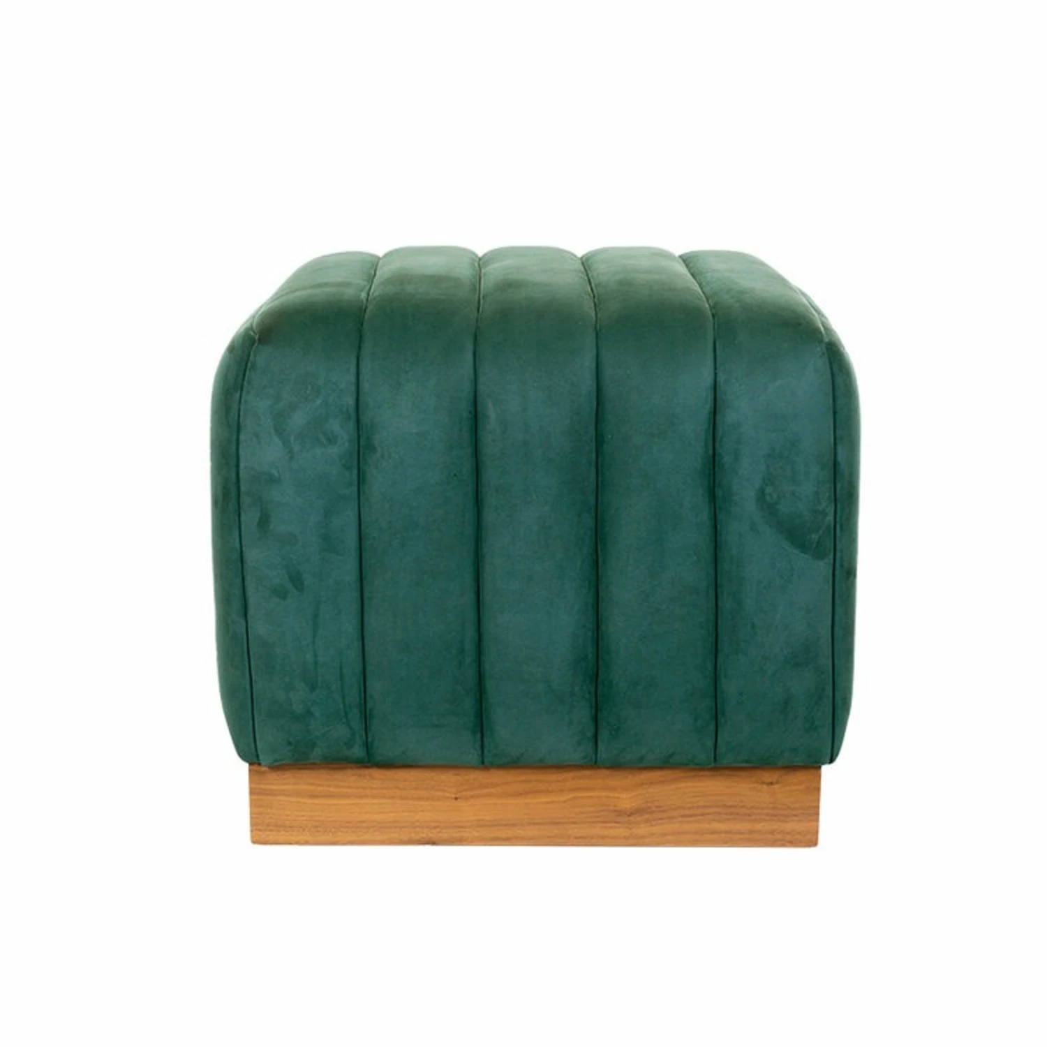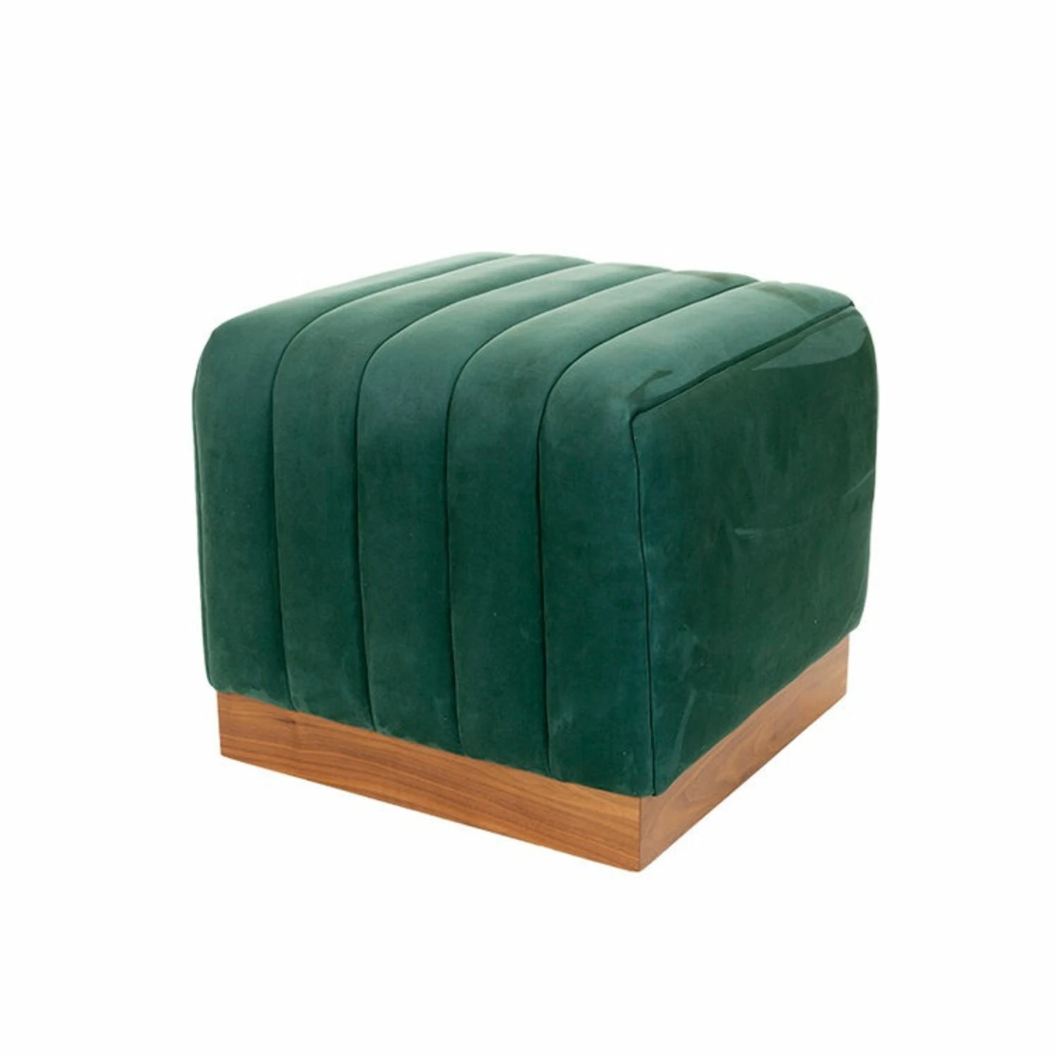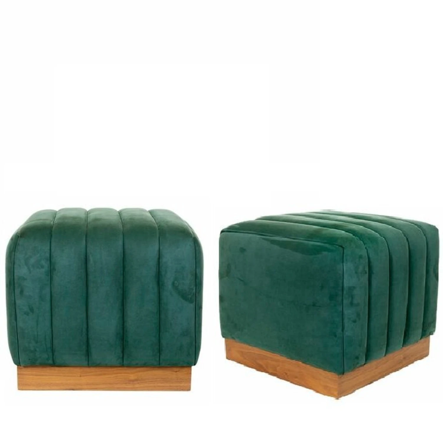 Pair of modern ottomans with a clean silhouette, narrow channel detailing, and walnut 3” base. These fully-upholstered ottomans are covered with a channel upholstered Italian nubuck leather in emerald green.