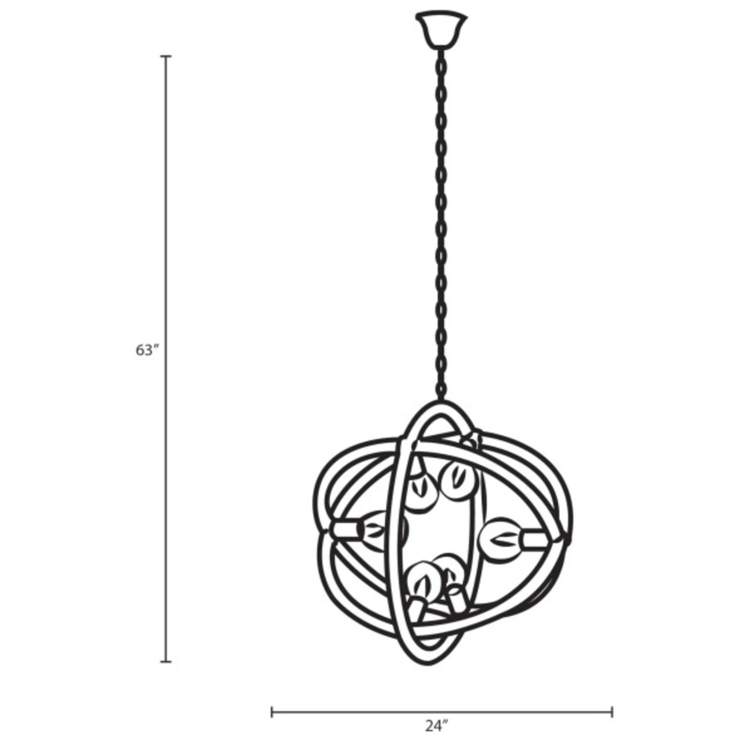 โข Enhancing dining room, living room or hallway decors, it features an elongated orb structure carefully wrapped in durable rope with six black iron metal light sockets and a height adjustable chain.