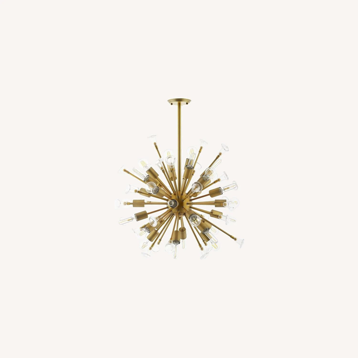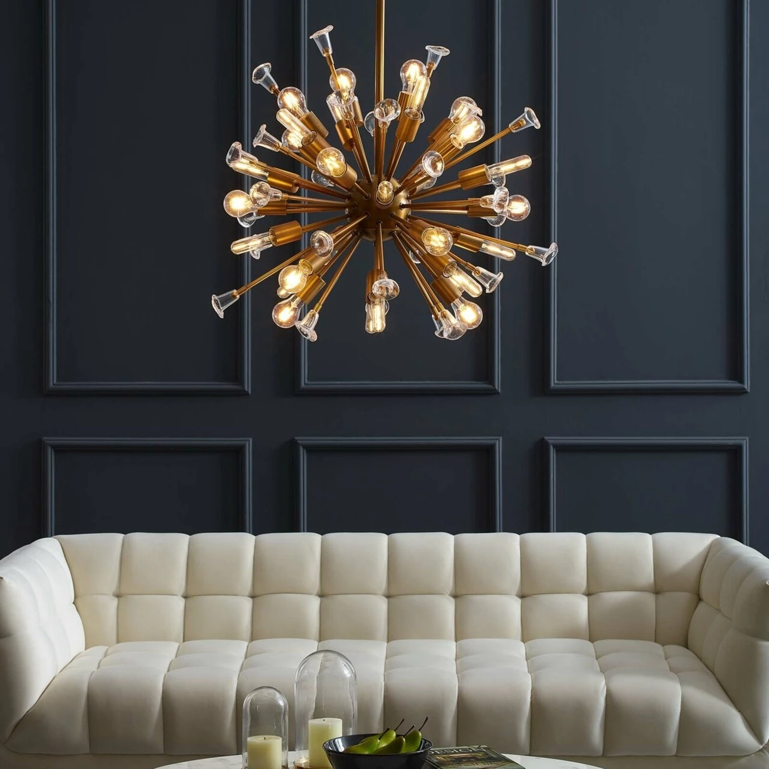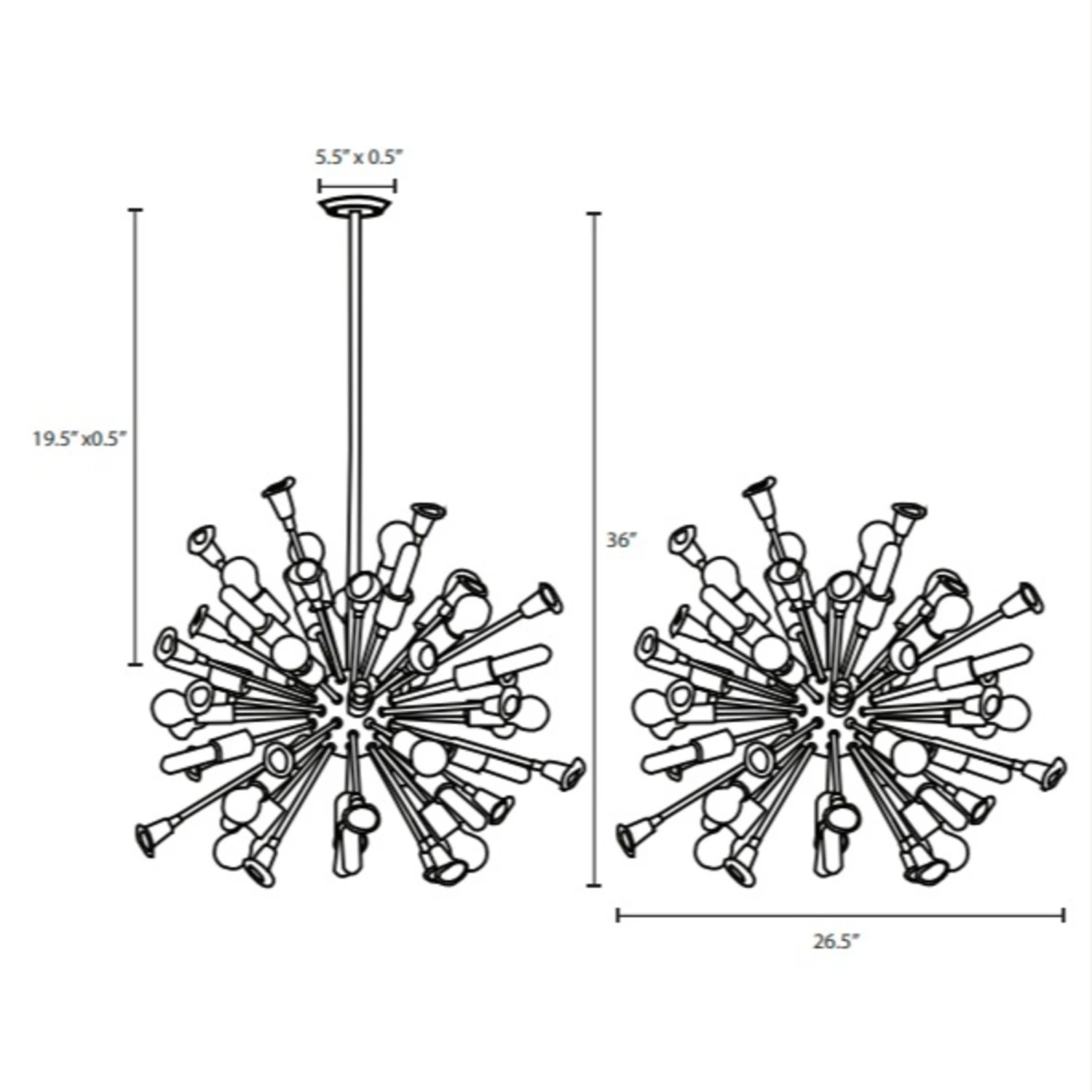 โข Dazzling guests with a unique starburst design, this pendant chandelier features an array of antique brass metal rods and sockets that shoot out from its spherical center at varying lengths.