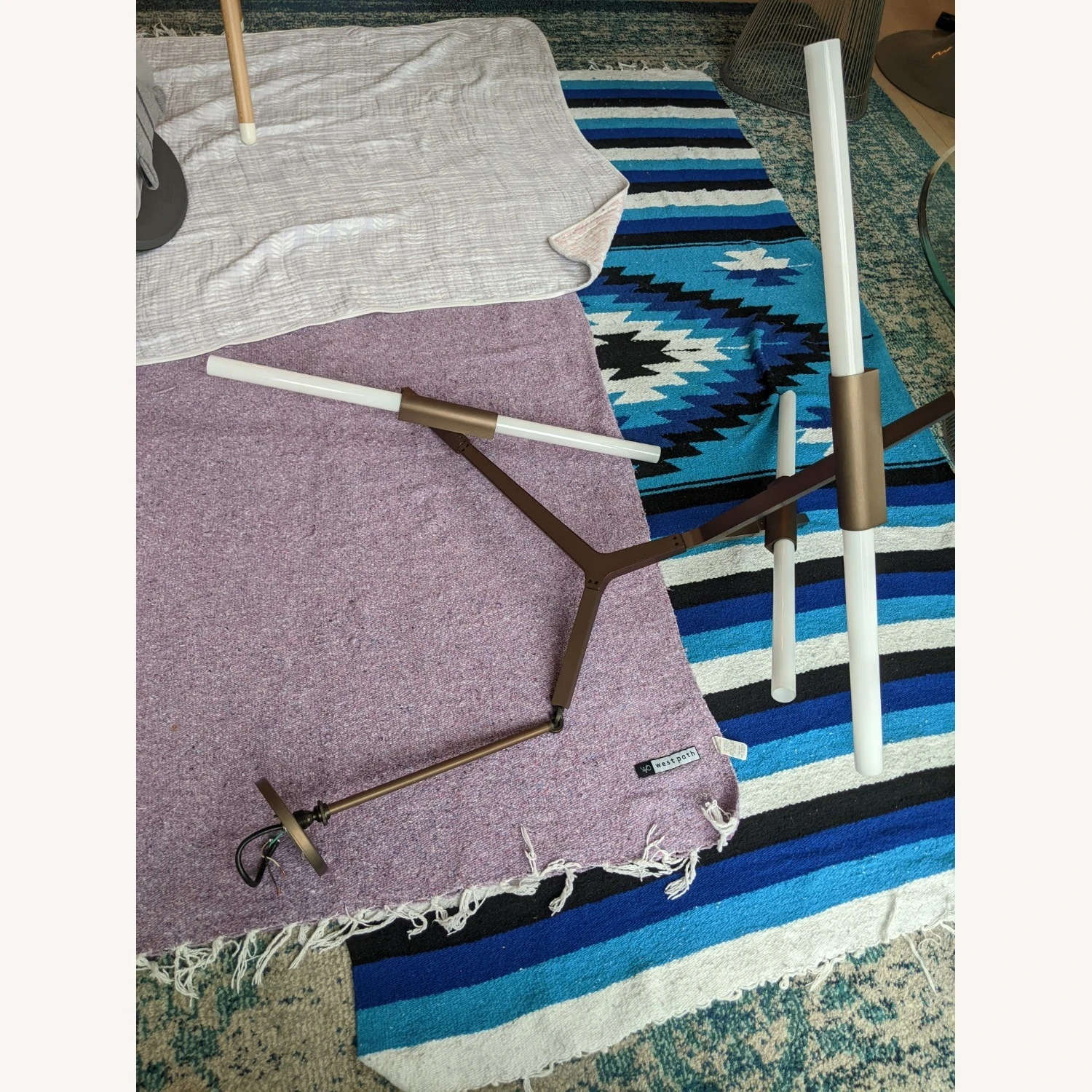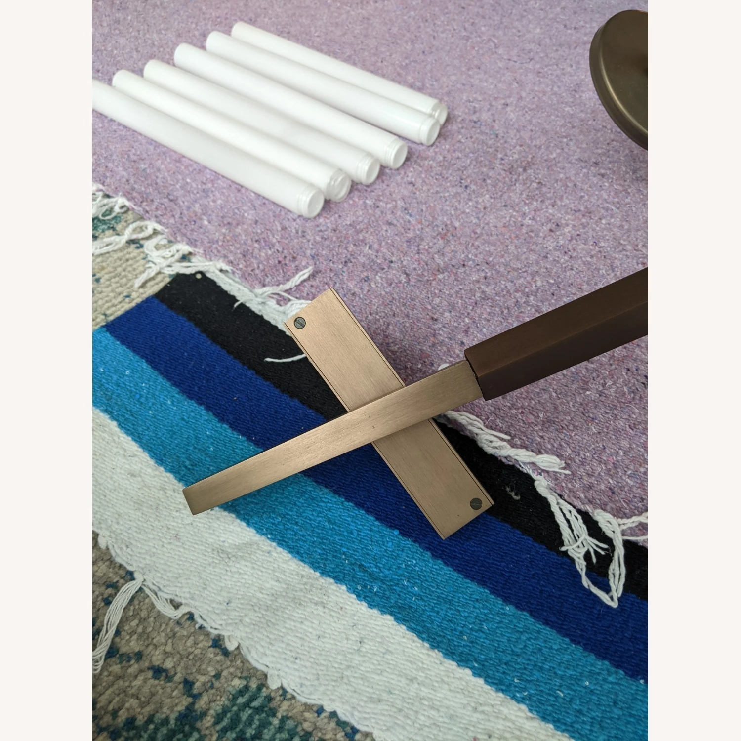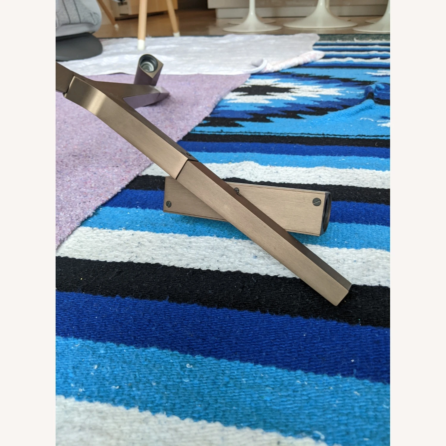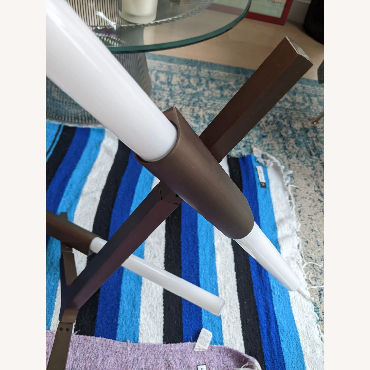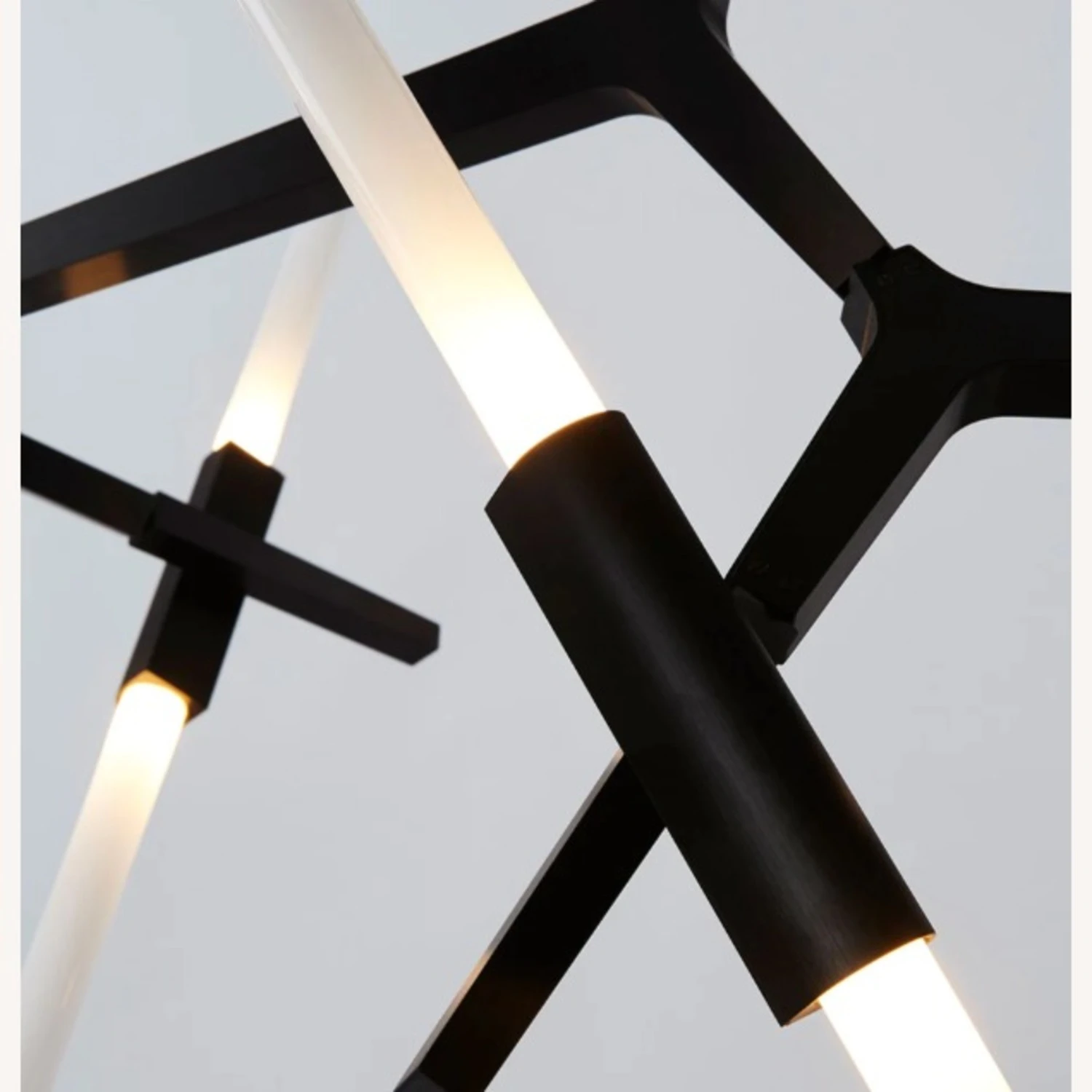 Originally conceived as a candelabra, Agnes takes its inspiration from the fictional heroine of the same name, a worker in the world’s oldest profession during the 1849 California Gold Rush. The modular system would allow Agnes easy setup in her makeshift “workspace.” In this version, glowing glass tubes replace the candles. Articulated joints allow the glass to be arranged in a multitude of ways.
