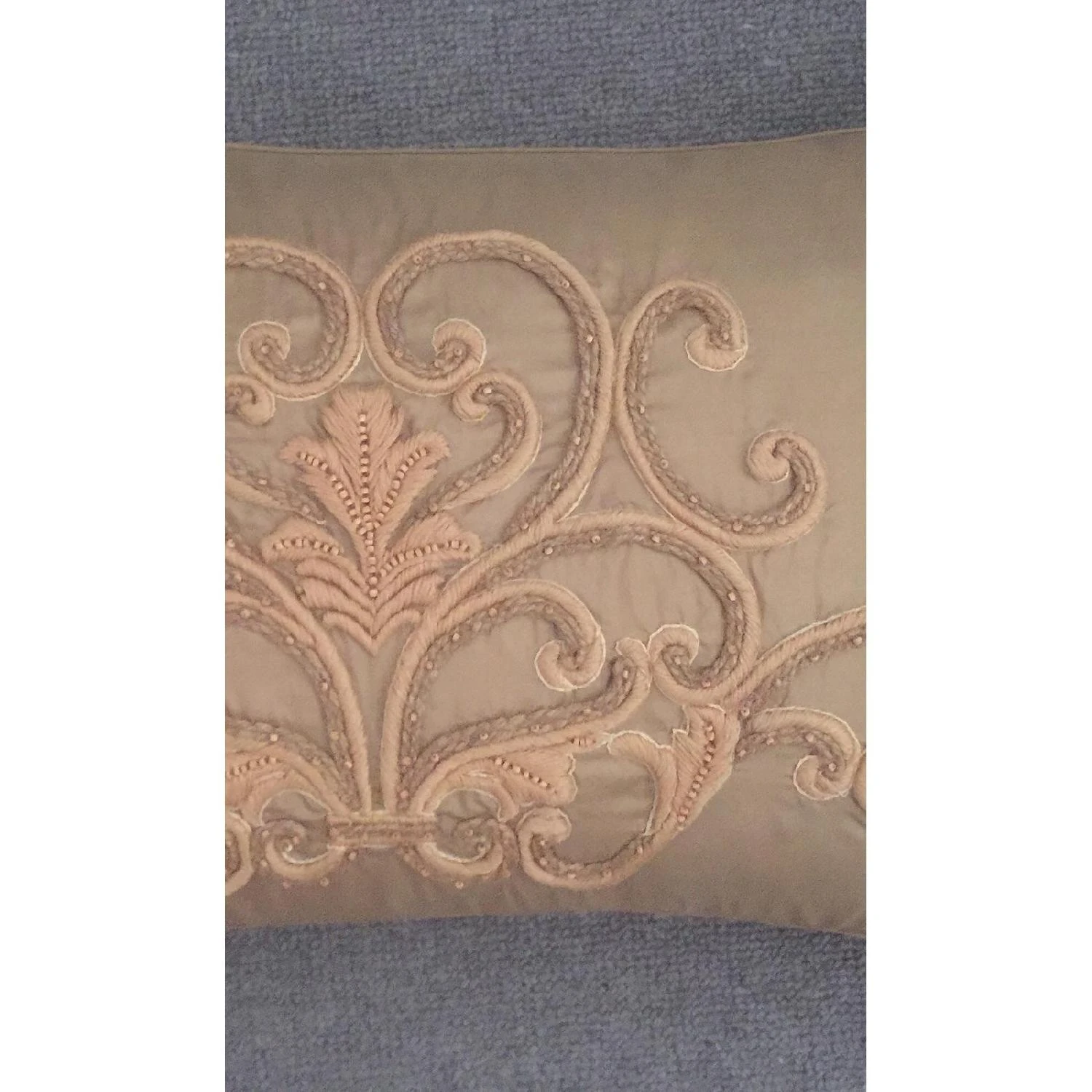 Seller’s Notes: The embellish embroidery in this pillow is a combination of new and Old World embroidery techniques. The three-dimensional embroidery combined with a linen cord and miniature wooden beads bring a sense of current style to create a unique elegant piece for the home.