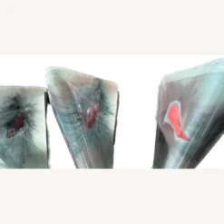 Seller’s Notes: Used Sconces ( wall mount lights) triangular custom hand made thick glass bent to unique shape. , custom fabricated rustic rocky style upper edge. Custom hand discolor ,torched and painted glass sides to represent burning effects , one of the sconces has a crack, please see picture 5. still holds in but have to be extra careful when handling this or mounting. once its hung high on the wall that crack may not be seen, .. selling as is. This get regular round 110V bulb . Selling as set of 4 because these are unique to each other and I don’t want to split the set! You can pickup from me or we can ship this set in the box via UPS or Fedex ! Oh, and I do have more pictures, please ask.