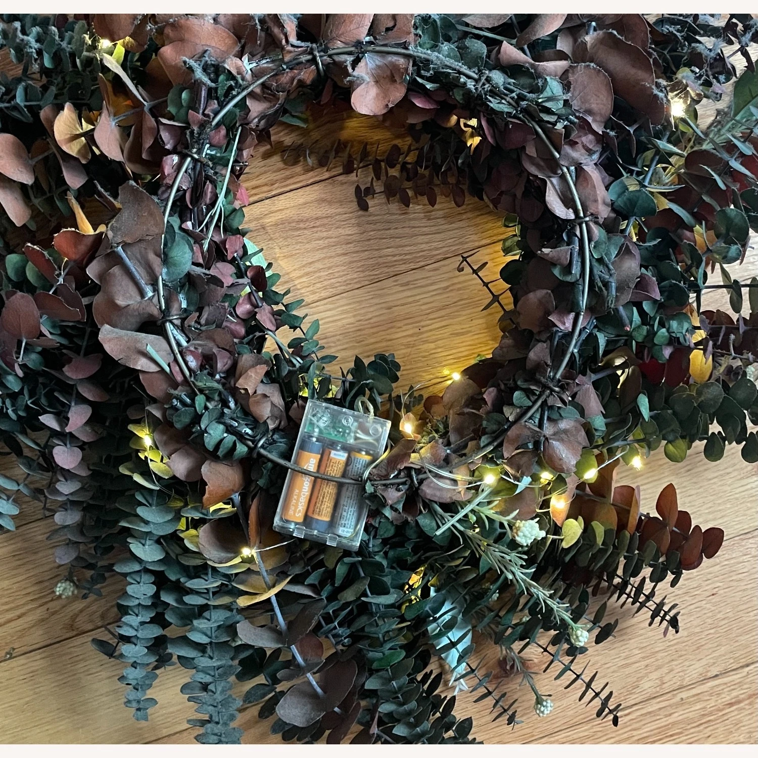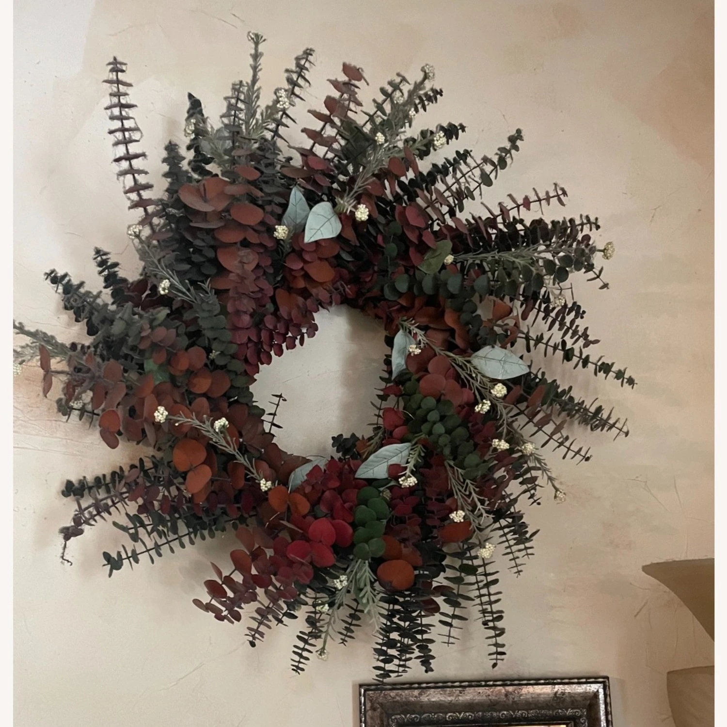 Seller’s Notes: Very nice faux foliage wreath. Primarily eucalyptus with additional foliage variation. Embedded fairy lights with 3 settings (On/Off/Timer) Unique and well-built on a solid metal frame. Light and easy to transport from upper Manhattan one block from the C (Save us both some money and just pick it up yourself). Quite sturdy – a nice imitation piece that will last a very long time with minimal care.