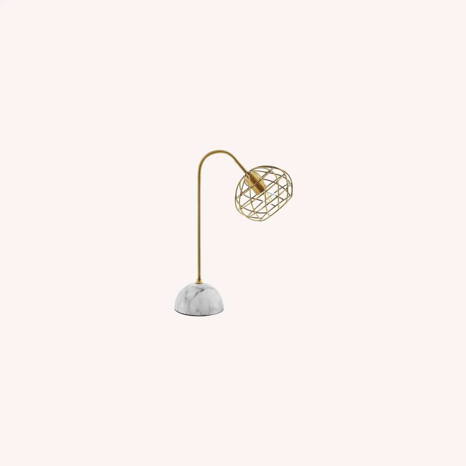 • Boasting a chic contemporary style, the faux white marble base and brass metal wire shade combine to create a glamorously unique table lamp.