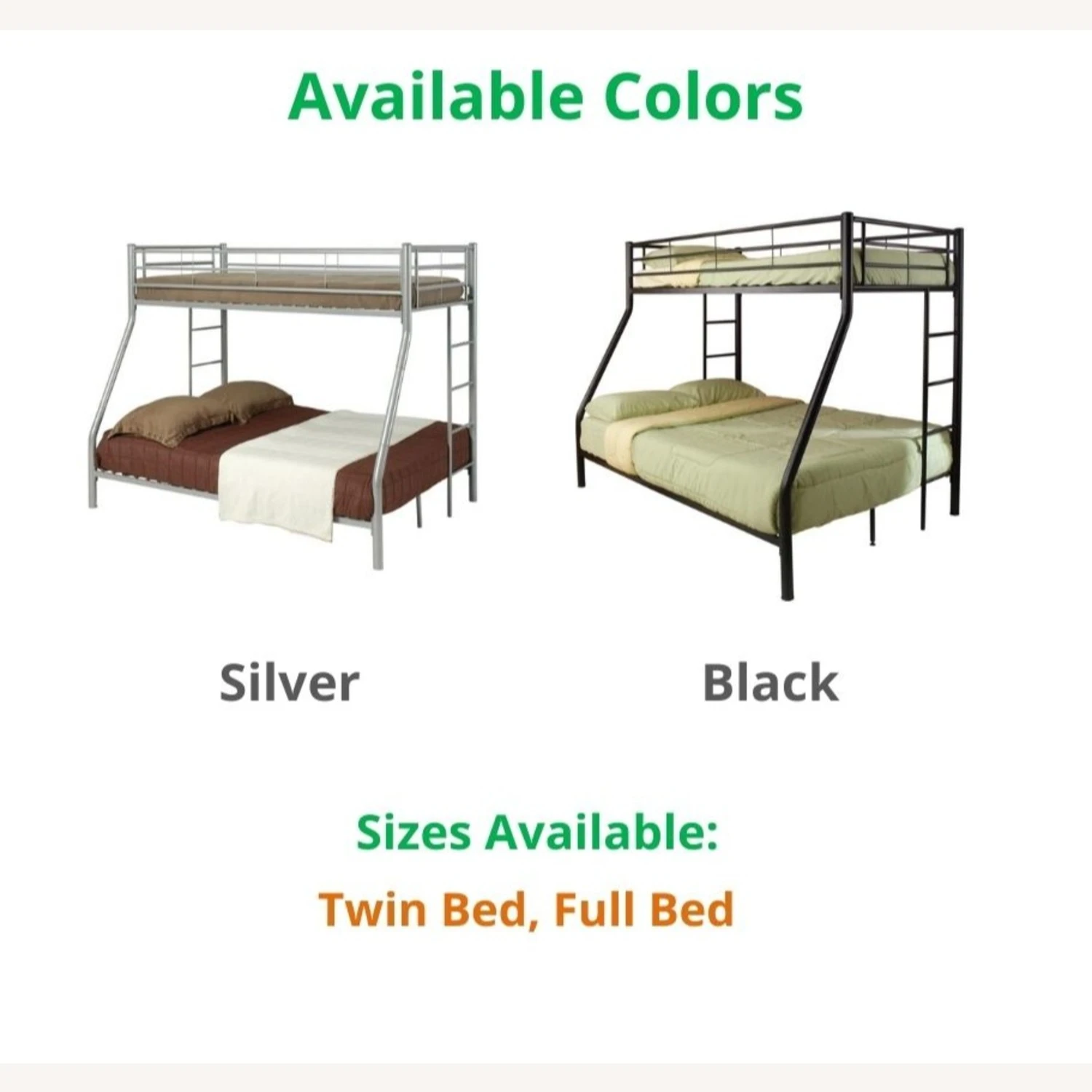 This model comes in these SILVER and BLACK, and these sizes: TWIN and FULL. If you are interested in a color/size other than that of this listing, and if the quantity you wish to purchase is greater than what is listed here, please message us for availability.