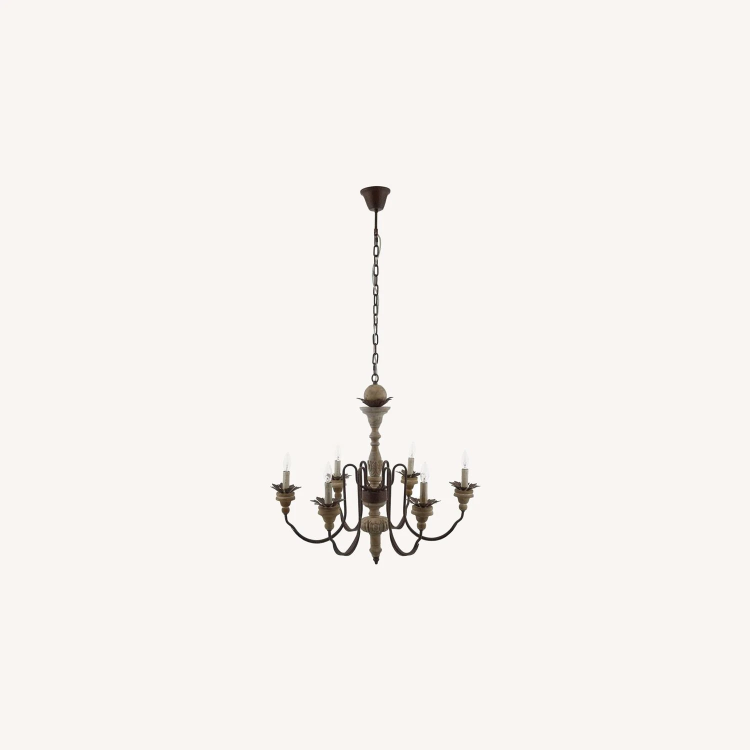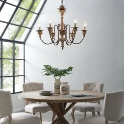 โข A vibrant addition to your living room, bedroom, foyer, or dining room, this modern farmhouse pendant light candelabra chandelier features sweeping metal arms, a beautifully carved natural wood center column, and candle-style light holders each surrounded by an ornate leaf design.
