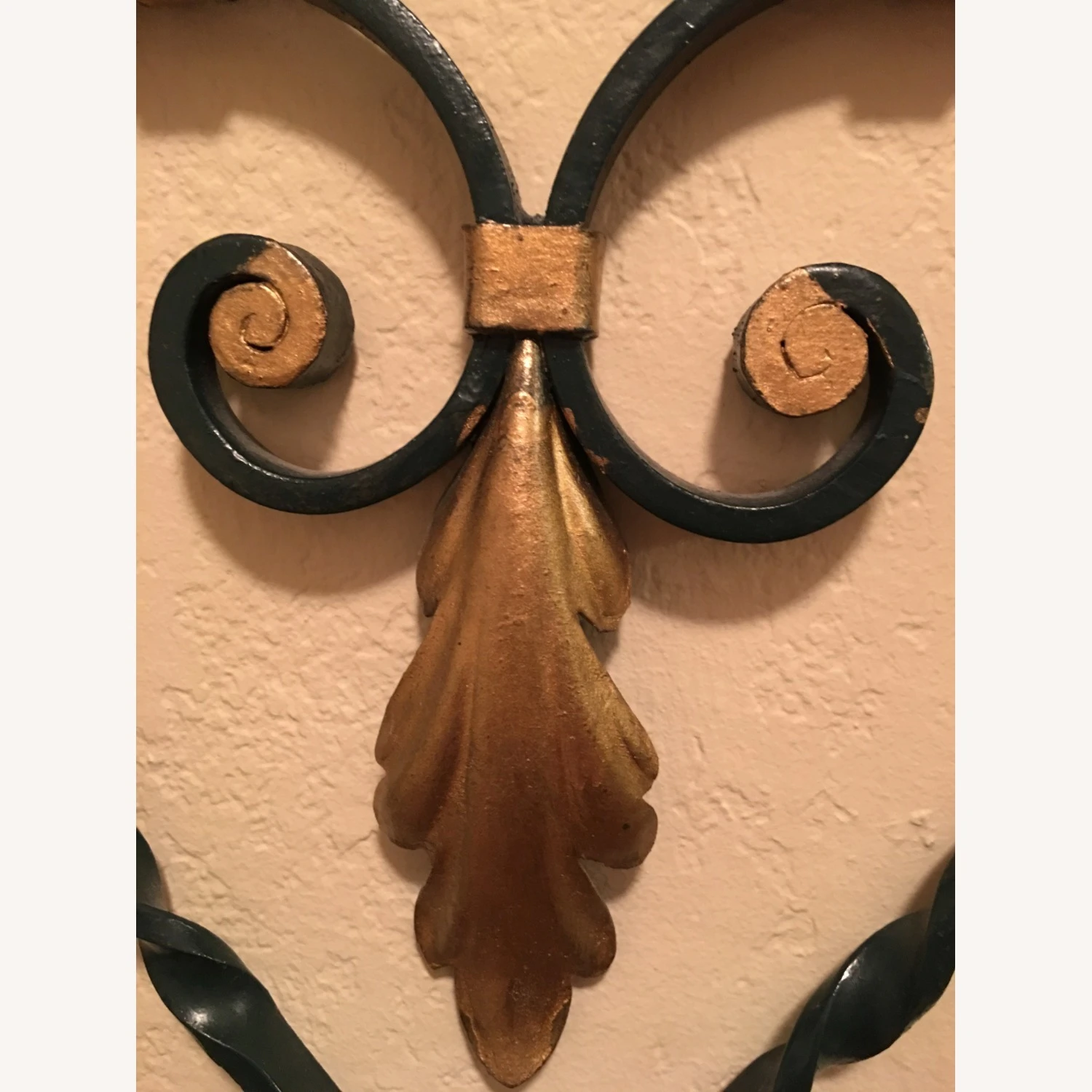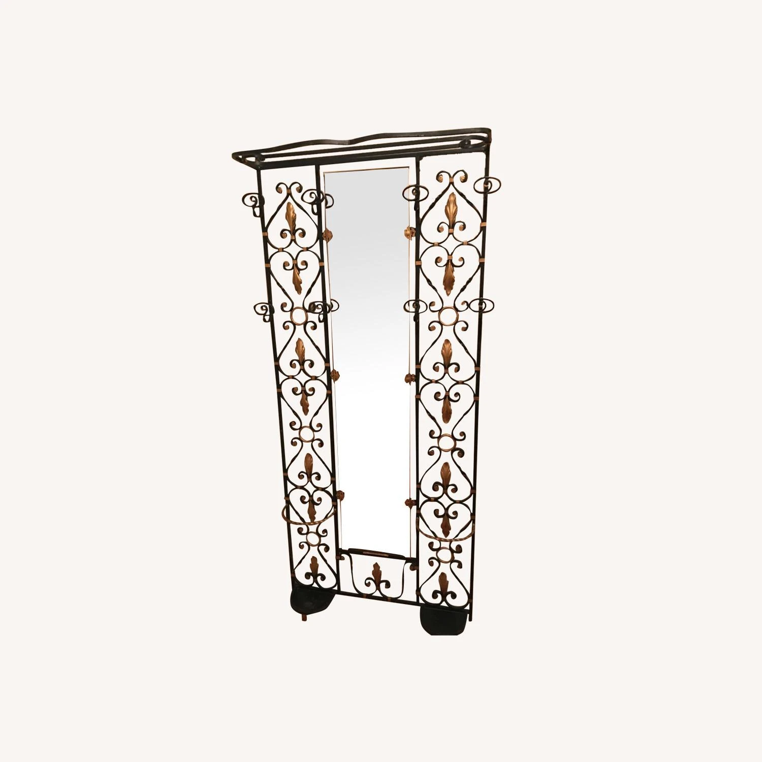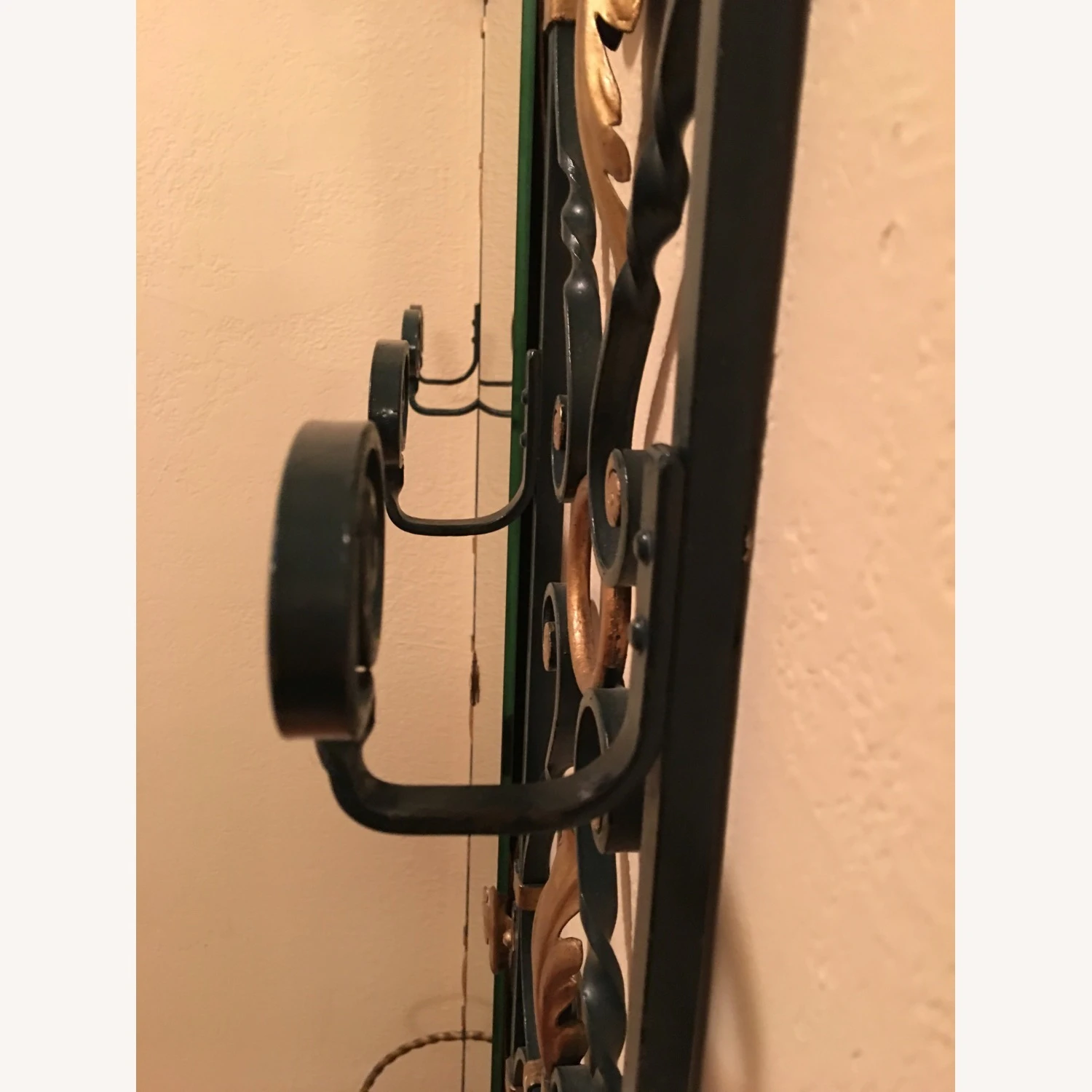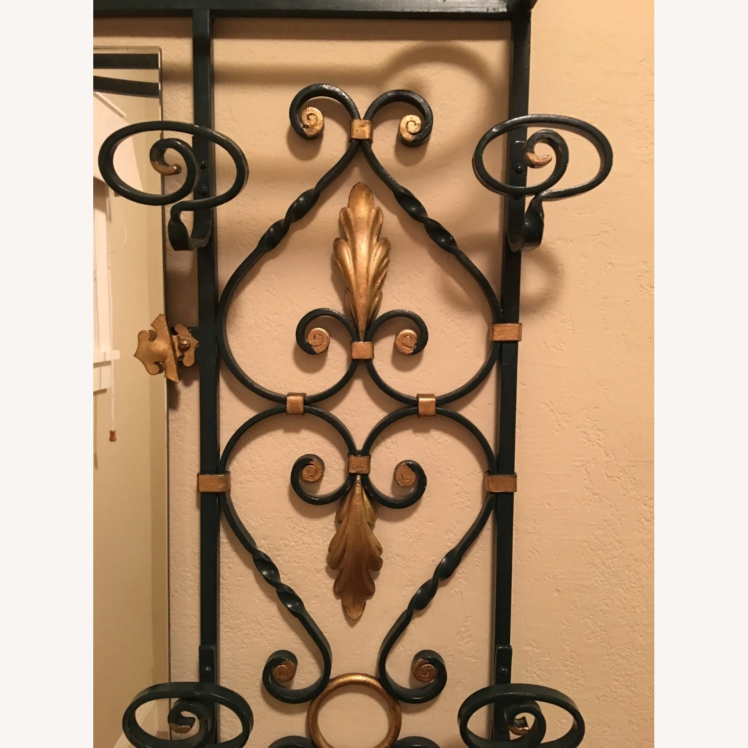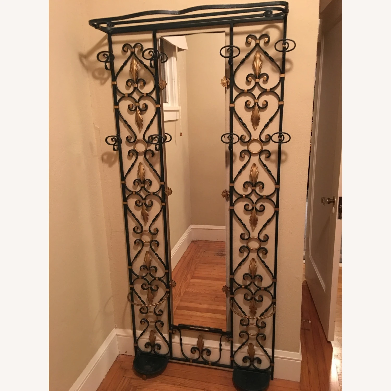Seller’s Notes: This vintage wrought iron hall tree, both elegant and practical, measures 71” x 32” x 9.5” deep. With its classic Hollywood Regency style, it makes a stunning addition to an entrance or hallway. I bought it at an antique store that specialized in importing antiques from France. It’s painted forest green and gold, with: