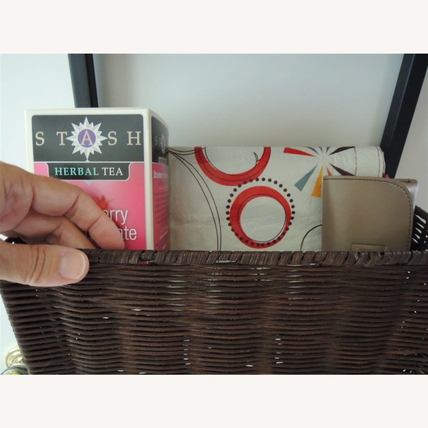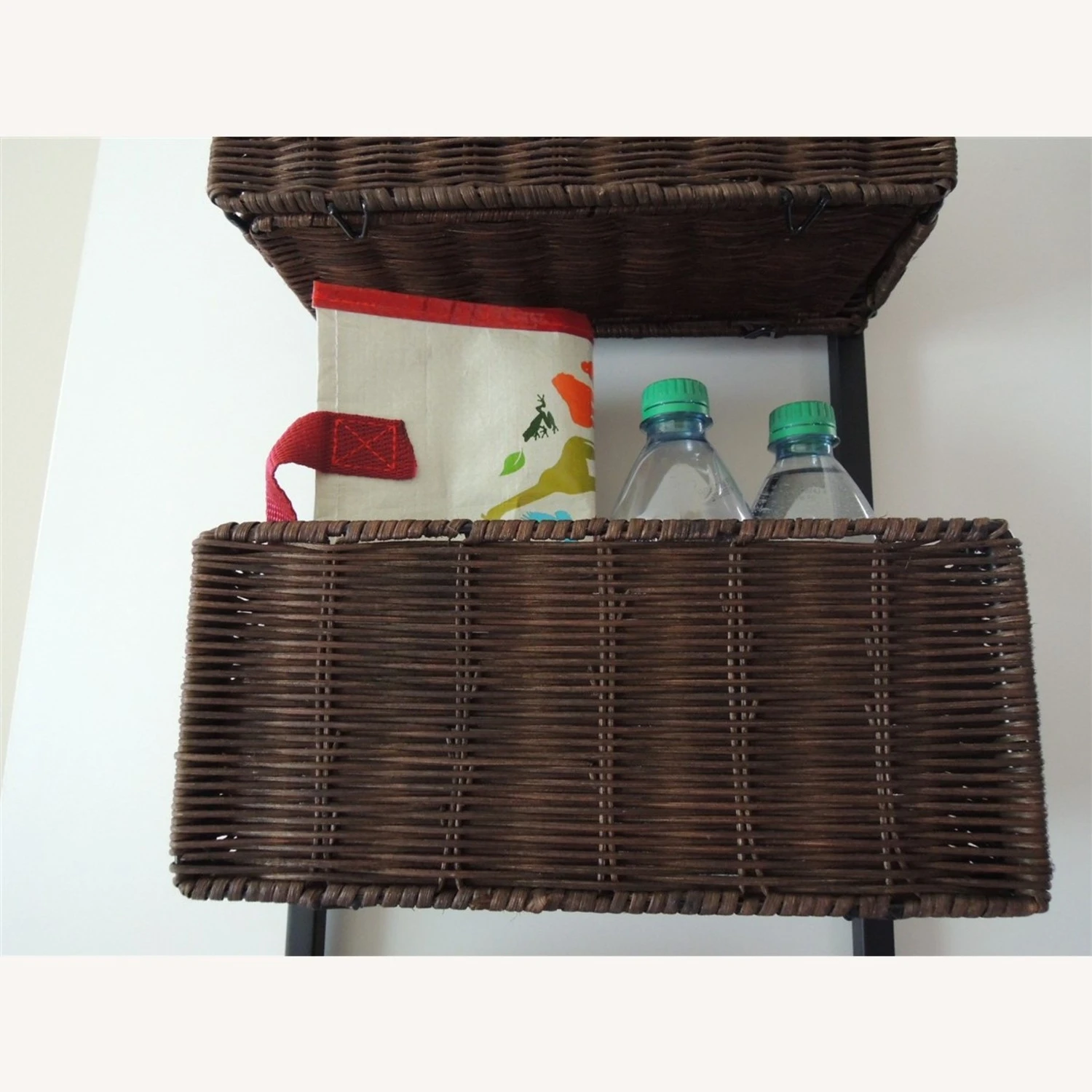 – 3 tight woven brown wicker/rattan storage baskets sit on black wrought iron rack
