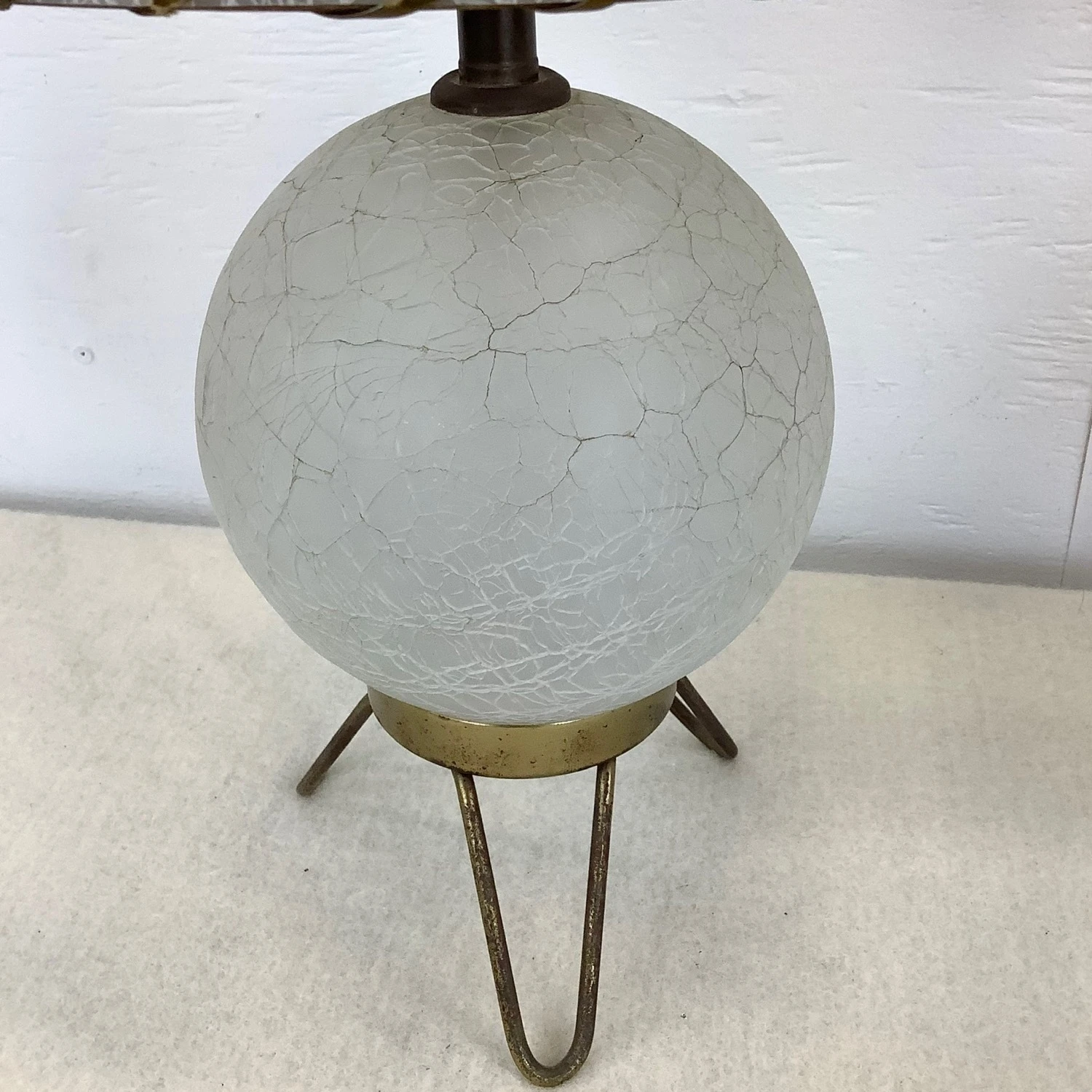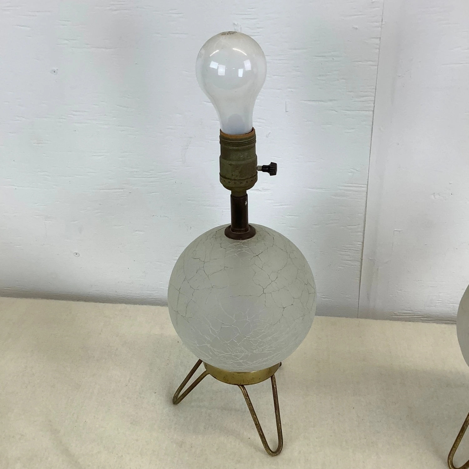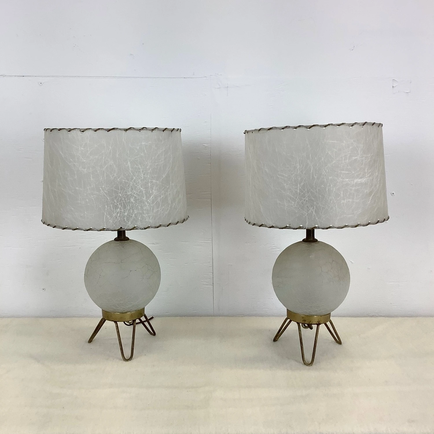 Seller’s Notes: This striking pair of mid-century modern table lamps feature unique crackled glass ball design set on brass hairpin legs and topped with unique skin style shades. The delicate matching pair make an impressive addition for their small size, an elegant mid-century accent to any interior.