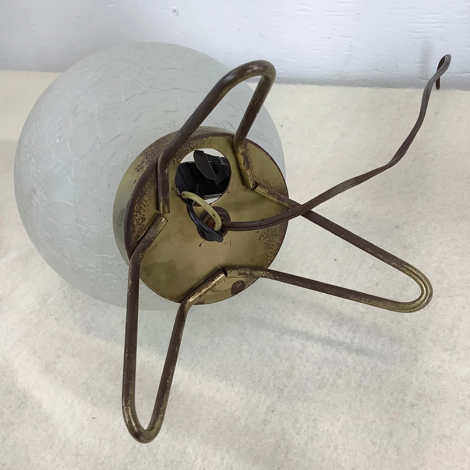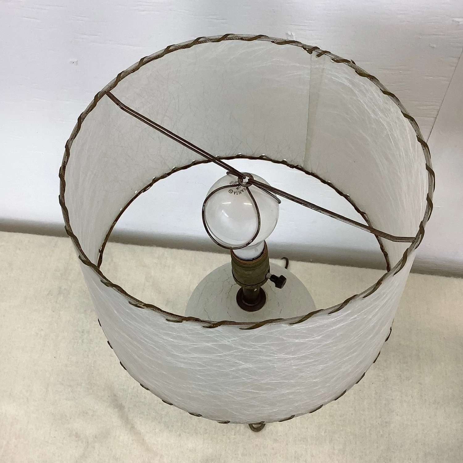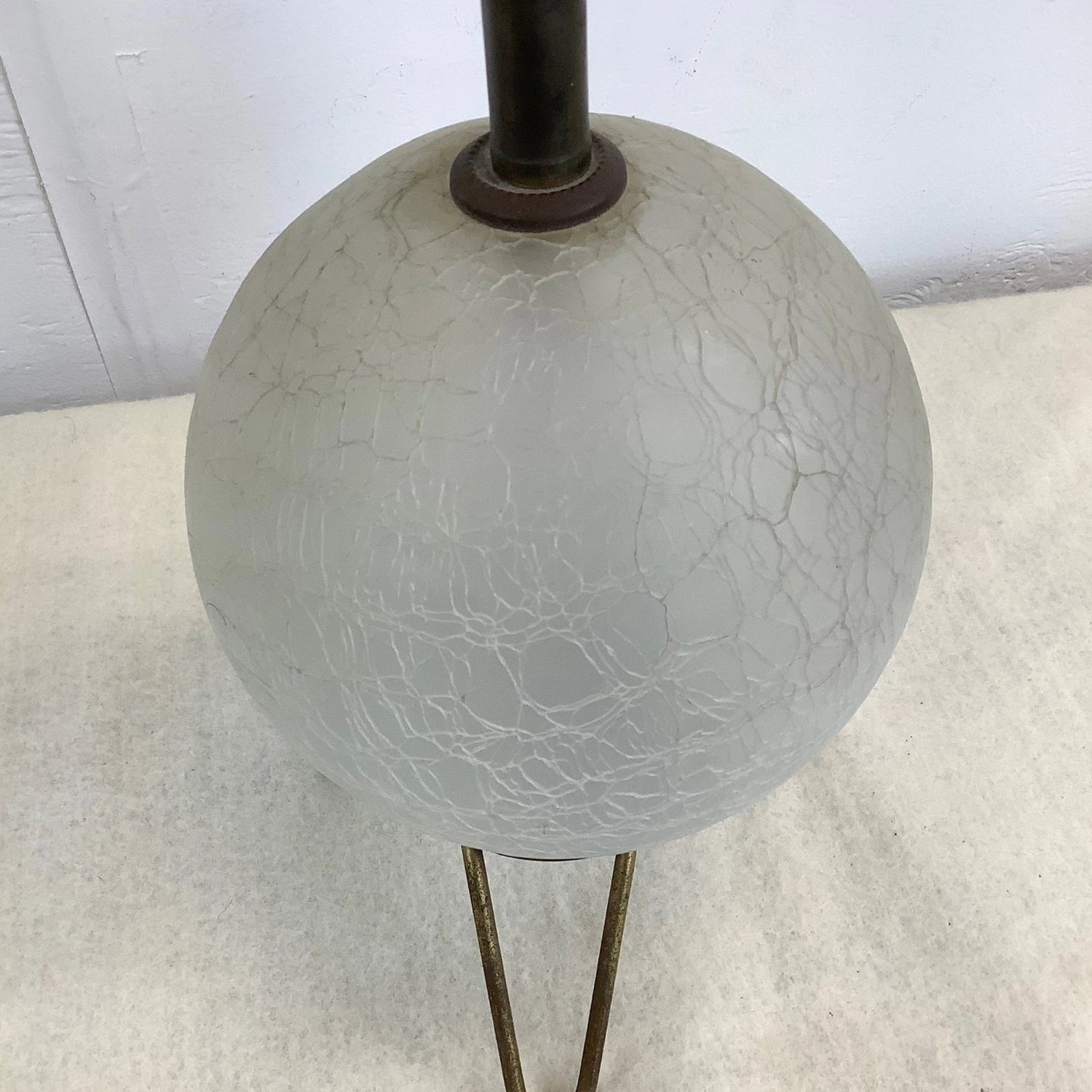 Seller’s Notes: This striking pair of mid-century modern table lamps feature unique crackled glass ball design set on brass hairpin legs and topped with unique skin style shades. The delicate matching pair make an impressive addition for their small size, an elegant mid-century accent to any interior.