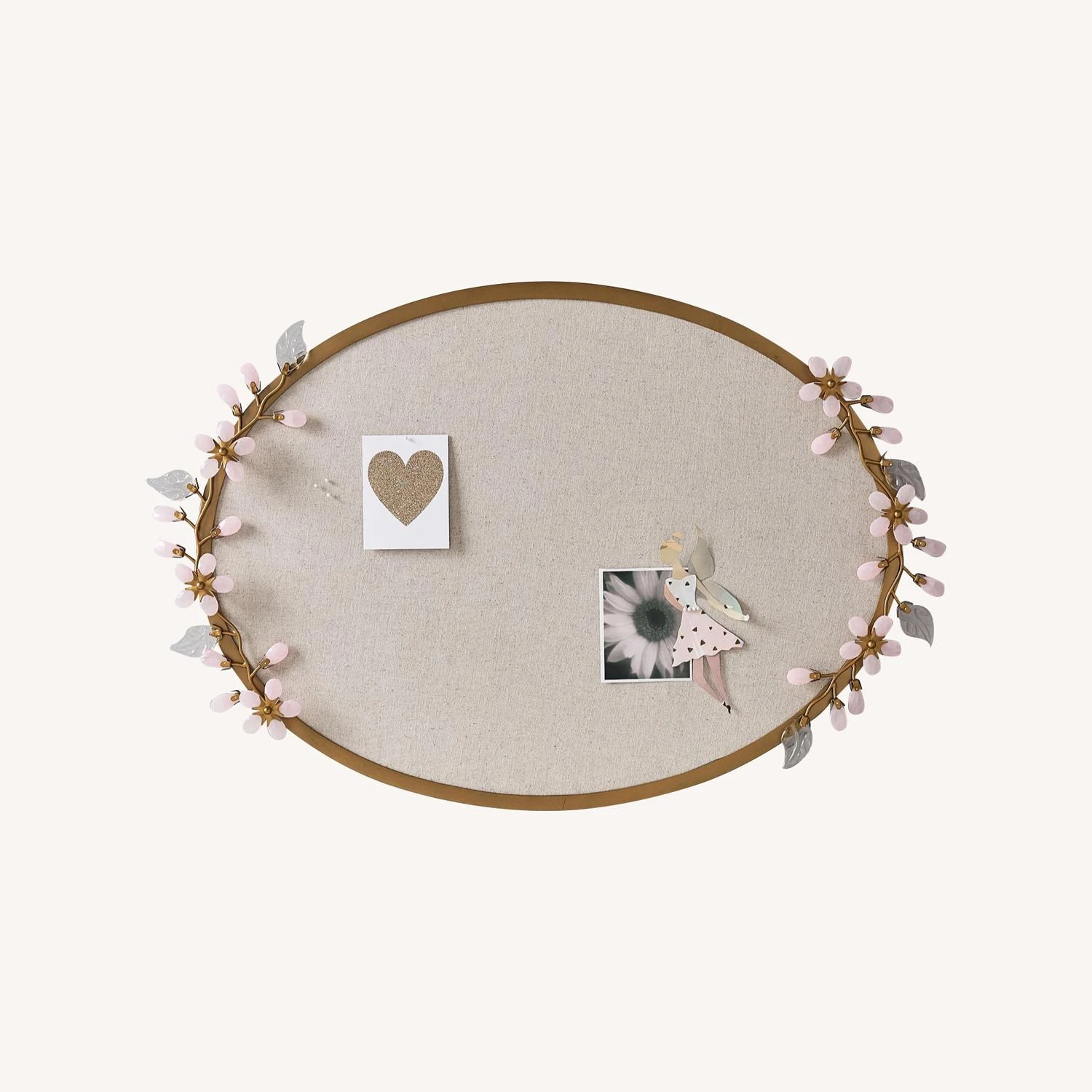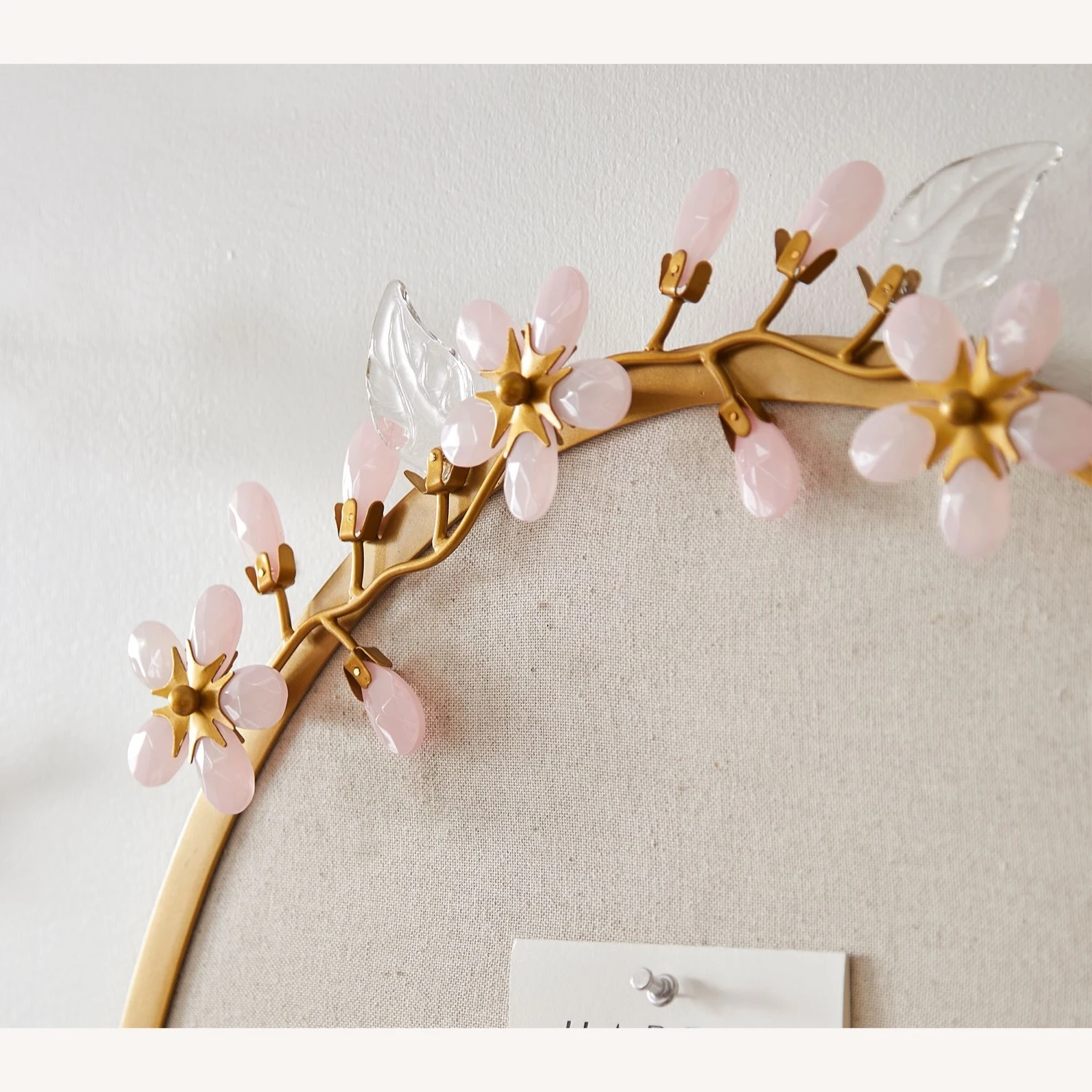 Seller’s Notes: This generously sized round pinboard combines functionality with whimsical design for an easy update to their room. Scrolling vines with pink flowers and glass leaves surround the frame, giving them a fanciful place to keep notes, artwork and photos.