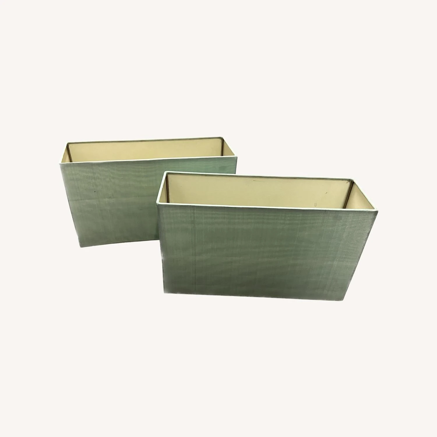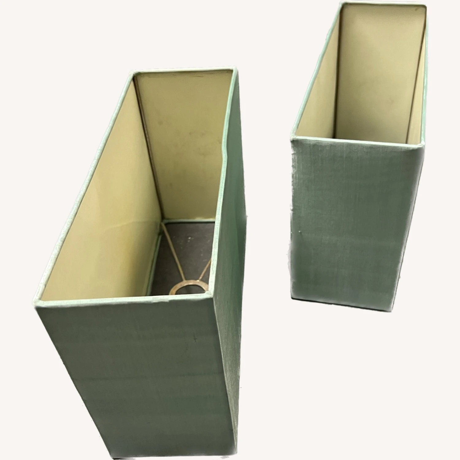 Seller’s Notes: This lovely pair seafoam/shagreen colored silk lampshades is eager to perch on your bedside tables or living room side table. Please note that there is a slight bend in the frame of one which is visible in the photos.