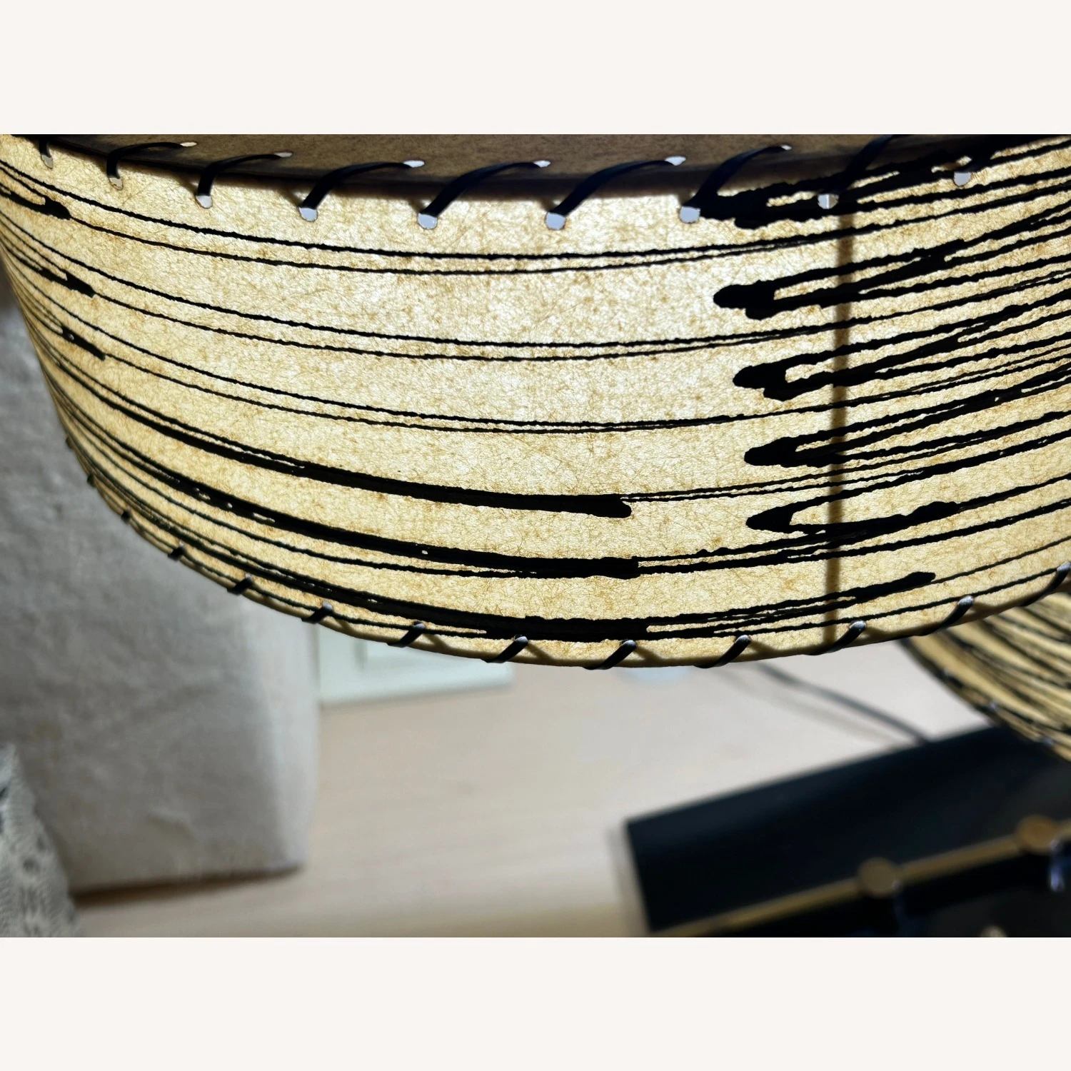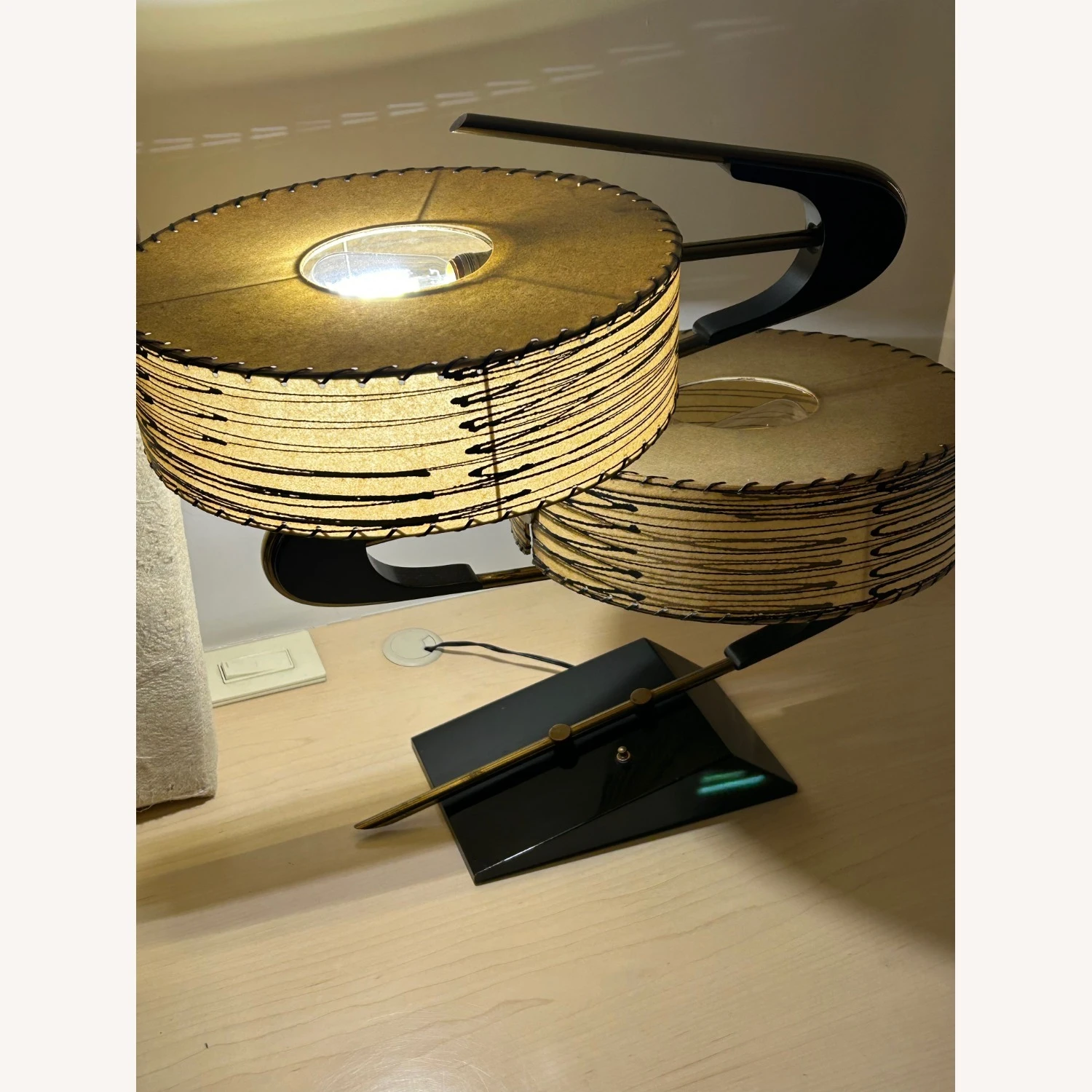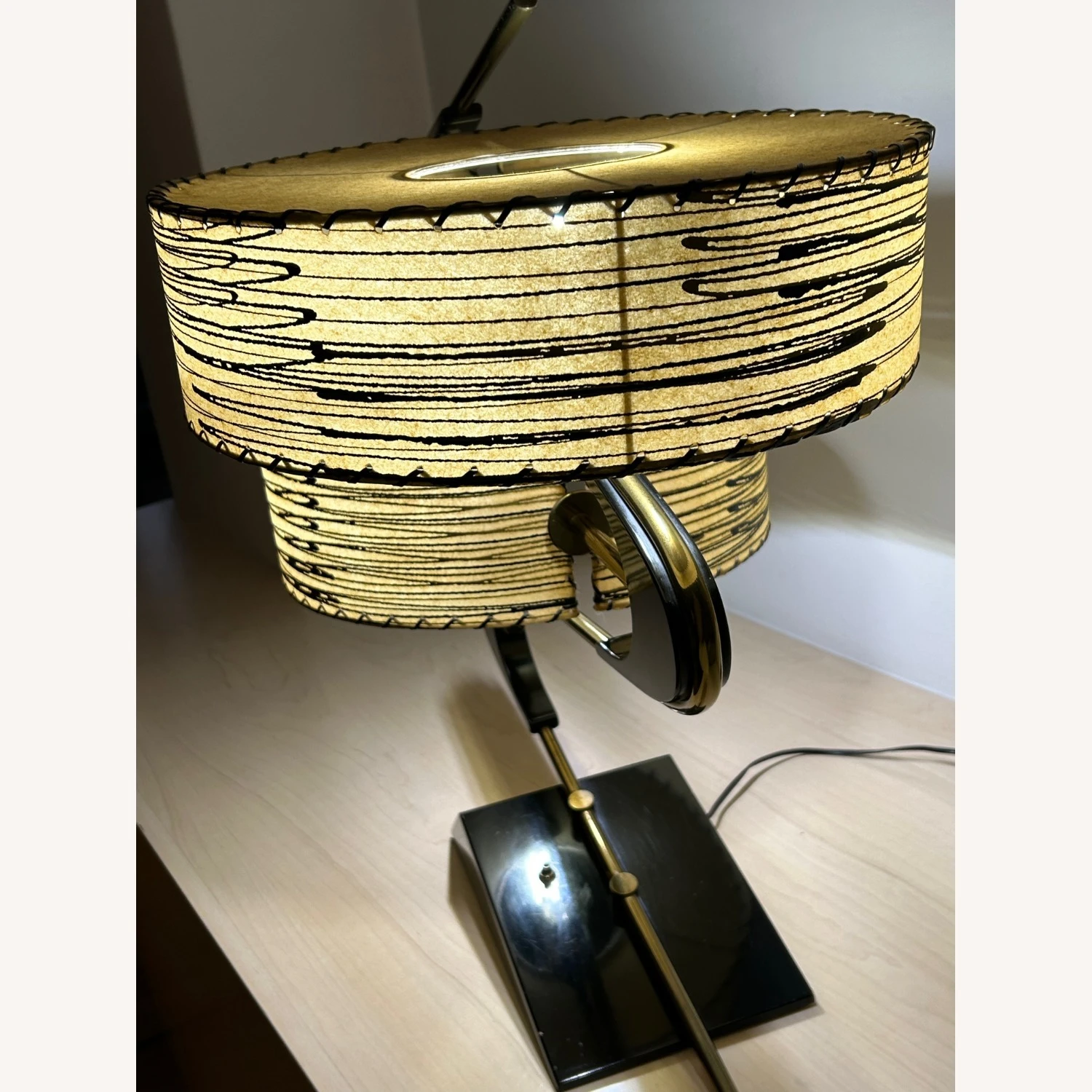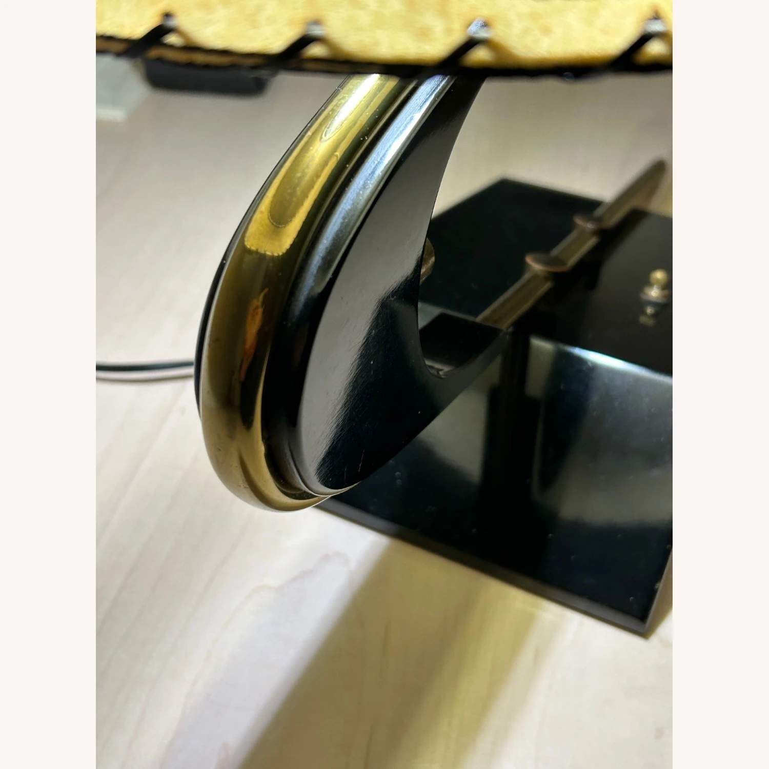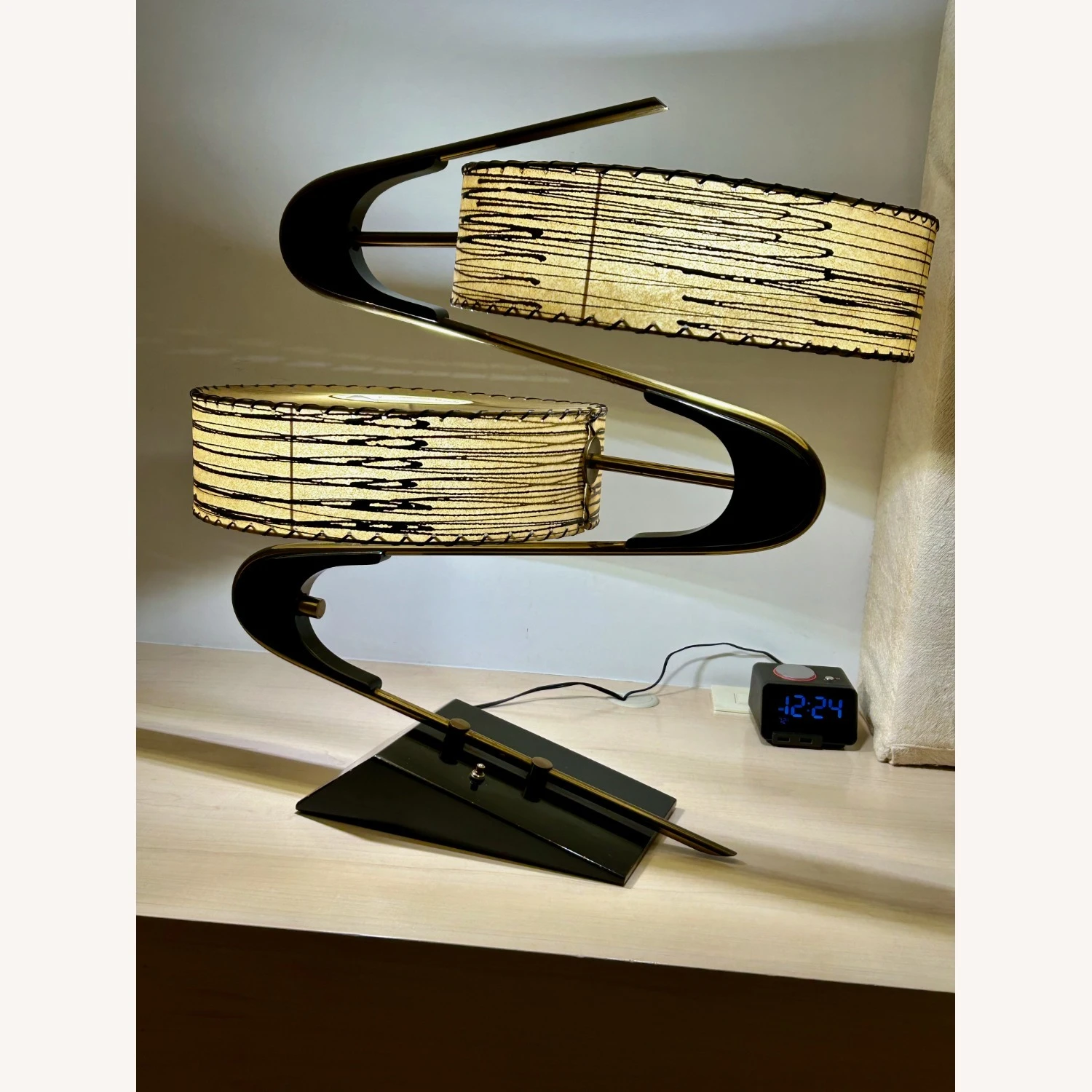 Seller’s Notes: Produced in the 1950s by the Majestic Lamp Company, this rare pair of right and left-facing Majestic Z lamps comes with original fiberglass shades with the iconic metallic gold & black design. The lamps are fully functional with each upper and lower controllable separately. The black bases are in excellent vintage condition, showing only minor scratches, and the brass shows patina consistent with age. If you look closely at the last image (close-up of the shade) it shows some fraying in one of the loops on the shade; it is the only imperfection in the cording.