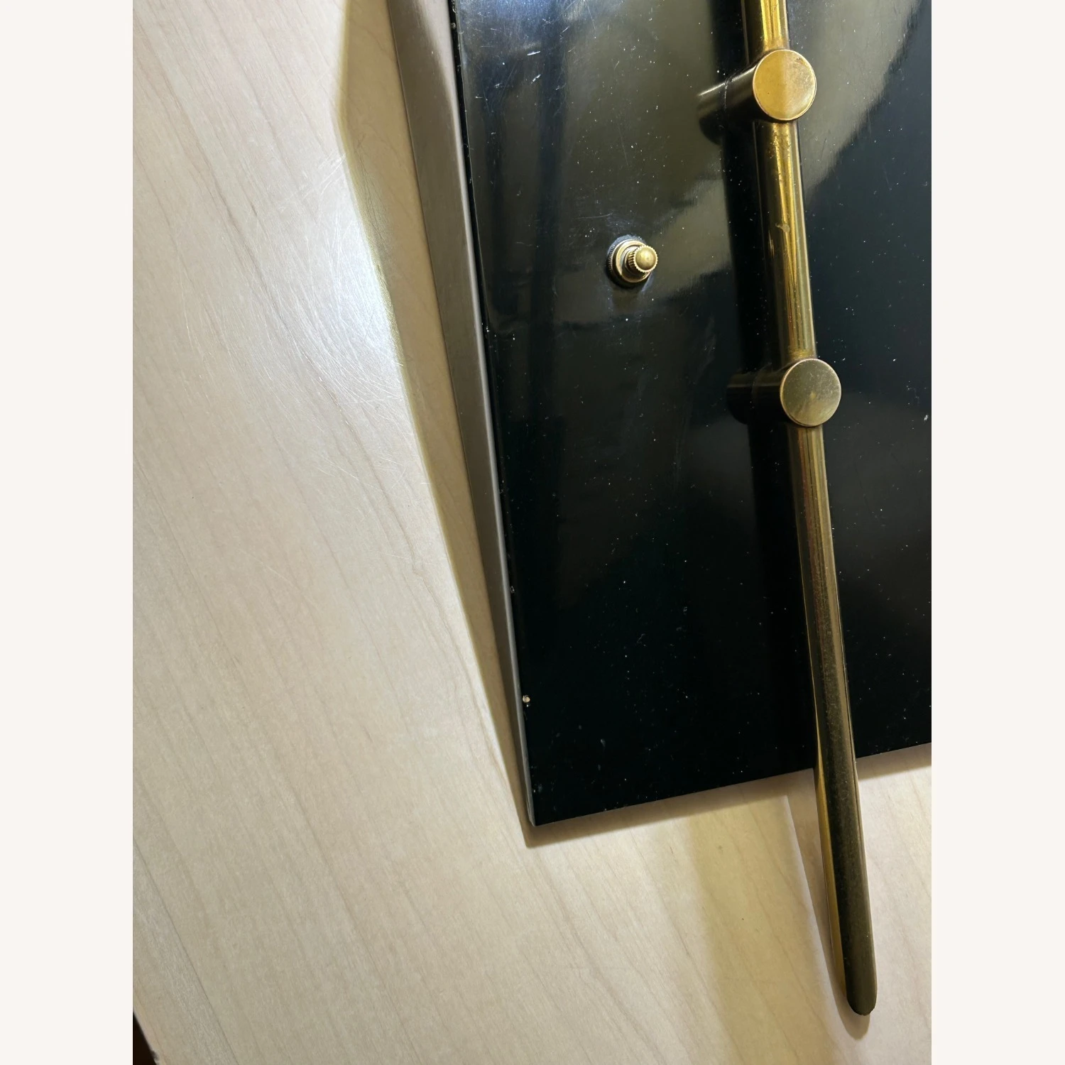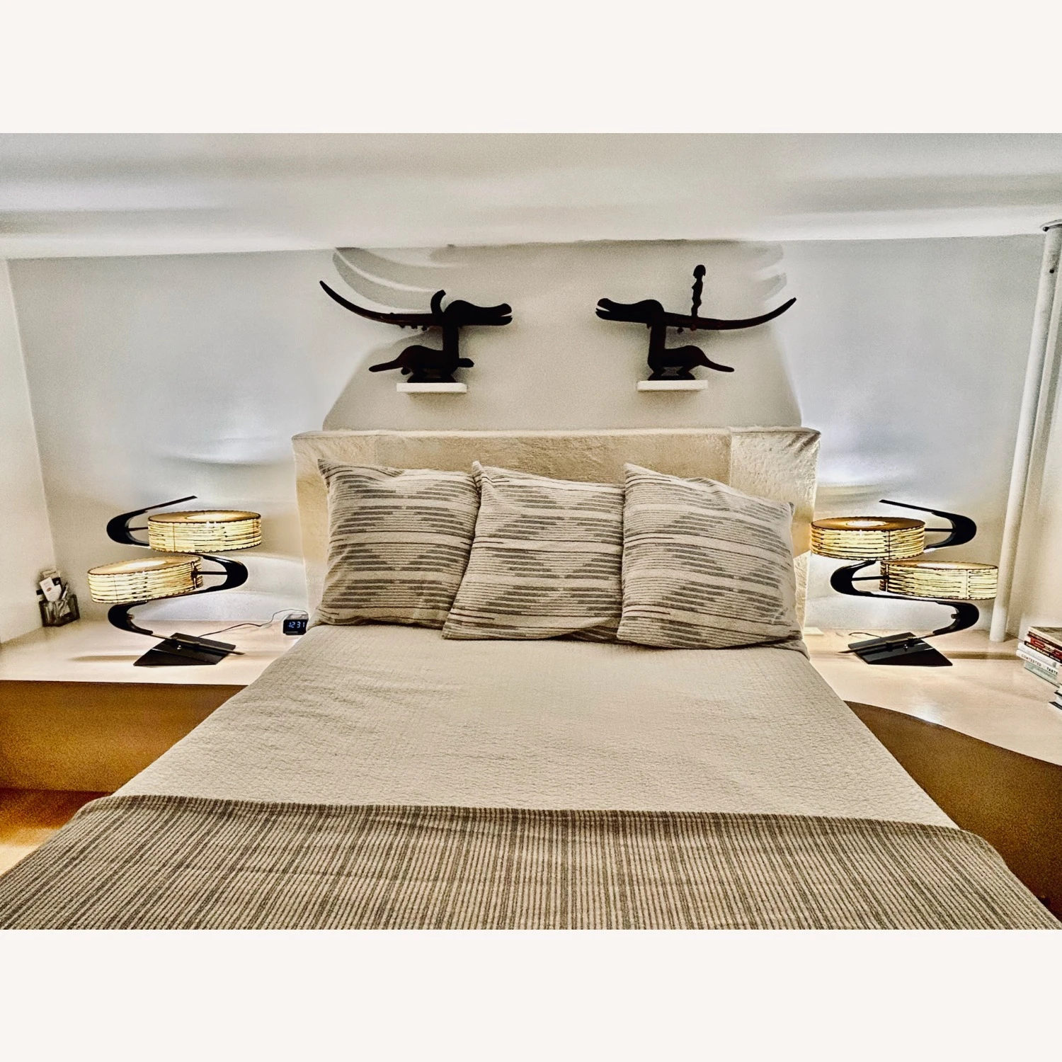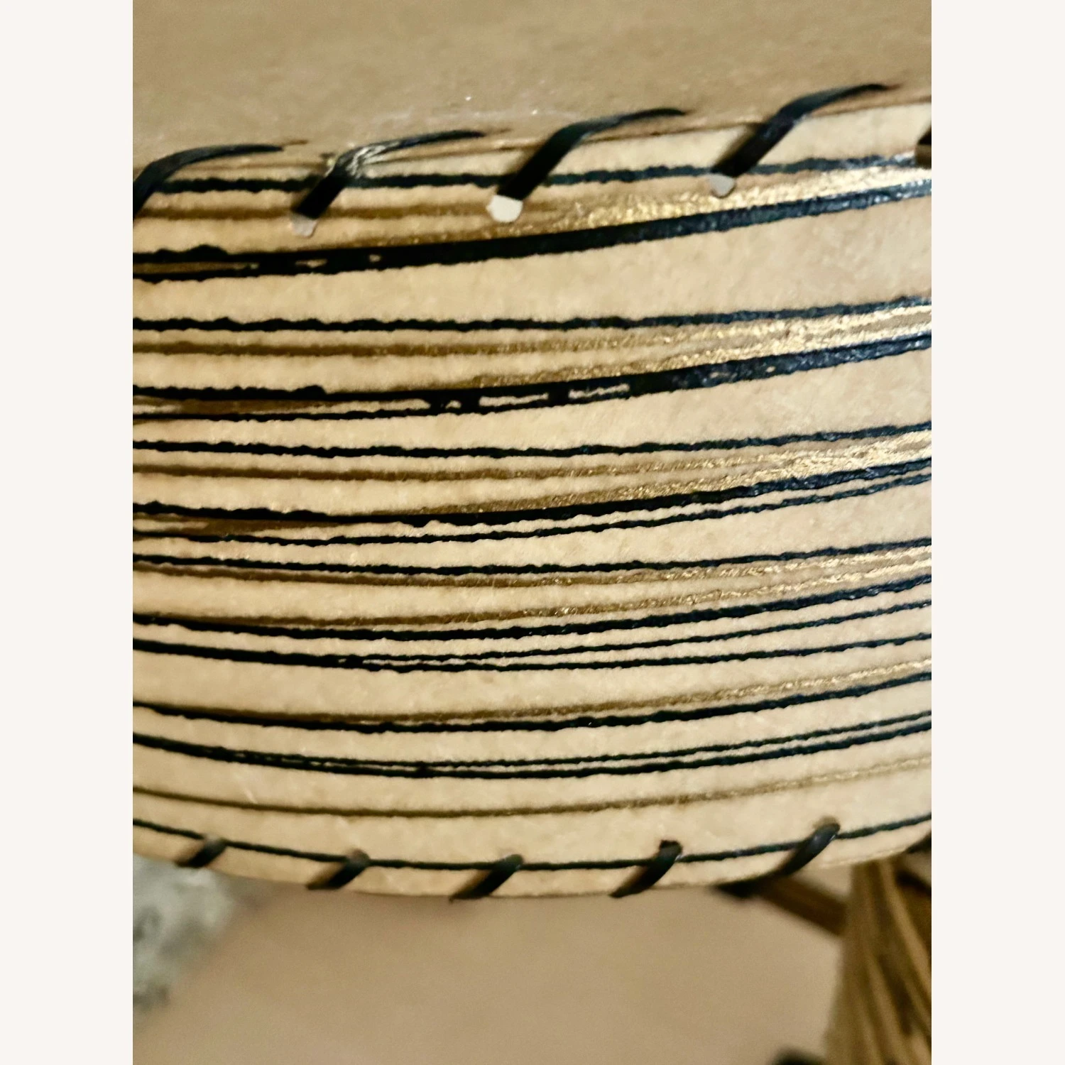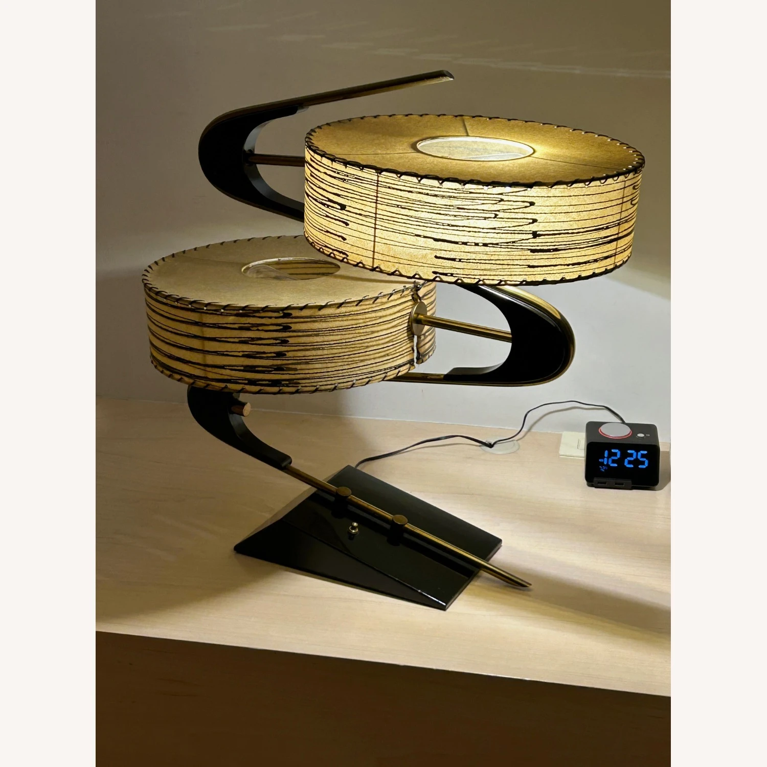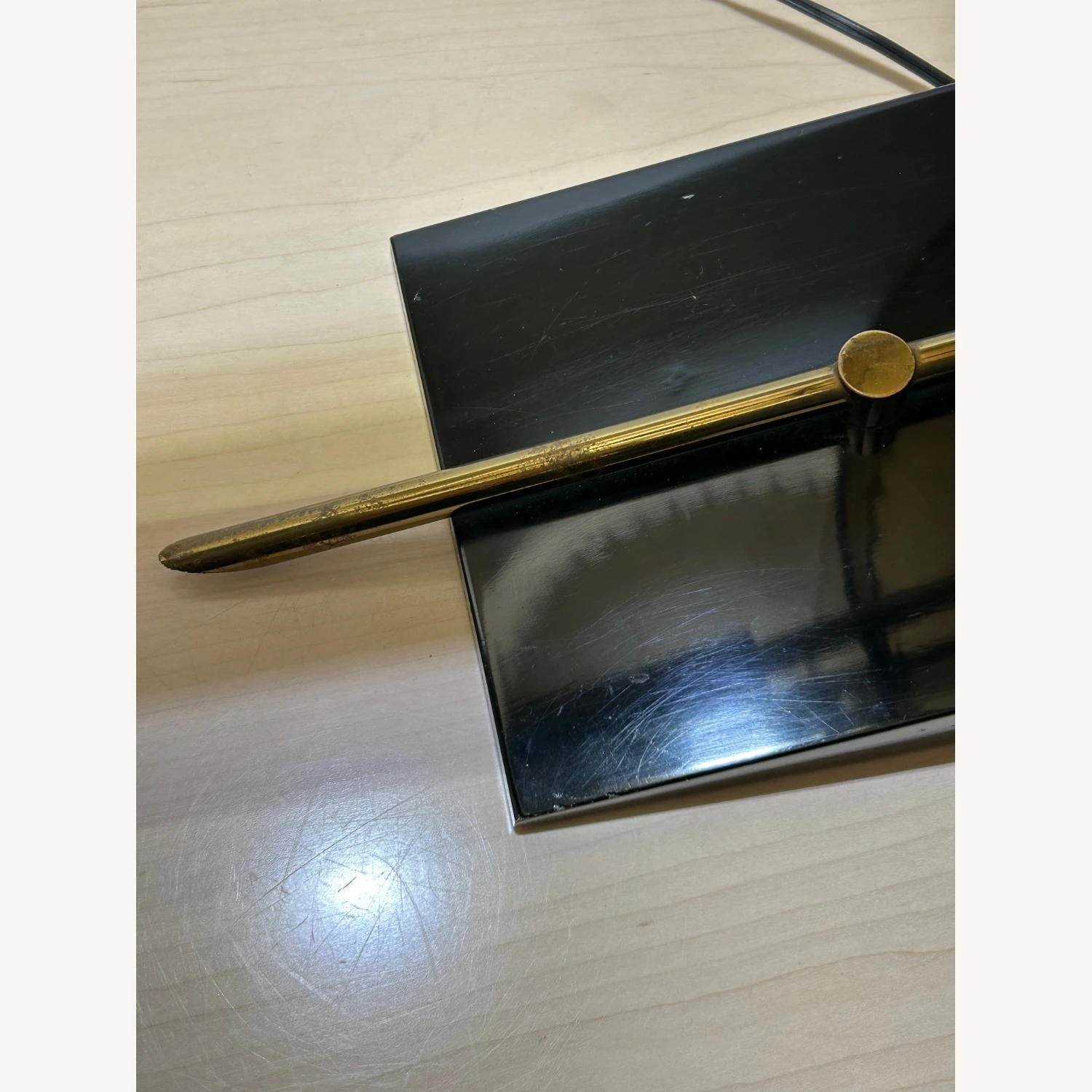 Seller’s Notes: Produced in the 1950s by the Majestic Lamp Company, this rare pair of right and left-facing Majestic Z lamps comes with original fiberglass shades with the iconic metallic gold & black design. The lamps are fully functional with each upper and lower controllable separately. The black bases are in excellent vintage condition, showing only minor scratches, and the brass shows patina consistent with age. If you look closely at the last image (close-up of the shade) it shows some fraying in one of the loops on the shade; it is the only imperfection in the cording.
