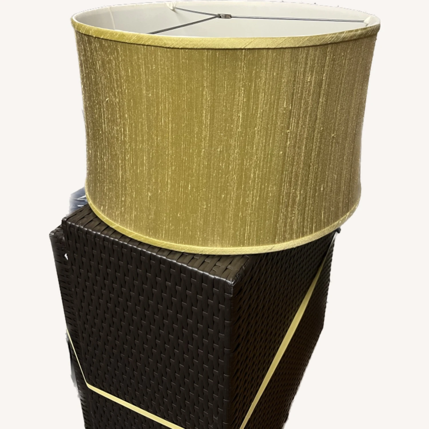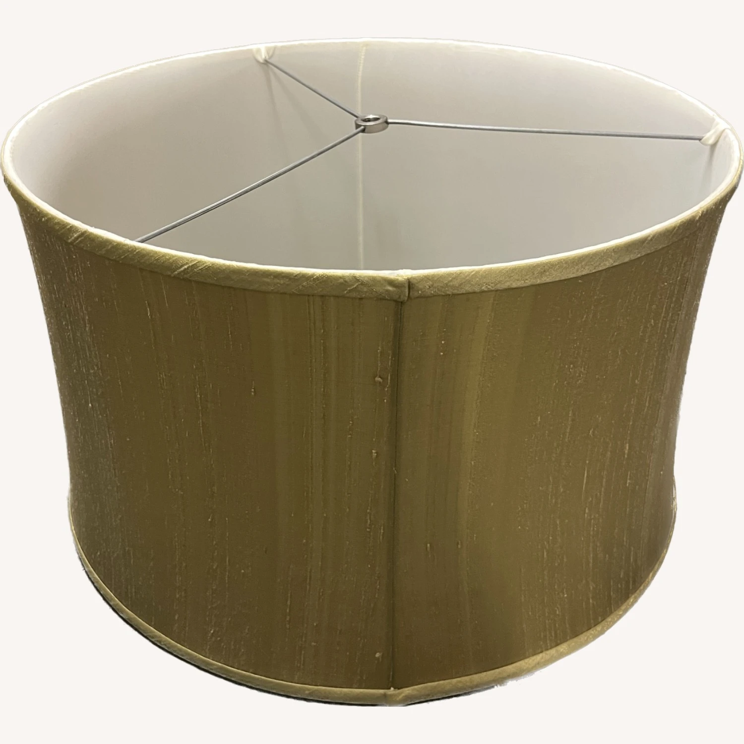 Seller’s Notes: Textured raw silk lampshade would happily top a larger table lamp or a floor lamp. Itโs lined in white so provides very good light even with the medium green shade color.