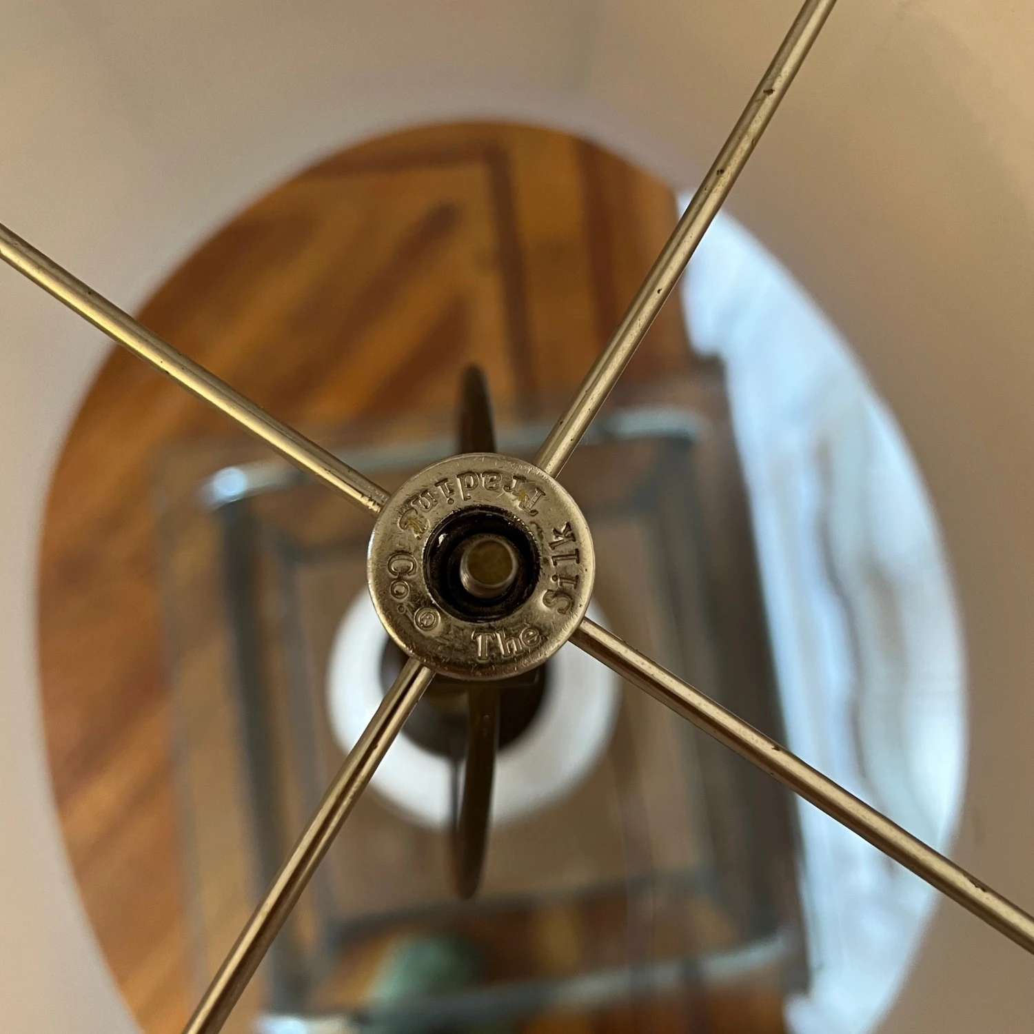 MEASUREMENTS: Height (to top of finial): 33″, Base Diameter: 9″, Widest point of lampshade: 18″