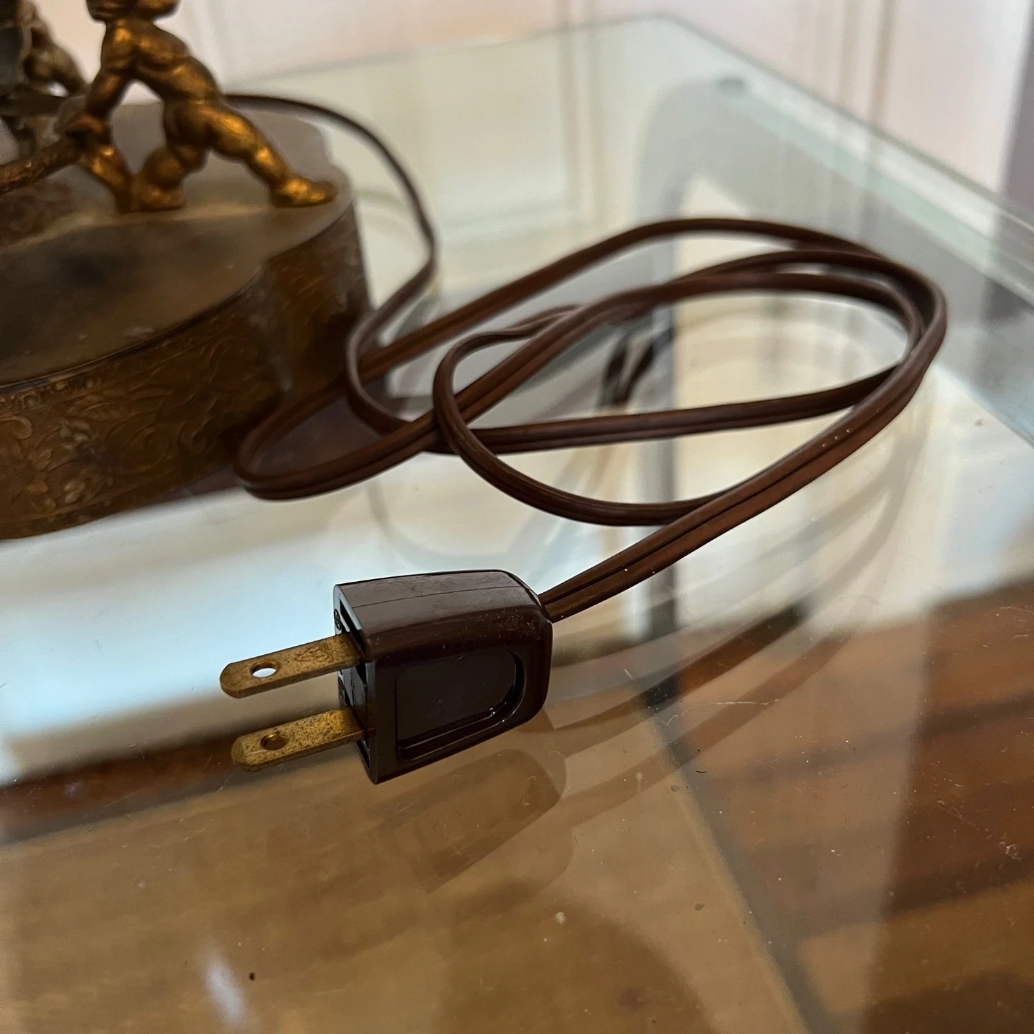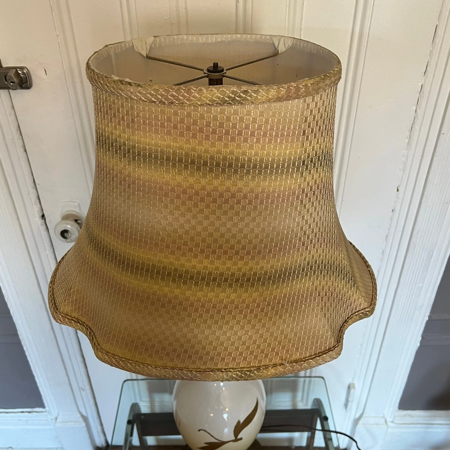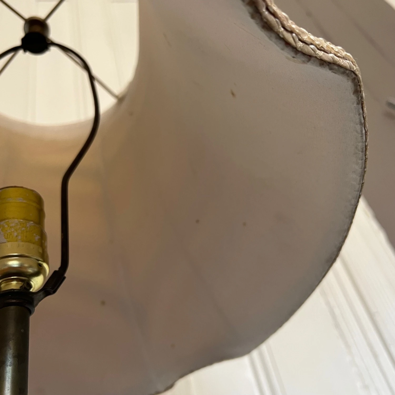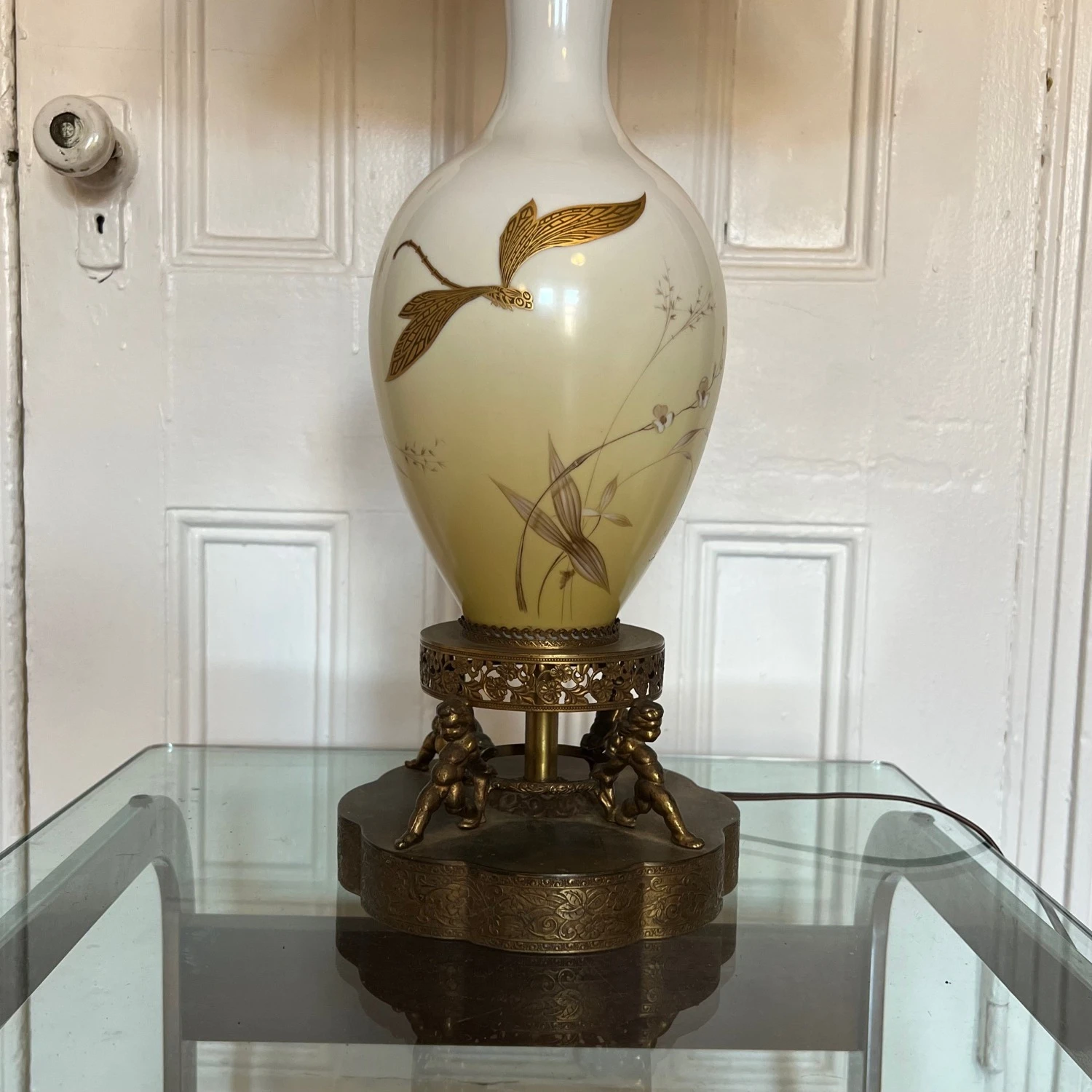 DETAILS: No maker’s mark found. Vintage urn/vase shaped white porcelain lamp body with delicate painted florals and a gold dragonfly. Brass base has decorative floral embossing and 4 brass cherubs that hold up the body of the lamp. Attached base pad underneath. Lampshade is from SILK TRADING CO, and has an elipsoidal shape, featuring a soft pink, cream, and white pattern. Has a vintage Made in USA LEVITON bulb socket and 2-prong electrical cord.