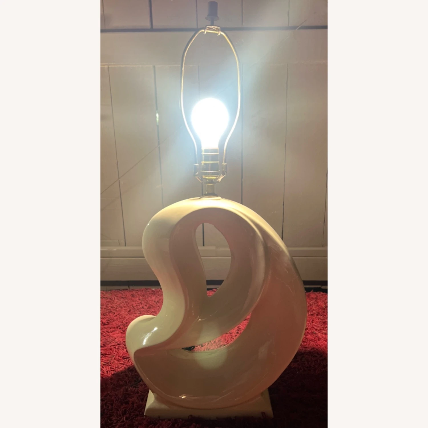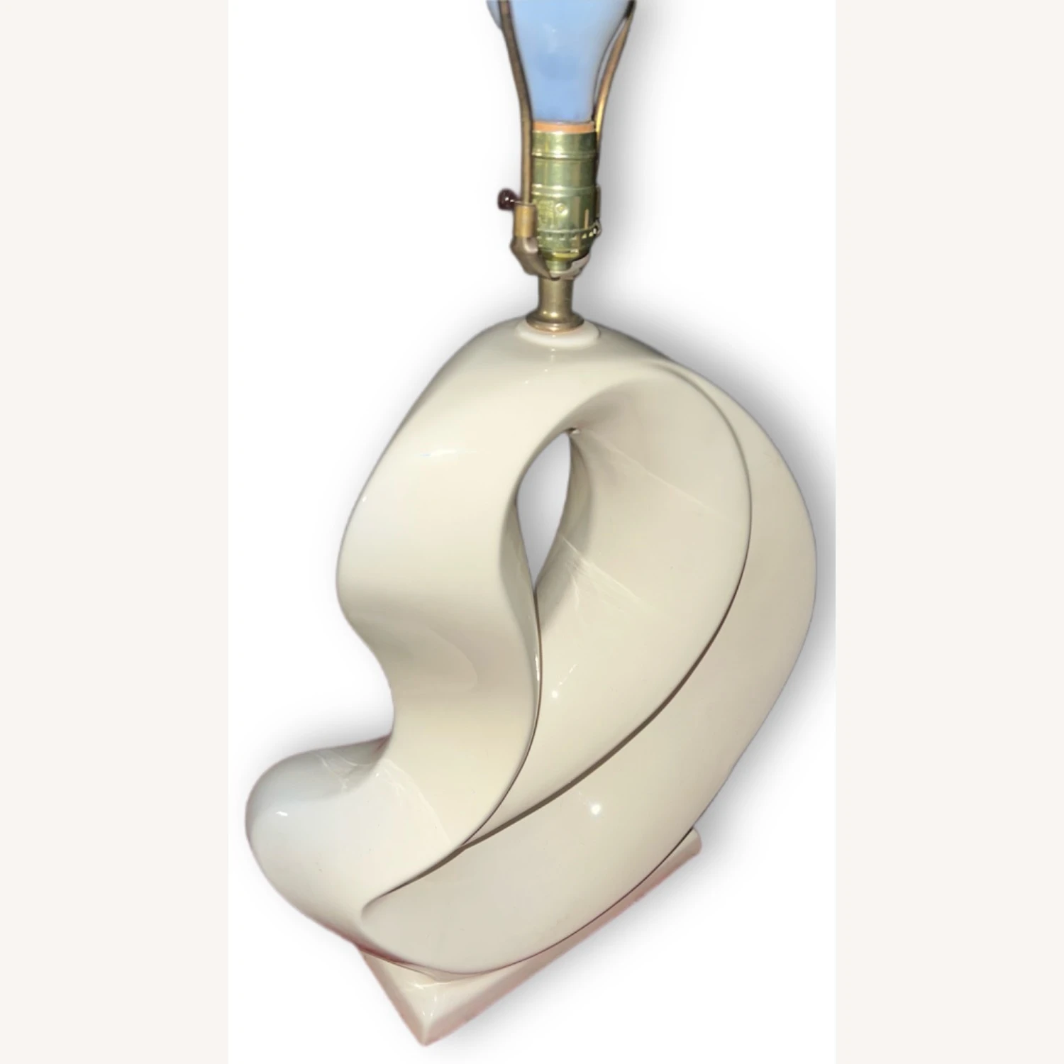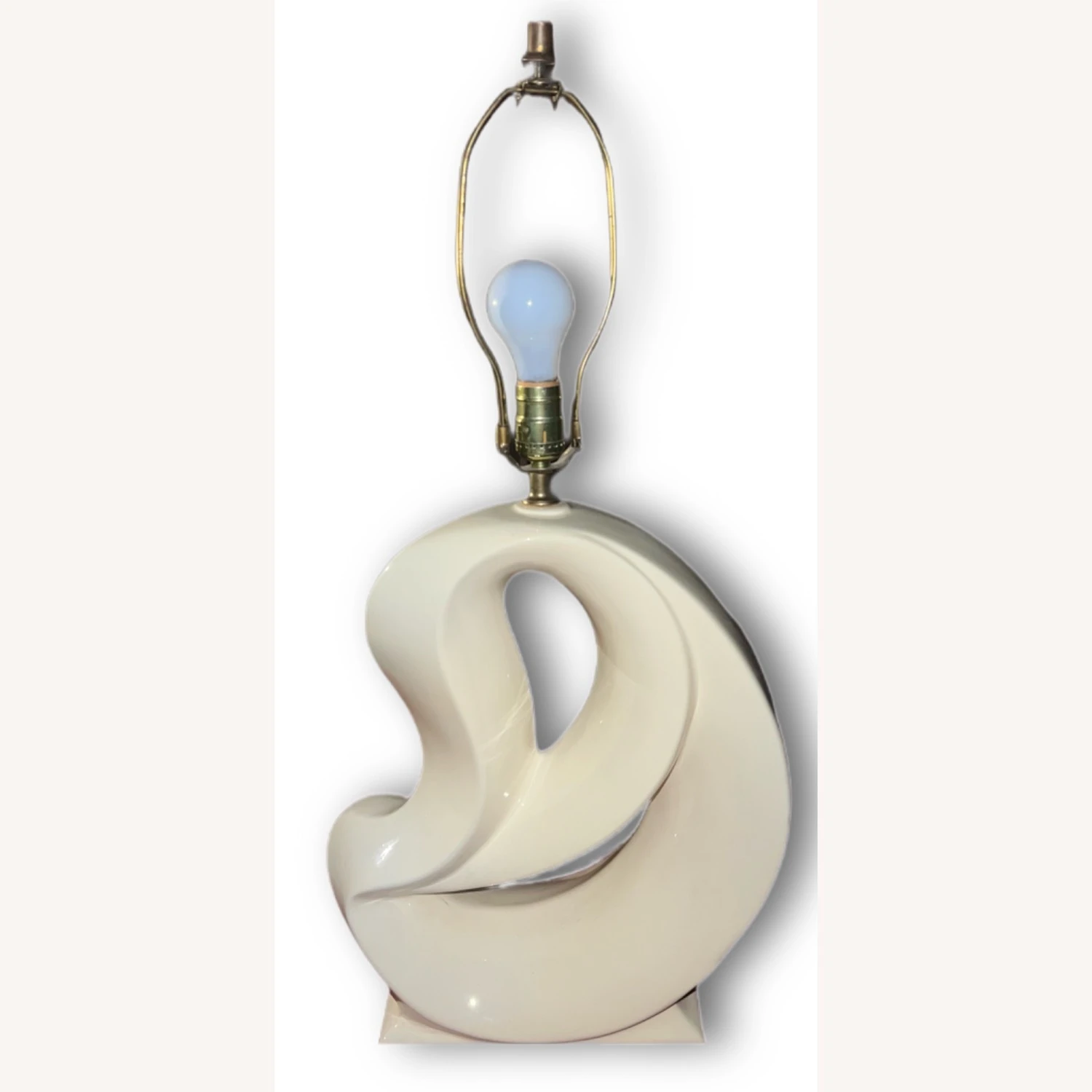 Seller’s Notes: This vintage off-white colored lamp is an absolute must-have for admirers of abstract art and design! Standing approximately 21.5-inches from the base to the bottom of the bulb, this lamp is made out of ceramic and was beautifully sculpted into the design seen here. This lamp measures approximately 14-inches at its widest point, and the base measures roughly 10-inches. This item is in great vintage condition and is fully functional! There are no visible scratches or cracks.