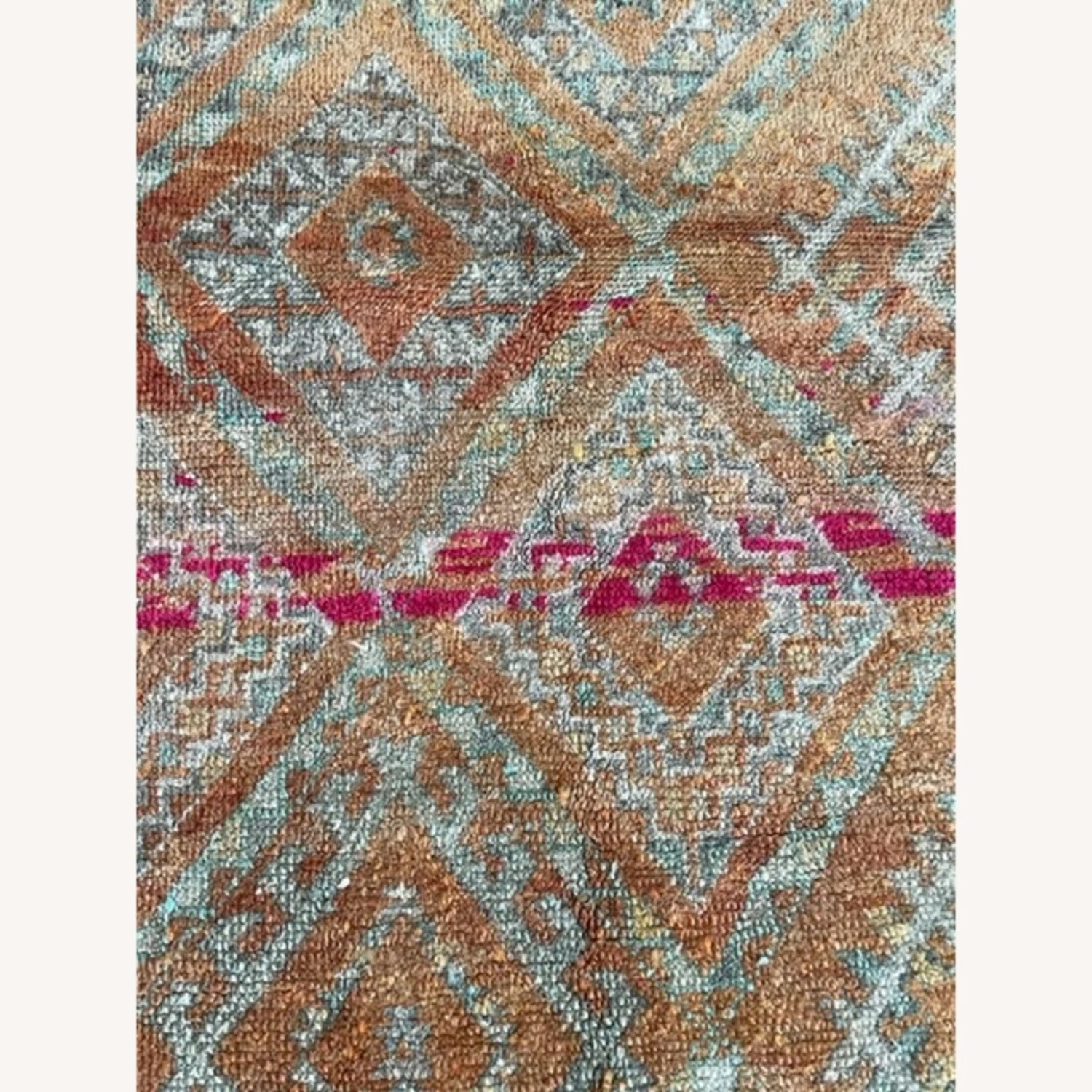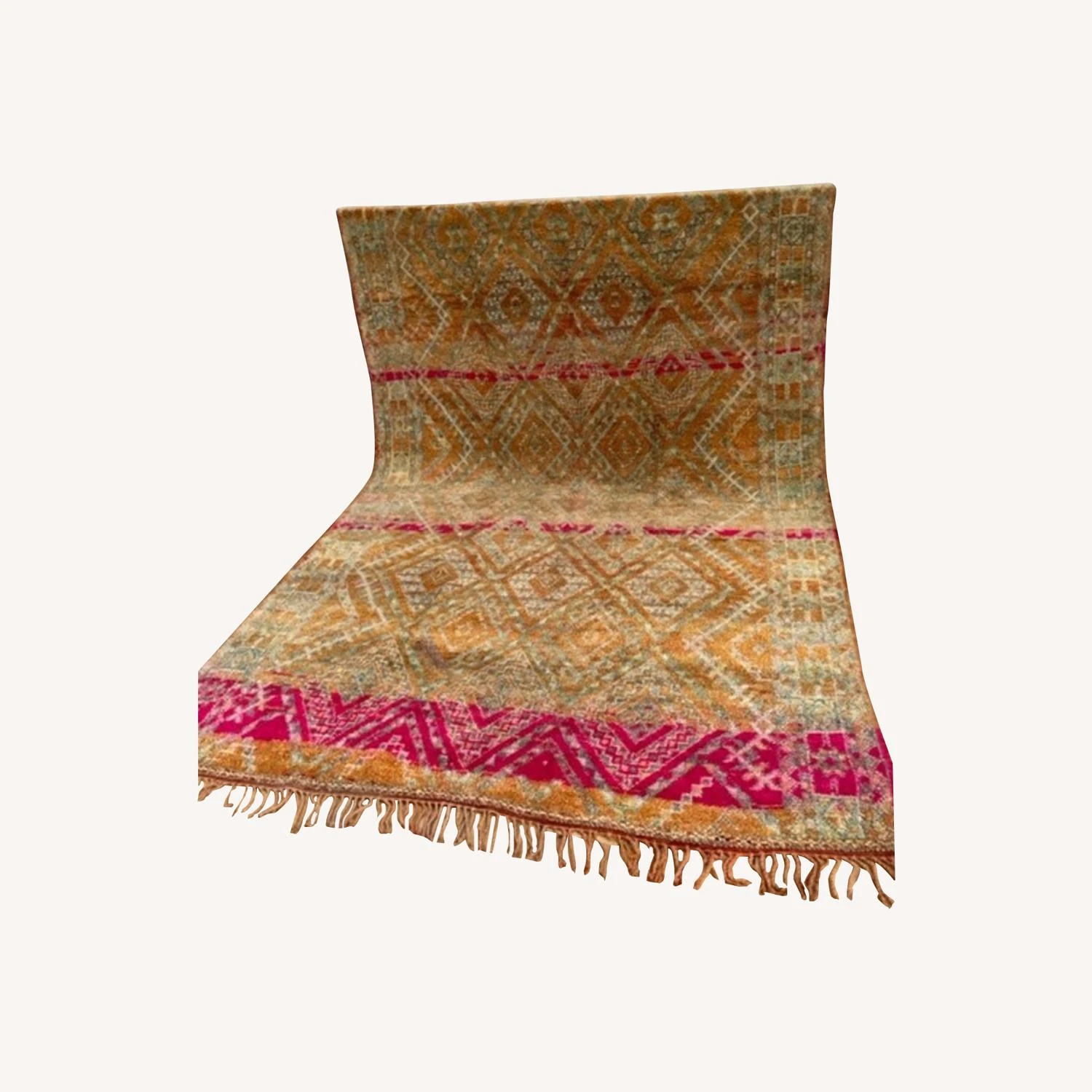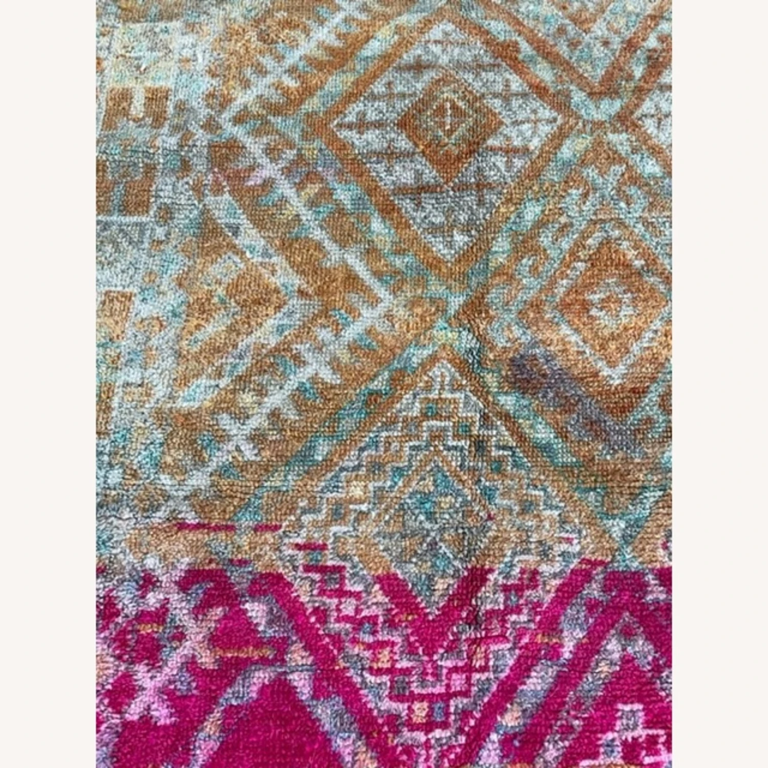 Seller’s Notes: Super unique vintage Moroccan Beni Mguild rug (circa 1960s). This rug is extremely well made, with a very high quality wool and dyes. It has very low pile and almost shines. The colors are amazing and you can’t miss the pops of hot pink! Wonderful design as well. There is a small discoloration (shown in one picture) that is not very noticeable and just adds to the charm. Love this one for a bedroom or home office. 5’9″x9′