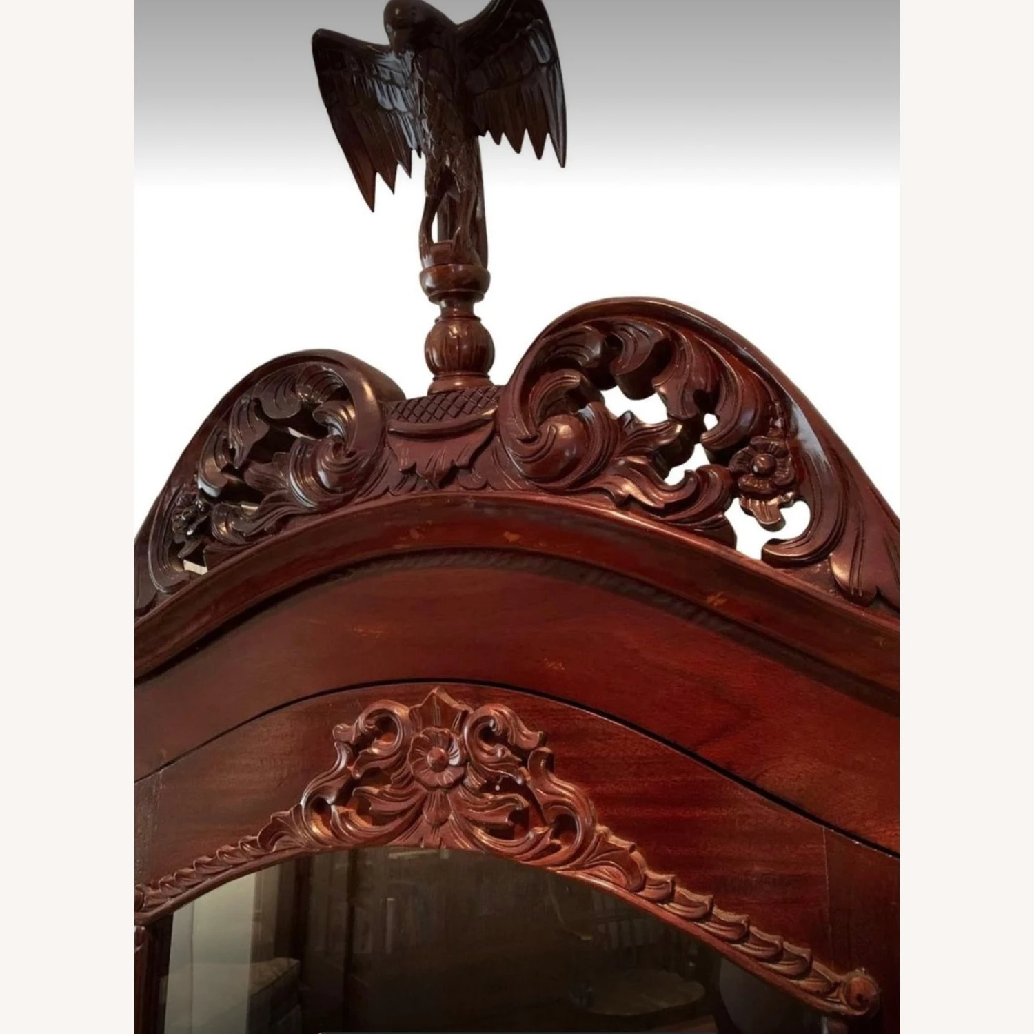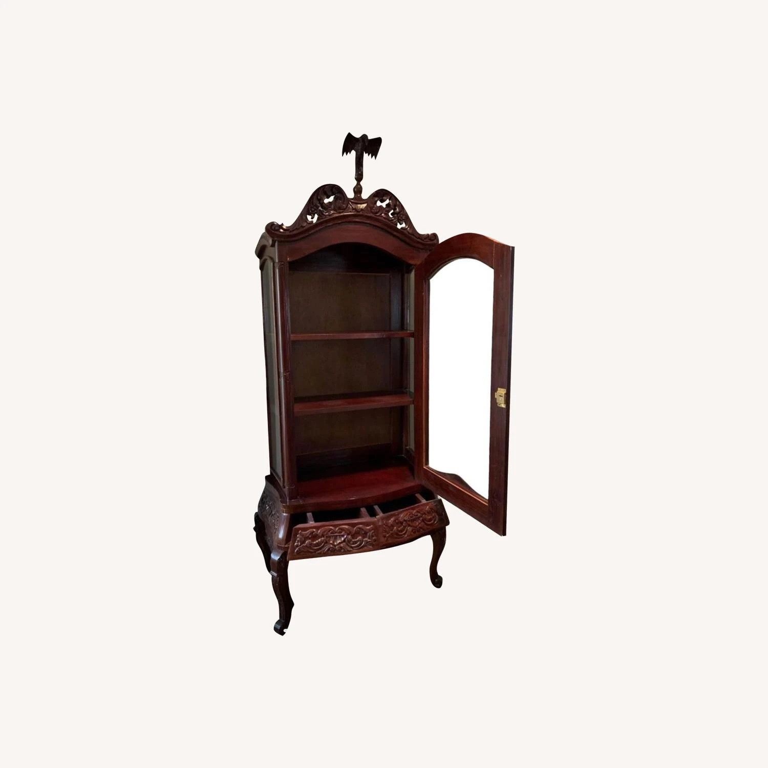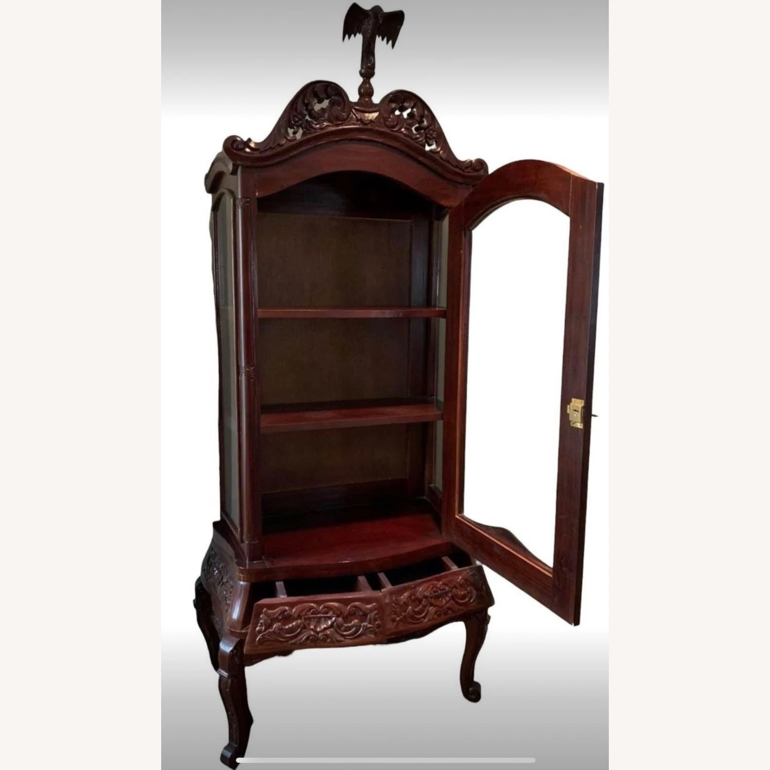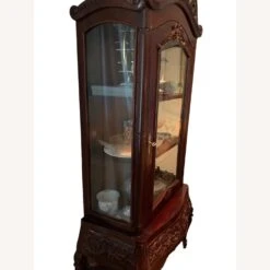 Seller’s Notes: Mahogany, carved CHINA CABINET with lock. Glass on three sides makes a stunning showcase for your porcelain, glassware, or book collection. Falcon crest is removable. 3 fixed shelves, 2 drawers. Overall Dimensions: 36โ wide x 19โ deep x 82โ high. We are downsizing and need to let go of some of our treasured items so we can all begin our next chapter.