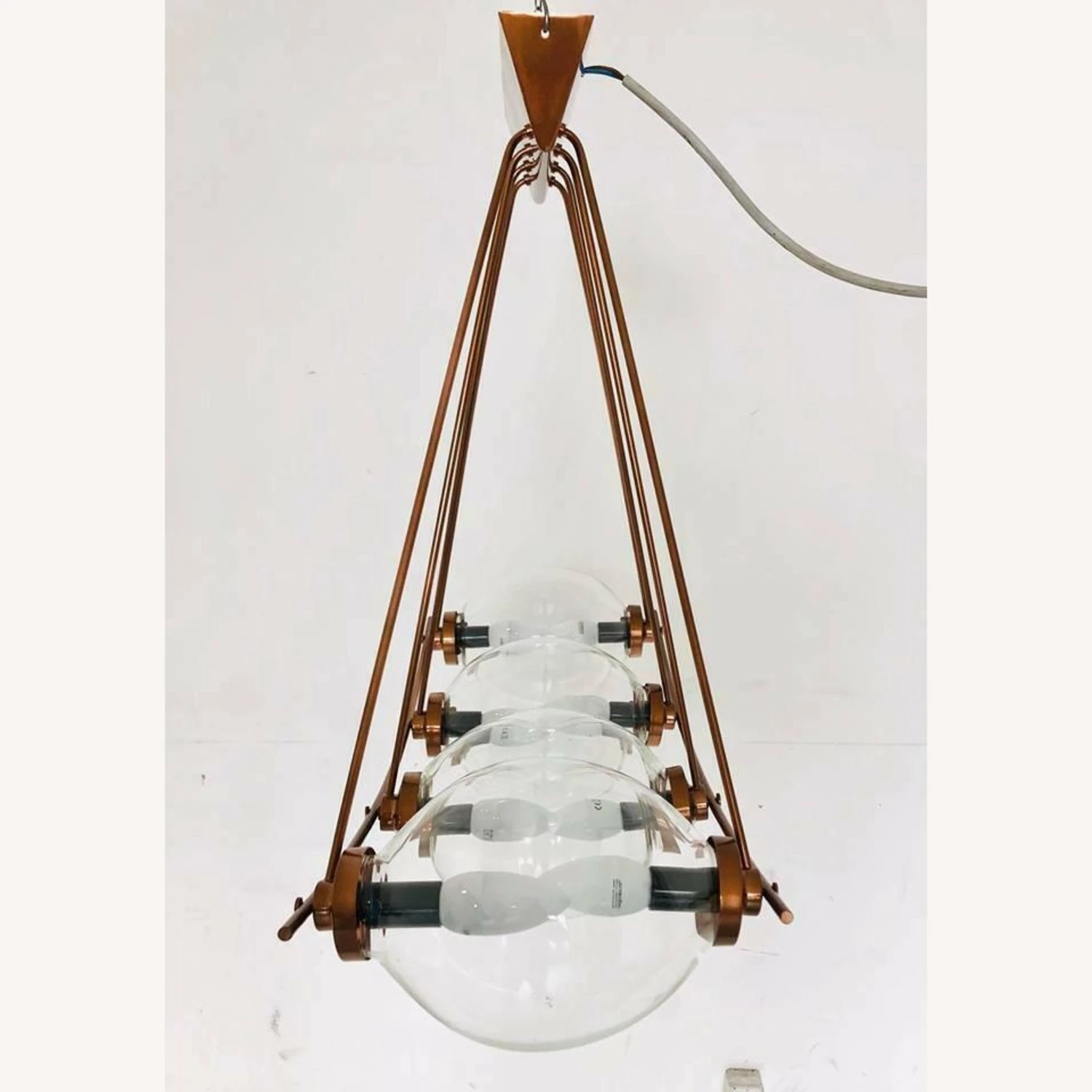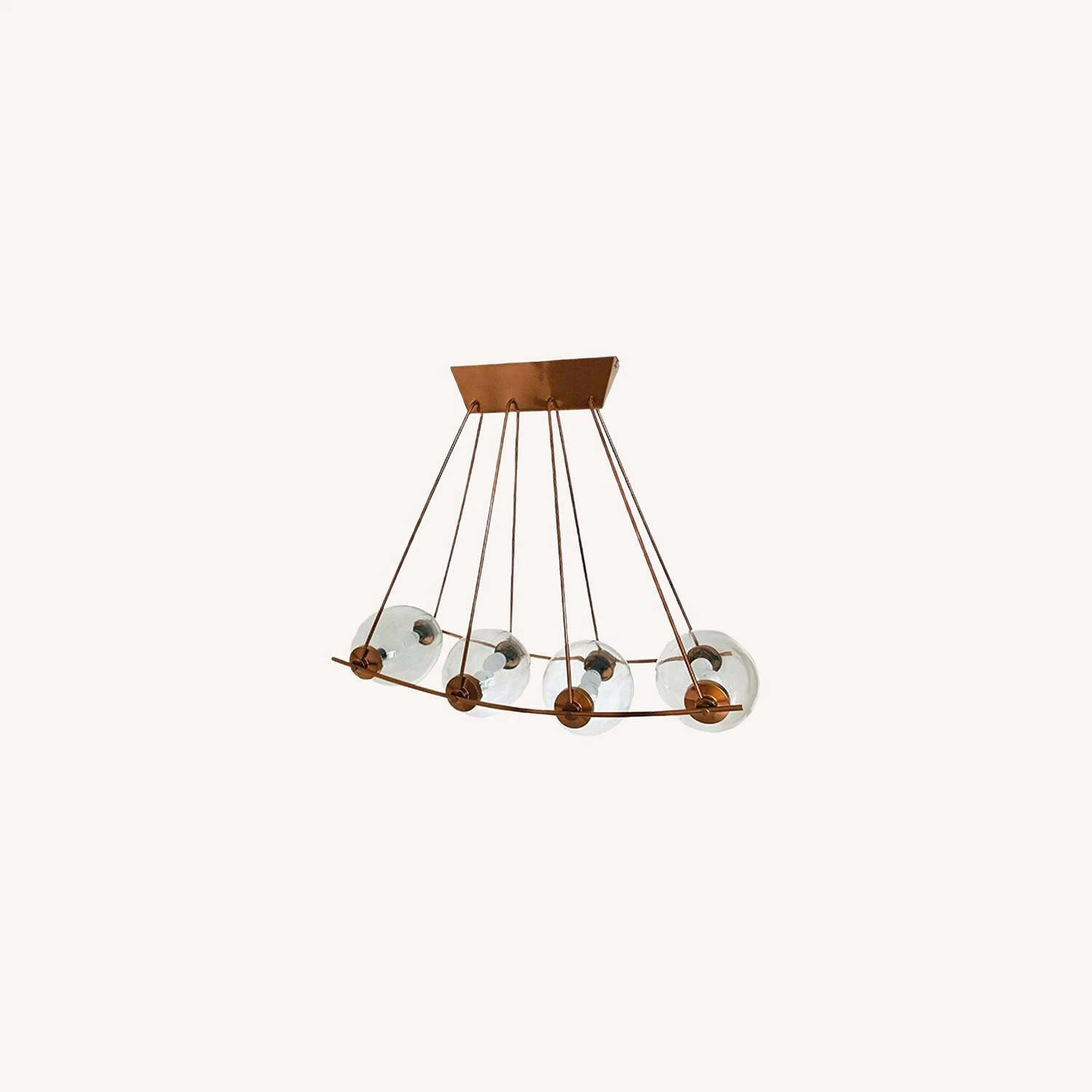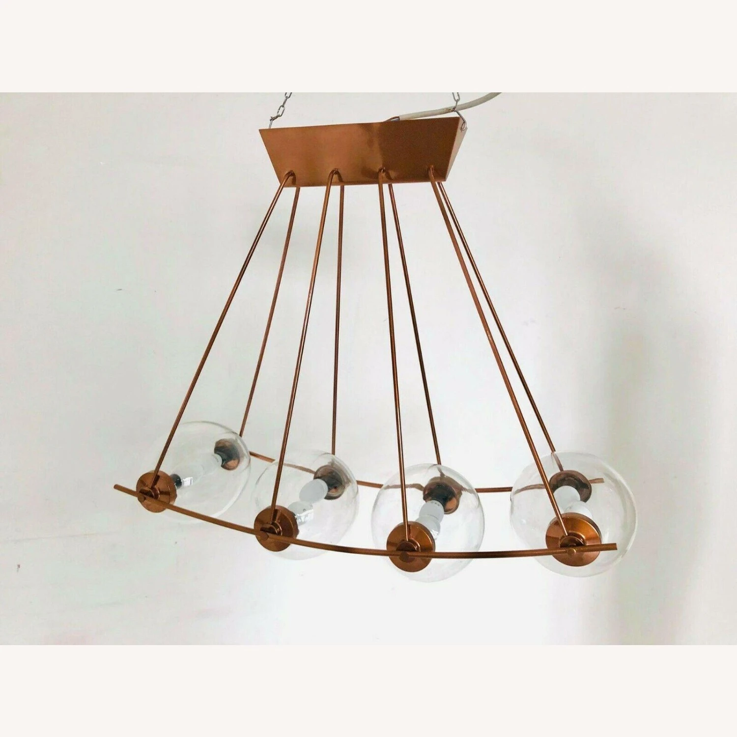 Seller’s Notes: A wonderful 1950’s chandelier by Osvaldo Borsani. It has been fully restored and repainted in copper. There are 4 glass globes that hold 8 lights total in a slightly curved, linear style. This would look great over a kitchen/dining table. Made in Italy