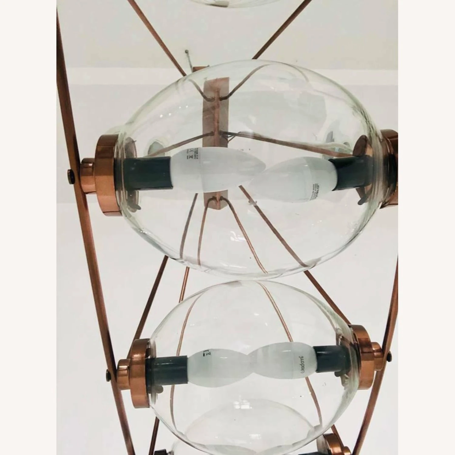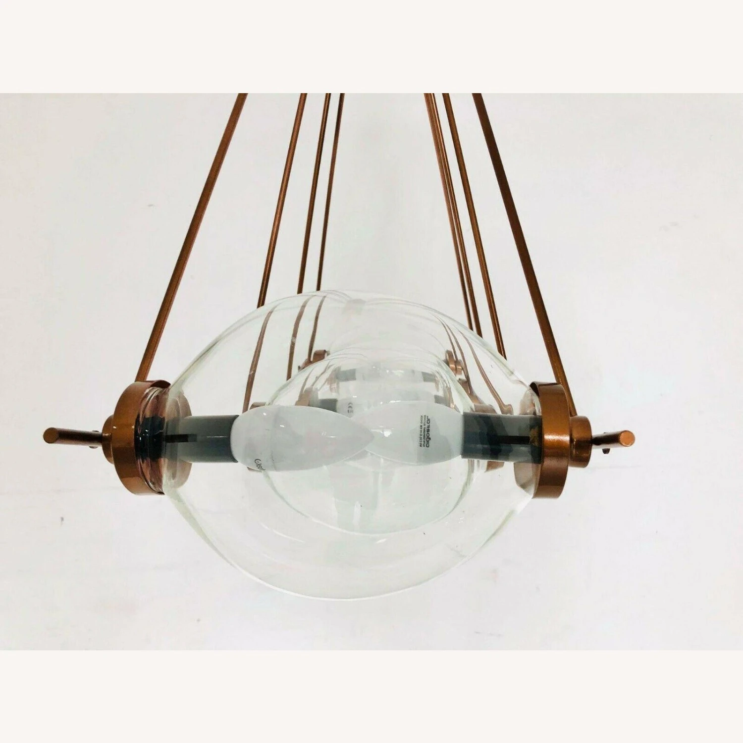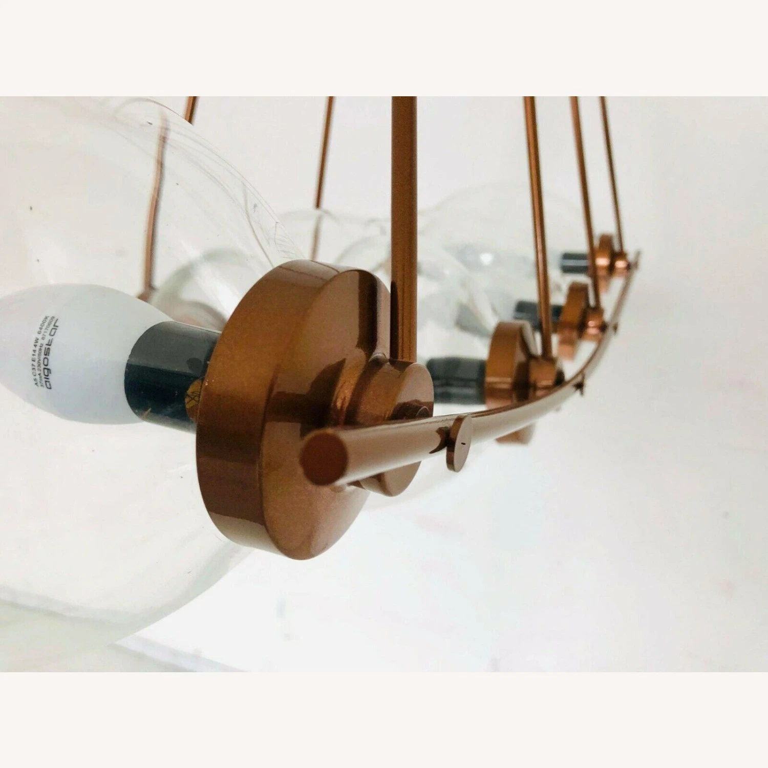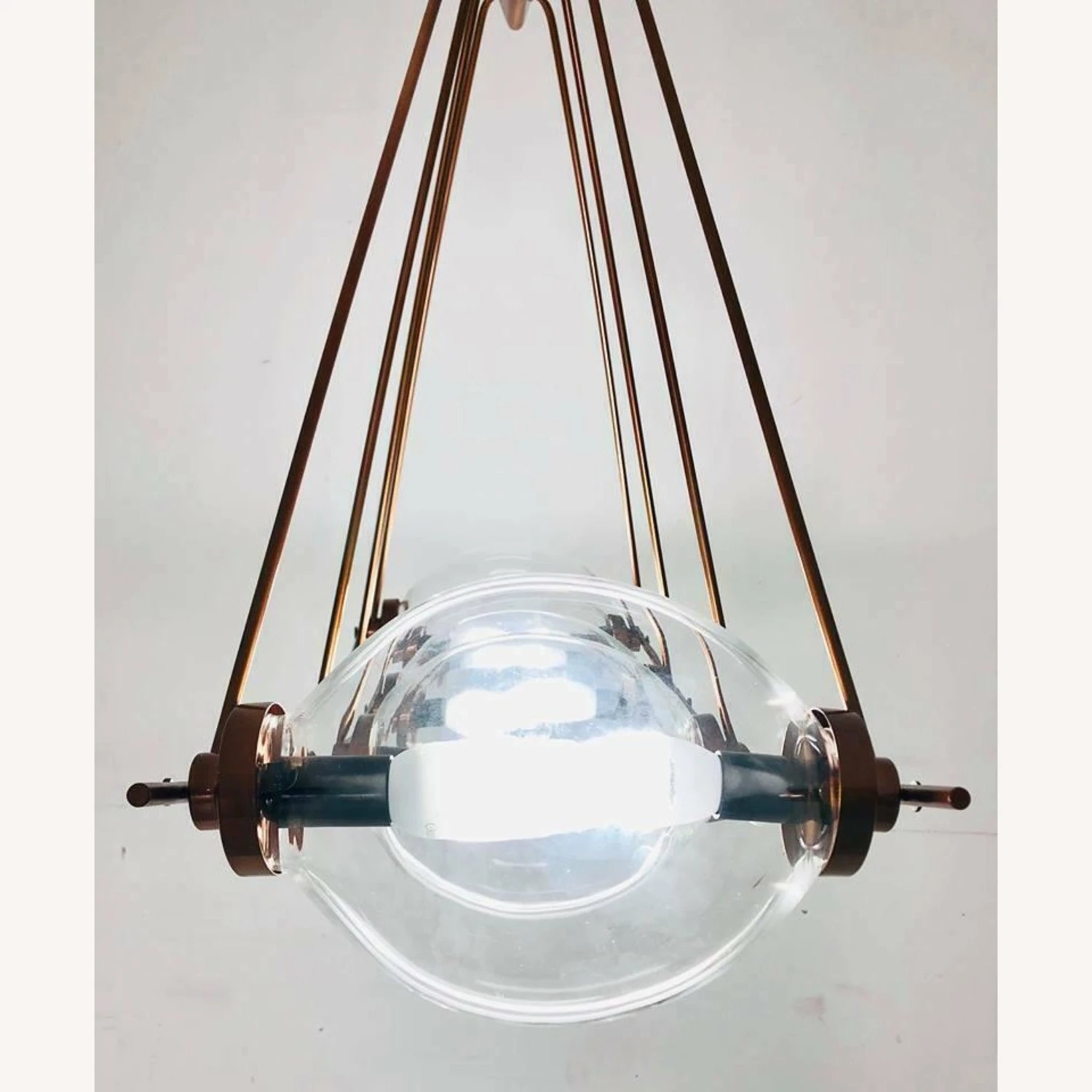 Seller’s Notes: A wonderful 1950’s chandelier by Osvaldo Borsani. It has been fully restored and repainted in copper. There are 4 glass globes that hold 8 lights total in a slightly curved, linear style. This would look great over a kitchen/dining table. Made in Italy