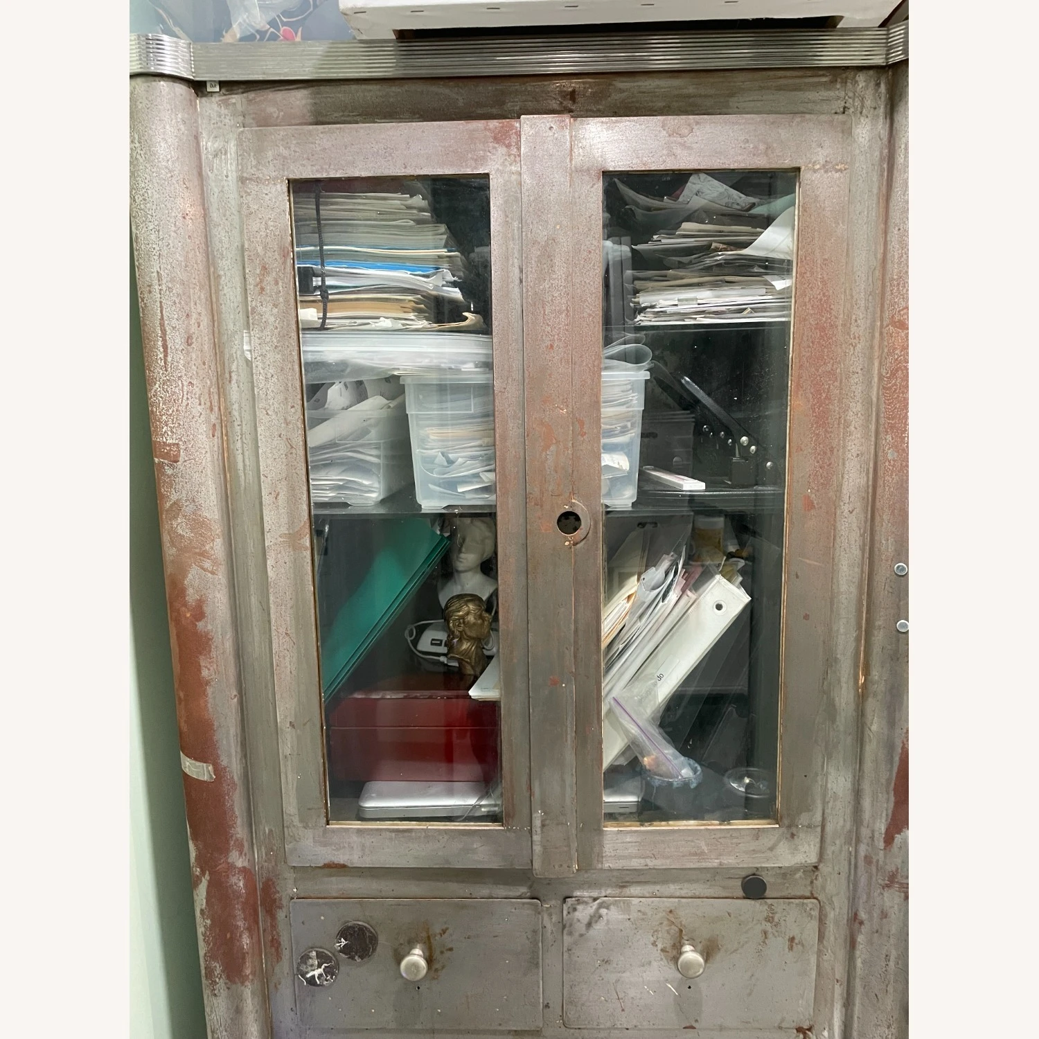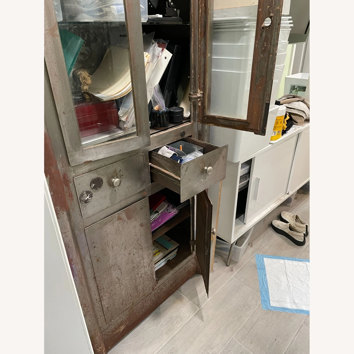 Seller’s Notes: Around the year 2000 I found this amazing vintage metal cabinet at a flea market in Chelsea, Manhattan, NY. I had never spent serious money on housewares. This was my first big purchase and I filled it with my ridiculous cocktail glass collection. It has moved with me twice. The shelves are made of glass. They can be removed, which is great for tall items and for moving. It is missing a door knob as the photos show. Not hard to replace. Yes, it’s become more rusty, but I rather like the look of that. Everything “works” in that the drawers open and close. I’m selling it because it has become purely functional now. And I am trying to de-clutter. I have no idea how much this would cost to send in the mail. I hope that someone in the tri-state area can come and pick it up from me in North Brooklyn. If not, I am open to suggestions.
