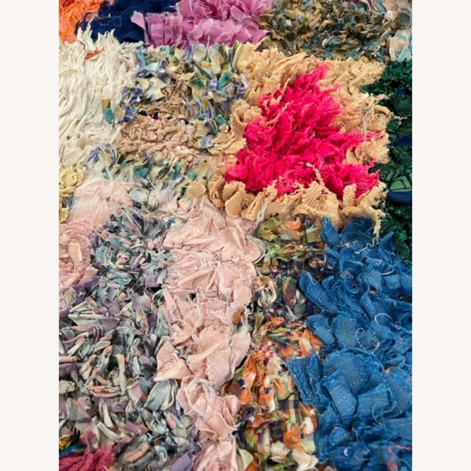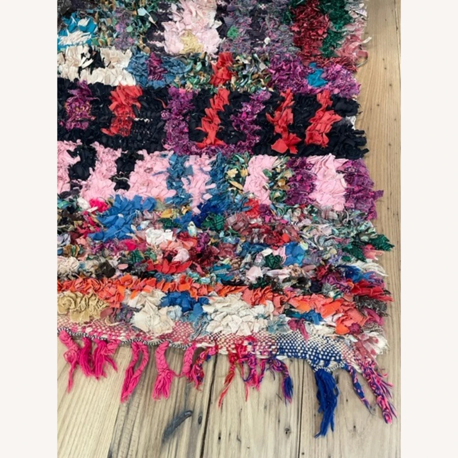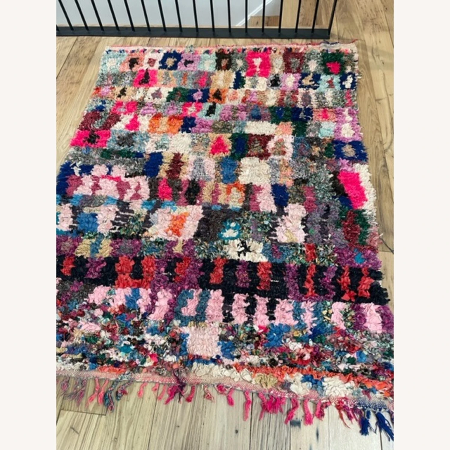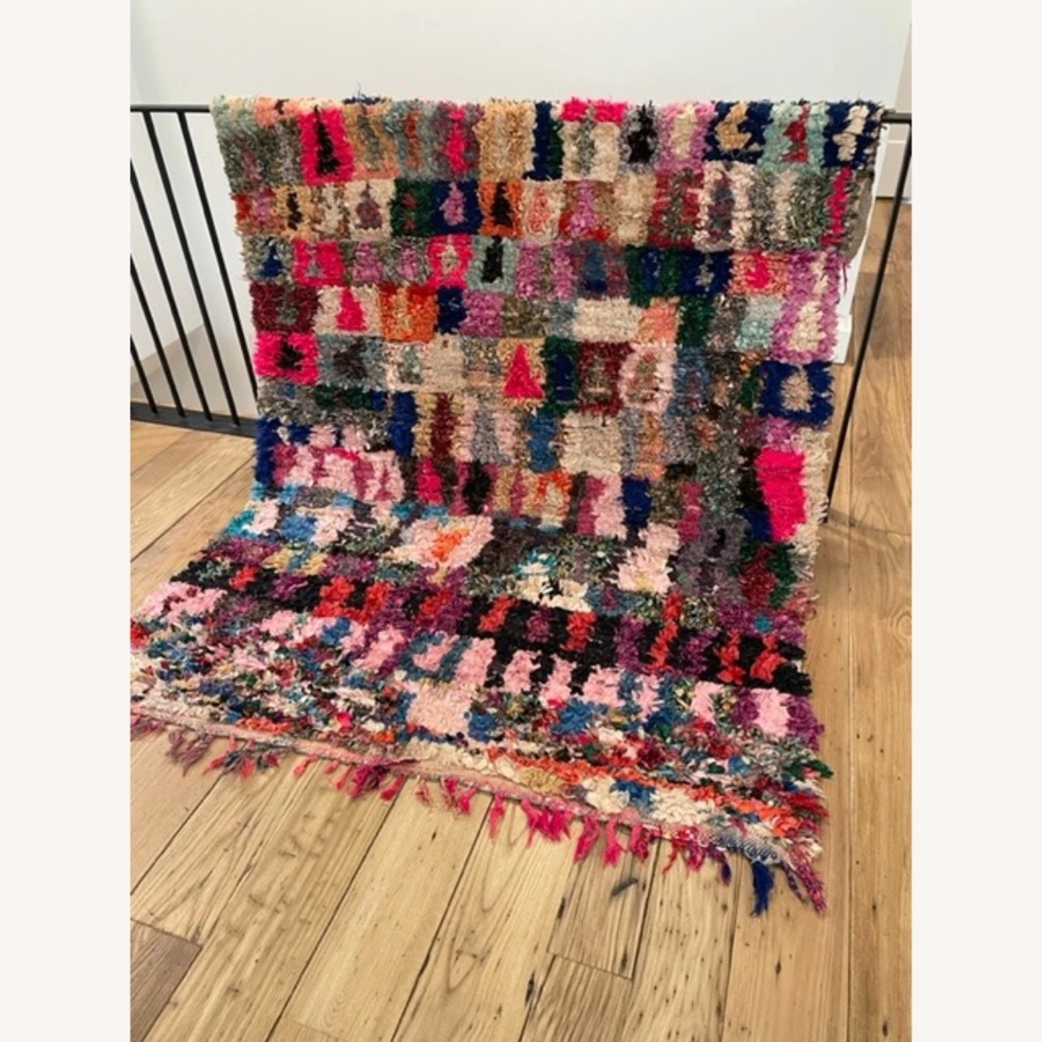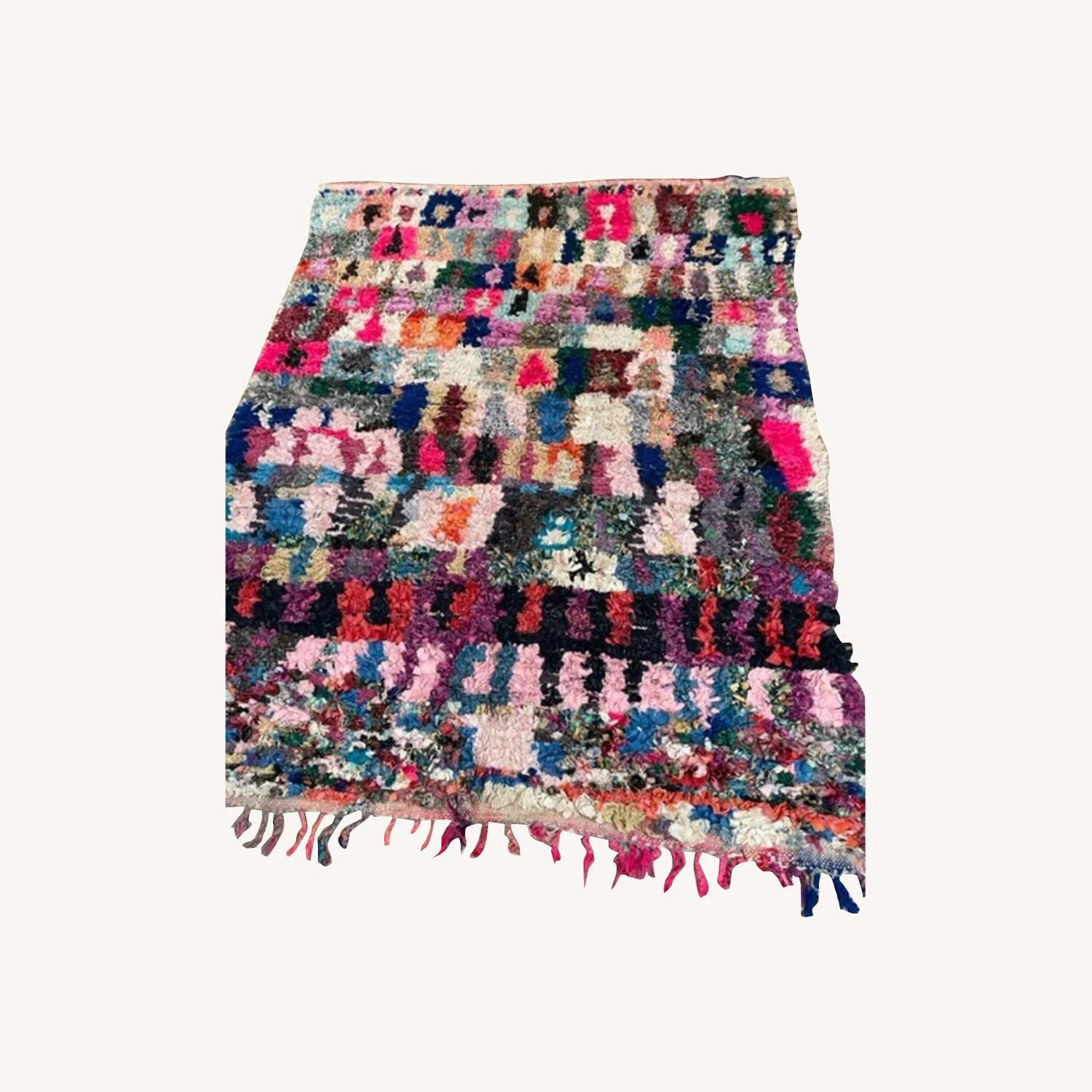 Seller’s Notes: This is a beautiful example of Moroccan boucherouite rugs, or “rag rugs.” These are not made of wool like typical Moroccan rugs, rather they are made of cotton and other fabric scraps. They are such a great example of sustainability as well as a fun pop of color. Boucherouites also are easy to clean and hide dirt well due to their crazy patterns. Sourced myself in Morocco for my company, vintage maroc. Perfect for a home office or kids’ room. 5’2″x6’6″
