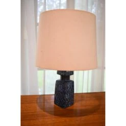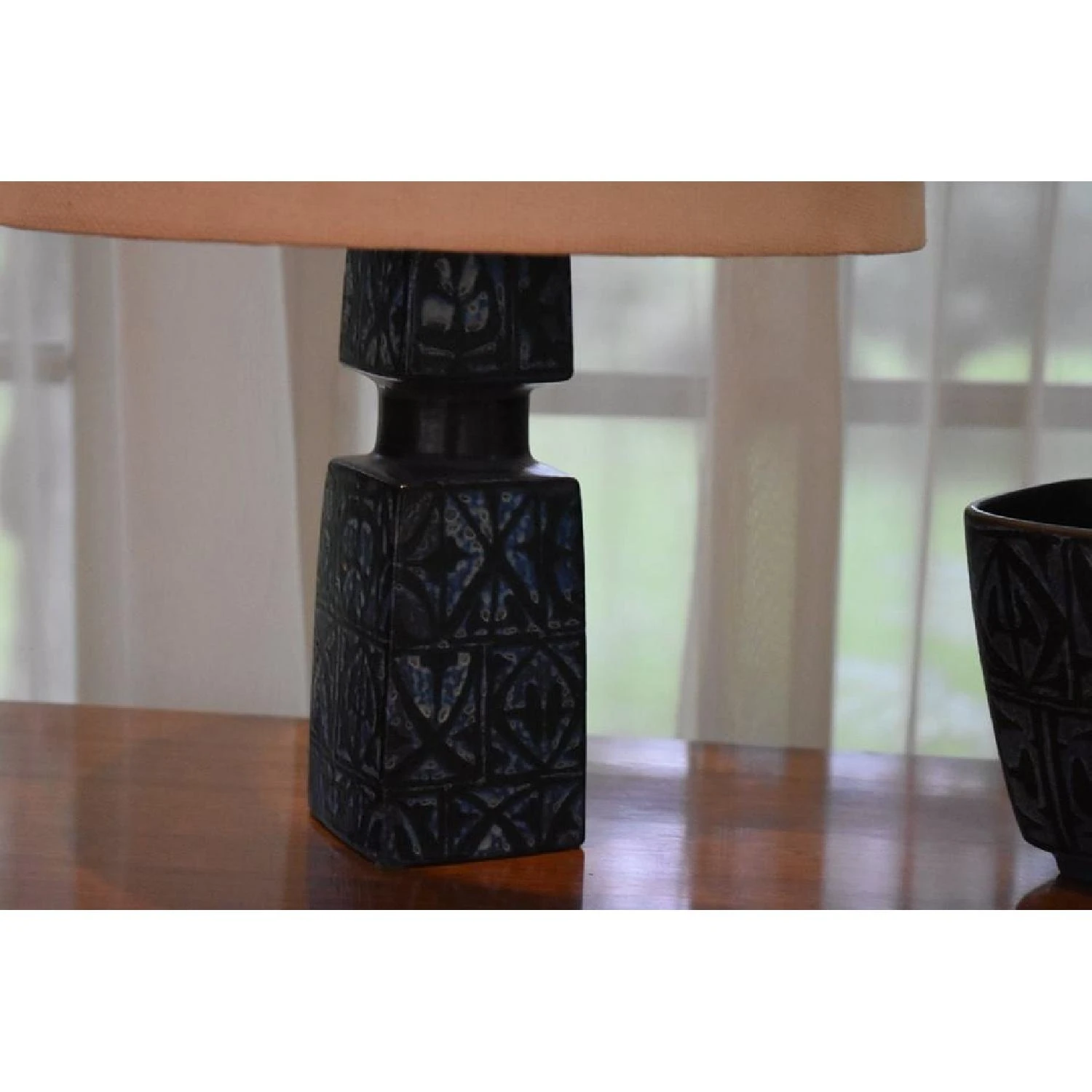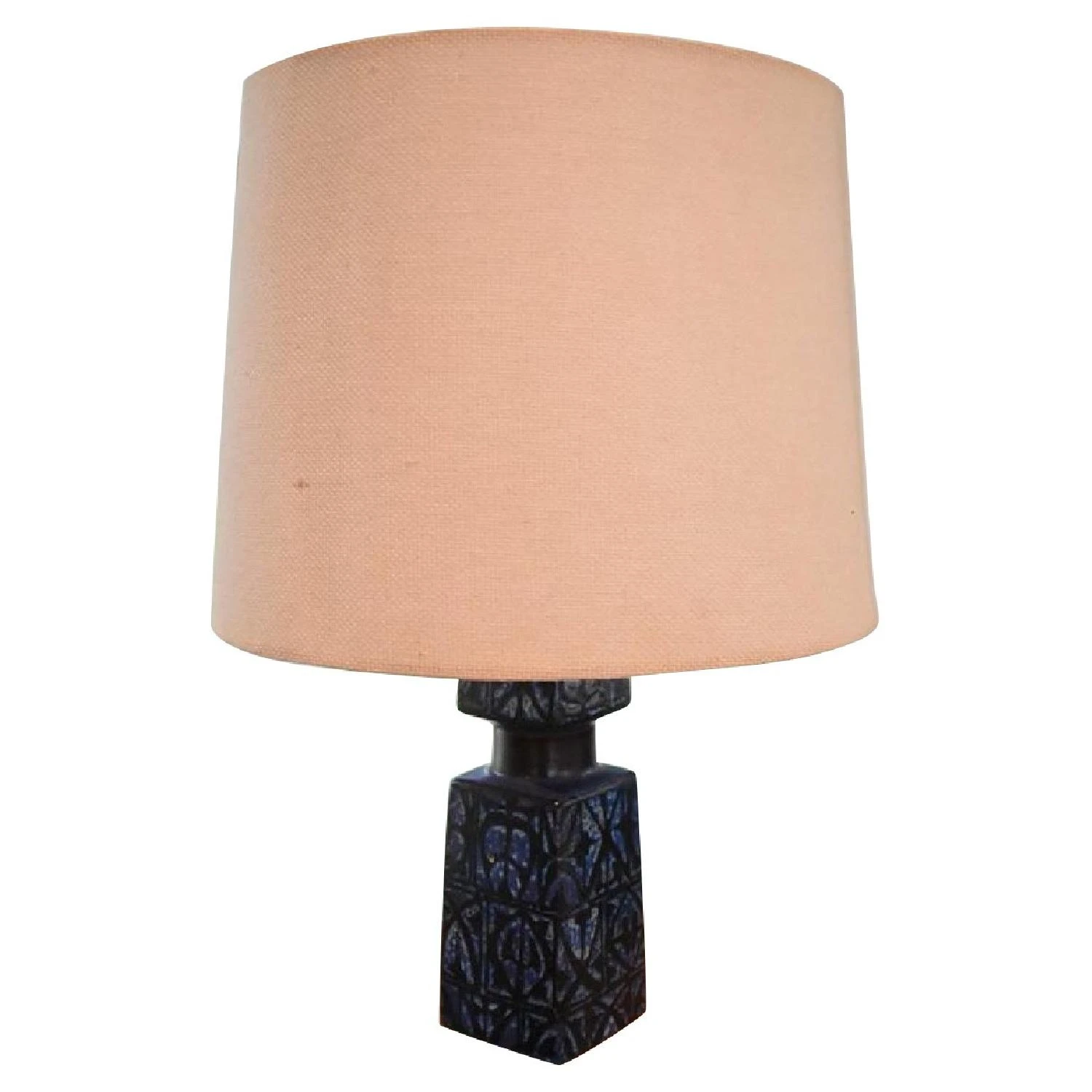 Seller’s Notes: Beautiful vintage lamp designed by Nils Thorsson of Royal Copenhagen for Fog & Morup. This lamp is from the 1960s made in Denmark featuring a runic design known as Baca, created by Nils Thorsson of Royal Copenhagen. It is a ceramic vase with beautiful glaze, in working condition, with its original lamp shade. The shade’s height is adjustable to be lowered or raised based on preference. The lamp is in beautiful condition. I also have a vase from the same collection featuring the same design pattern also for sale. The base of the vase is about 11″ tall and 3″ wide. Very rare and highly collectible piece of mid century modern Danish design.