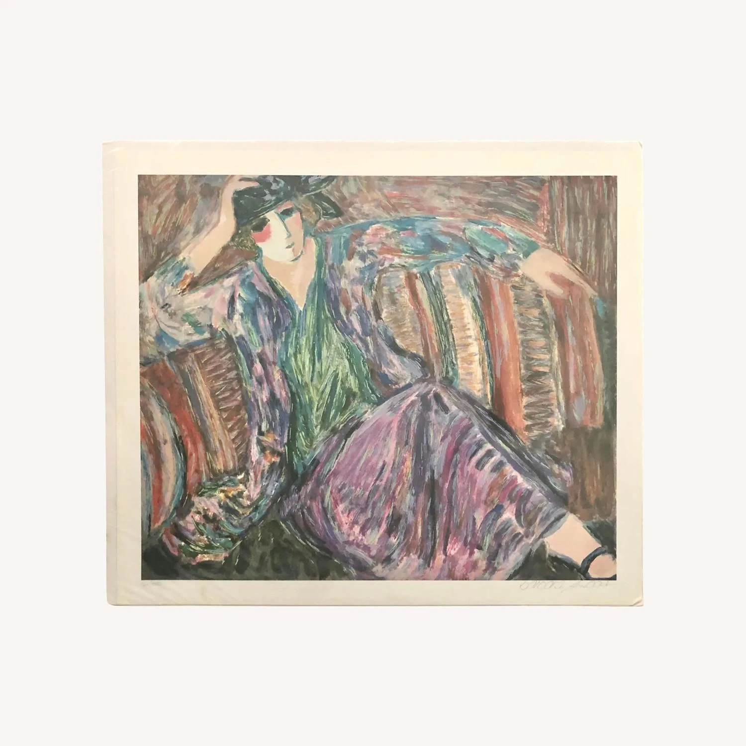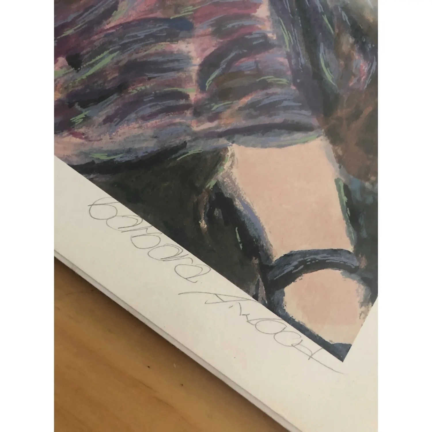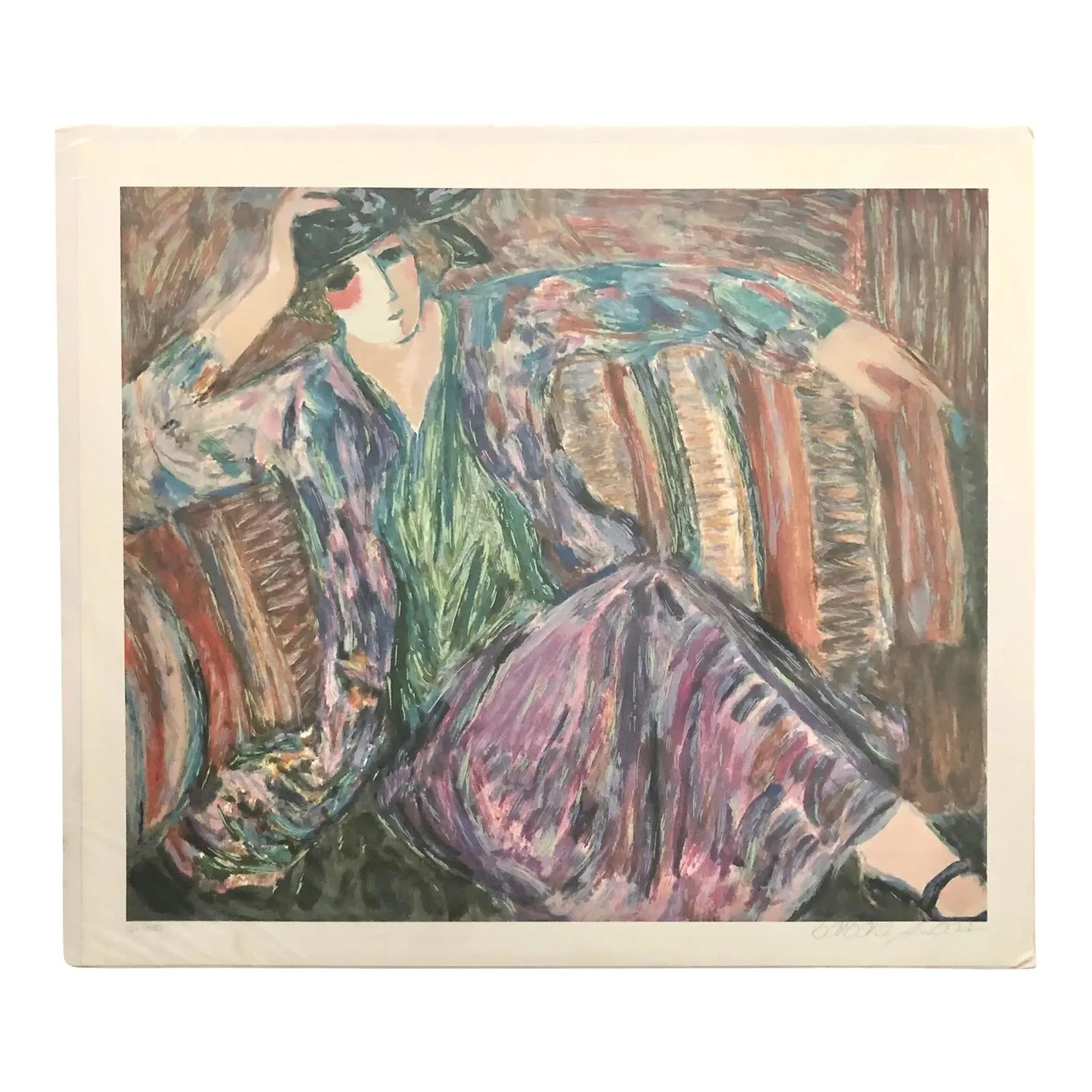 Seller’s Notes: “Pensive Woman” Splash this colorful print onto a lonley wall in your eclectic home. BARBARA WOOD listed artist born 1926. Hand signed and numbered. Lush original lithograph, signature to lower right reads ‘Barbara A Wood’, edition to lower left reads ‘564/1250’, subject a reclining woman, measures 18.25″ x 21.5″, not framed. Ships as is, shrinkwrapped on foam board. Please excuse any reflections in the photos. Ready for the wonderful frame of your choice. Circa 1980.