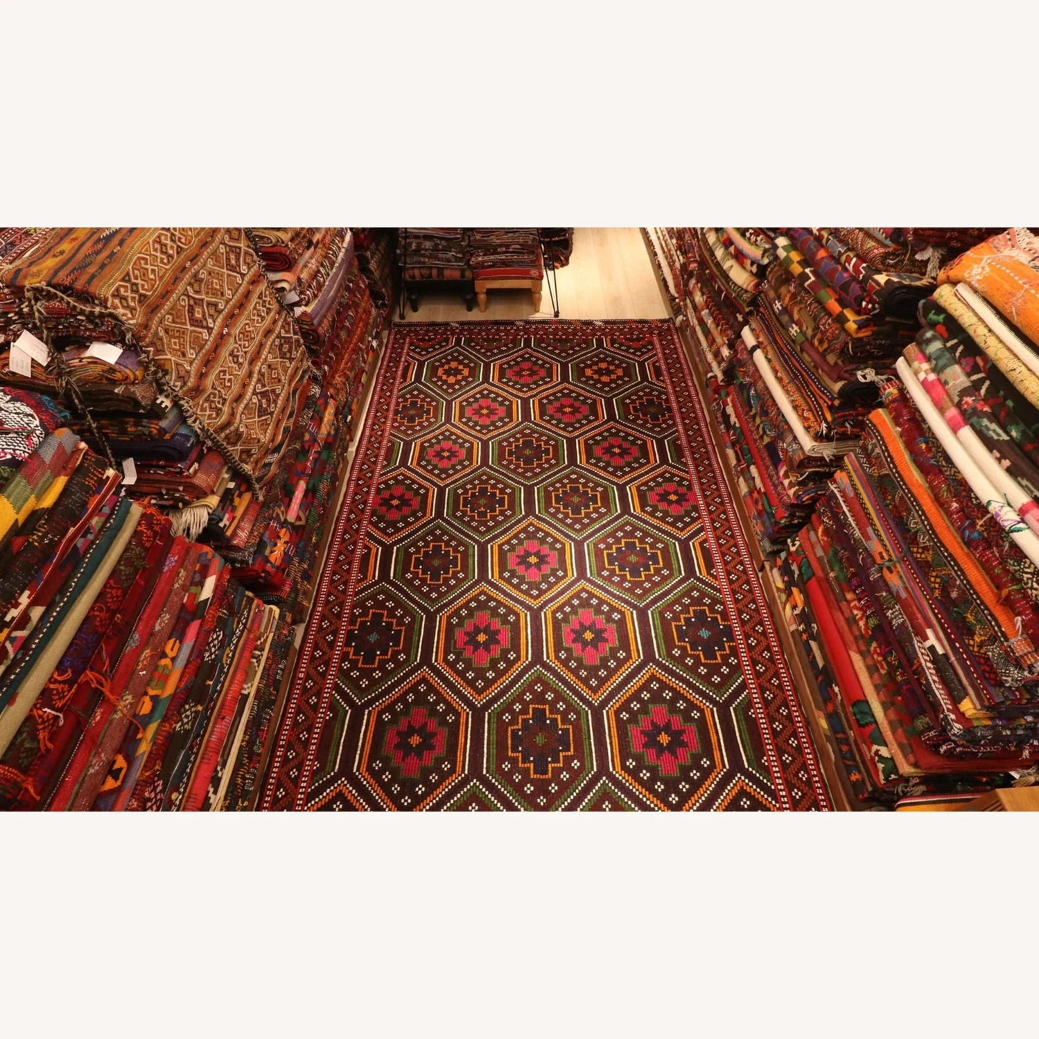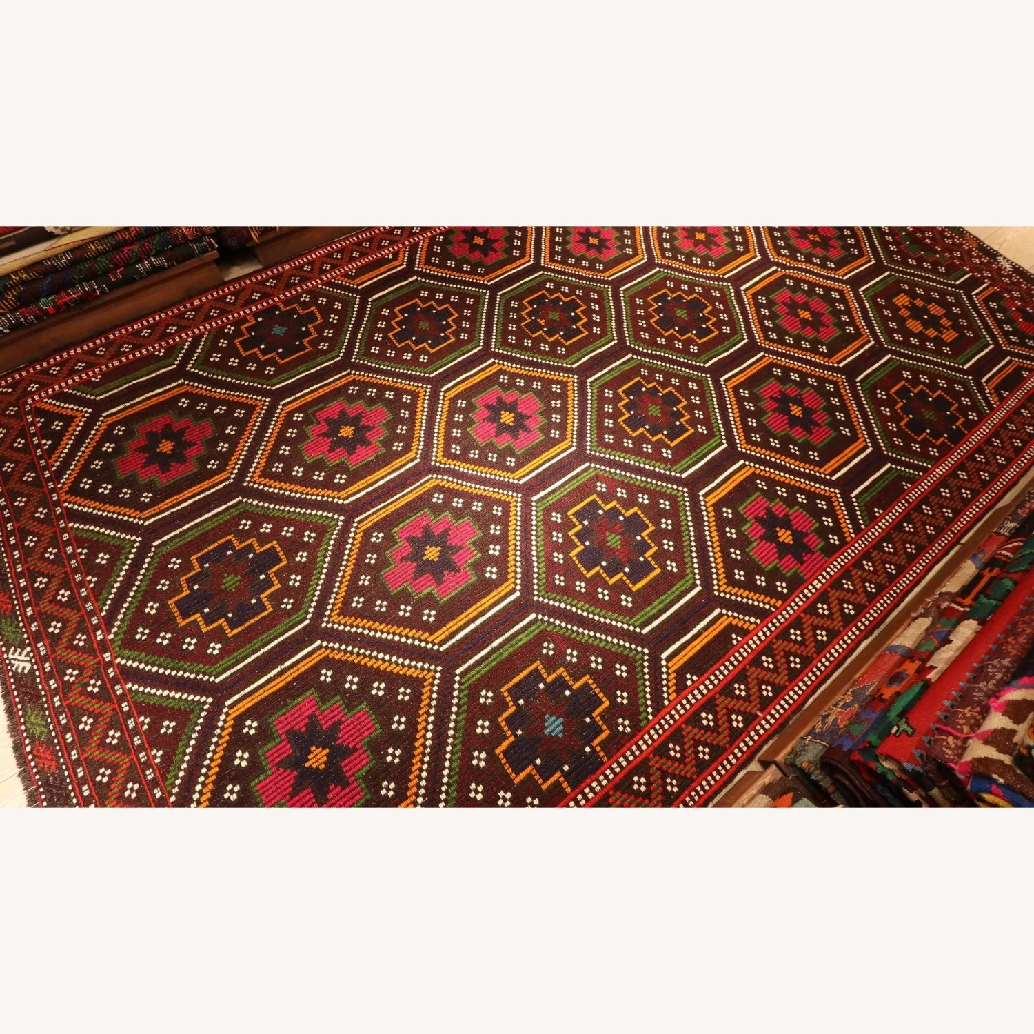 This bohemian rug, measuring 6×11, is not only a stunning floor covering but also a work of art that can be used as a wall hanging kilim. The kilim rug boasts an Anatolian aesthetic, featuring a dazzling geometric pattern interwoven with traditional motifs, all in a mature color scheme of rich reds, oranges, greens, and whites. The borders are equally impressive, exhibiting striations in similar tones set against a solid black background, reminiscent of the nomadic feel of the piece.
