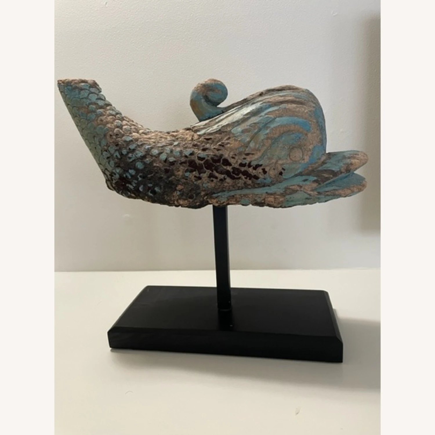 Seller’s Notes: While I do not know the exact provenance of this wonderful wooden dolphin figurehead, the antique shop owner advised me of its approximate age and remarkable condition given the high seas where he adorned the bow of a ship from years gone by. His body is hand carved. His color is turquoise painted upon weathered wood ( the paint may or may not have been refreshed ). He rests on a base of solid wood painted black. ****Ships’ figureheads have a long history embodying religion, symbolism and superstition *****What I have learned about this wonderful piece has been supplied to me where it was purchased 30 years ago at “MAM” – considered the largest collection of fine antique shops in New York State. link is millbrookantiquemall.com.