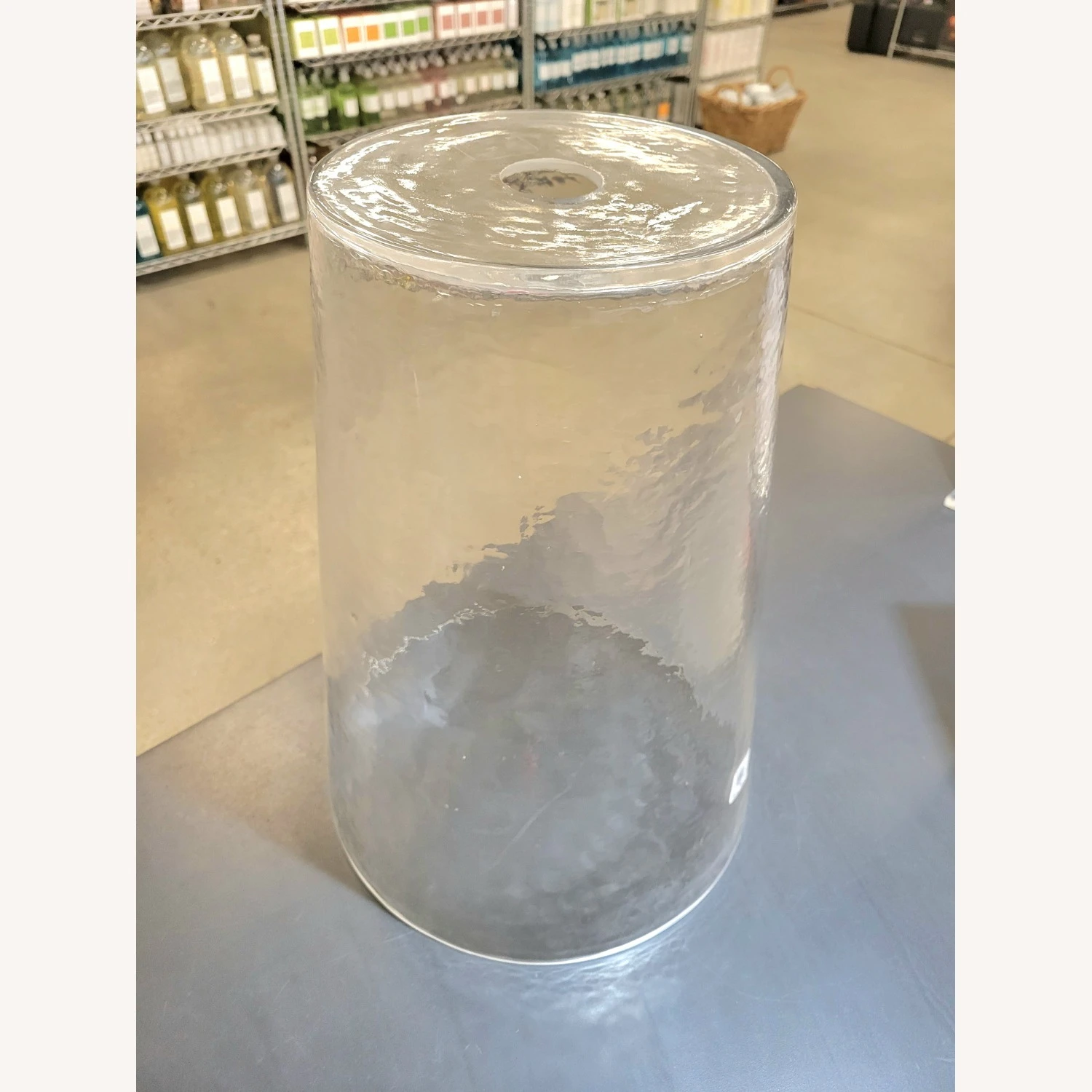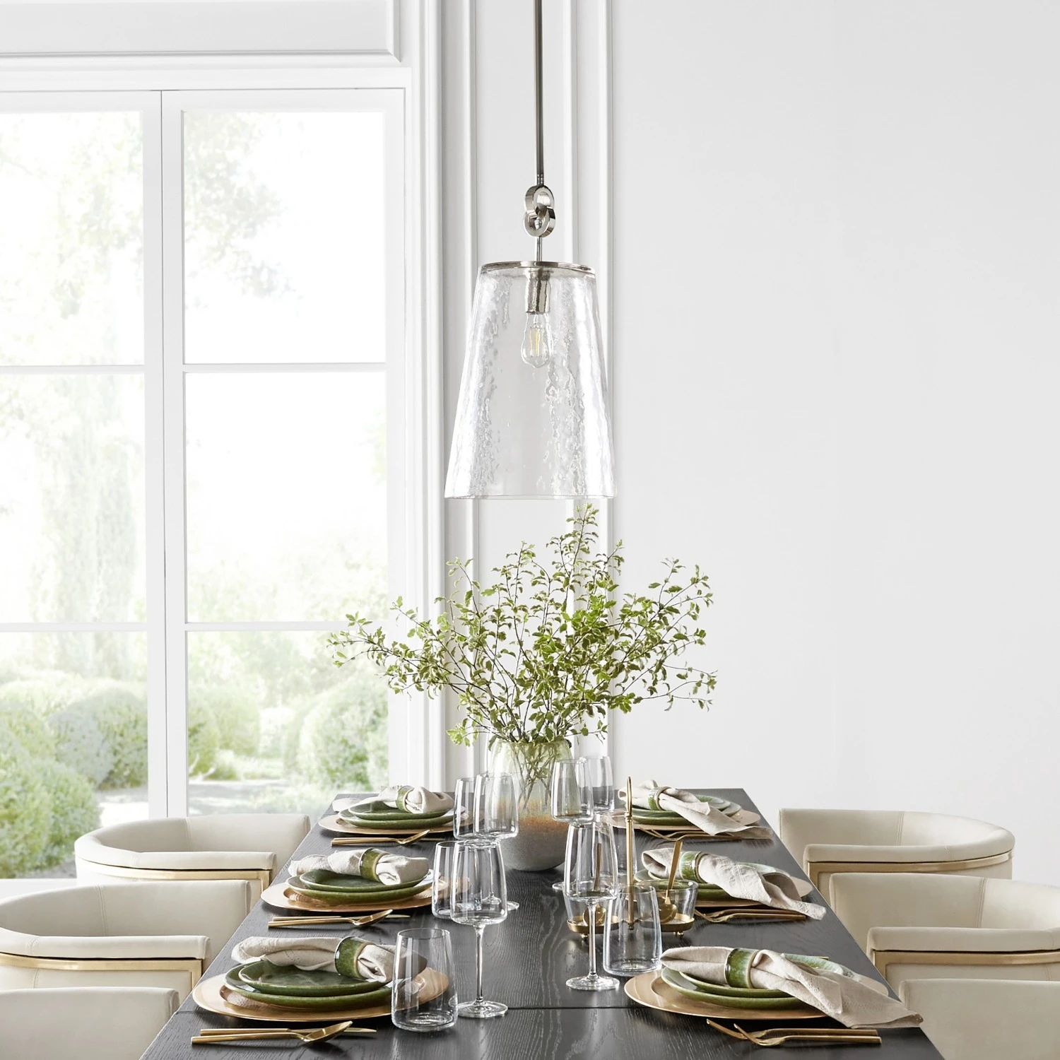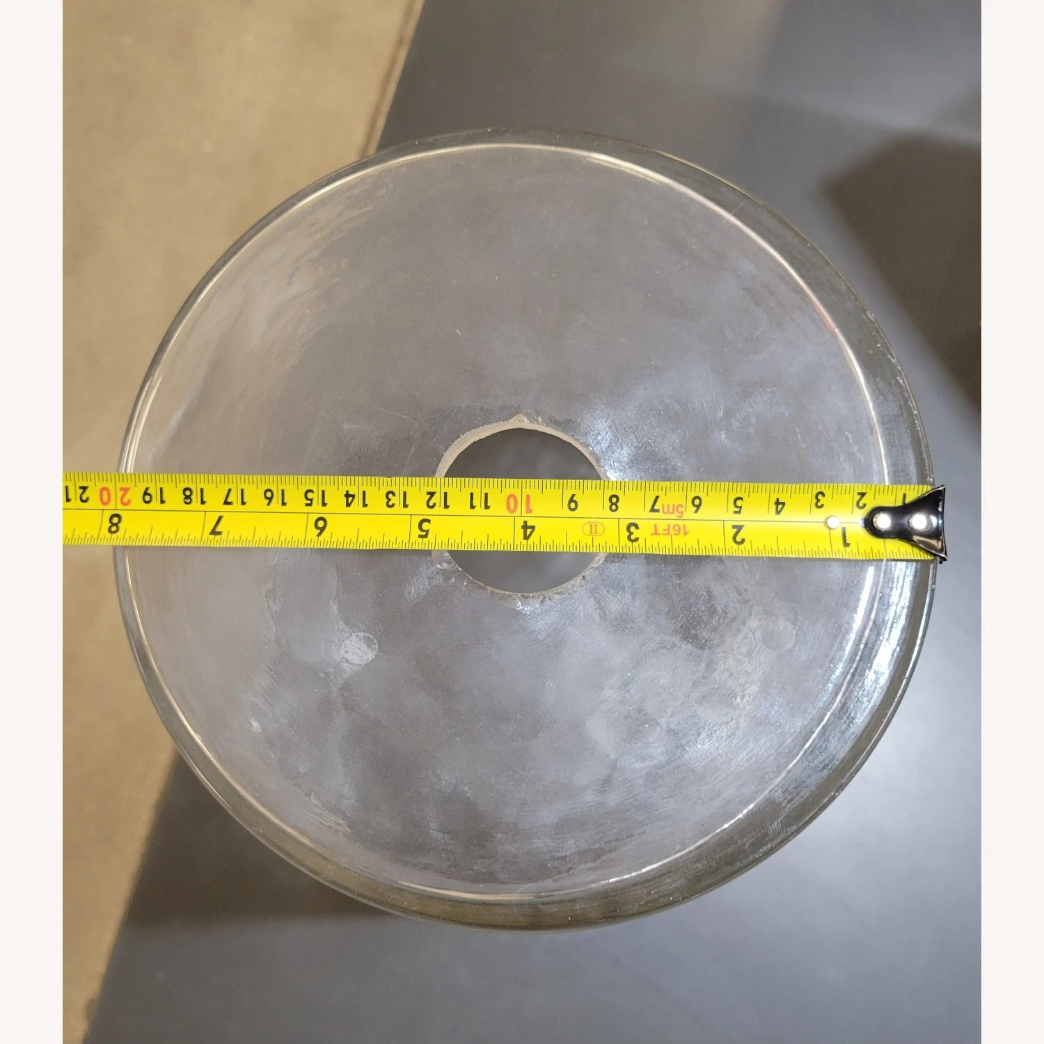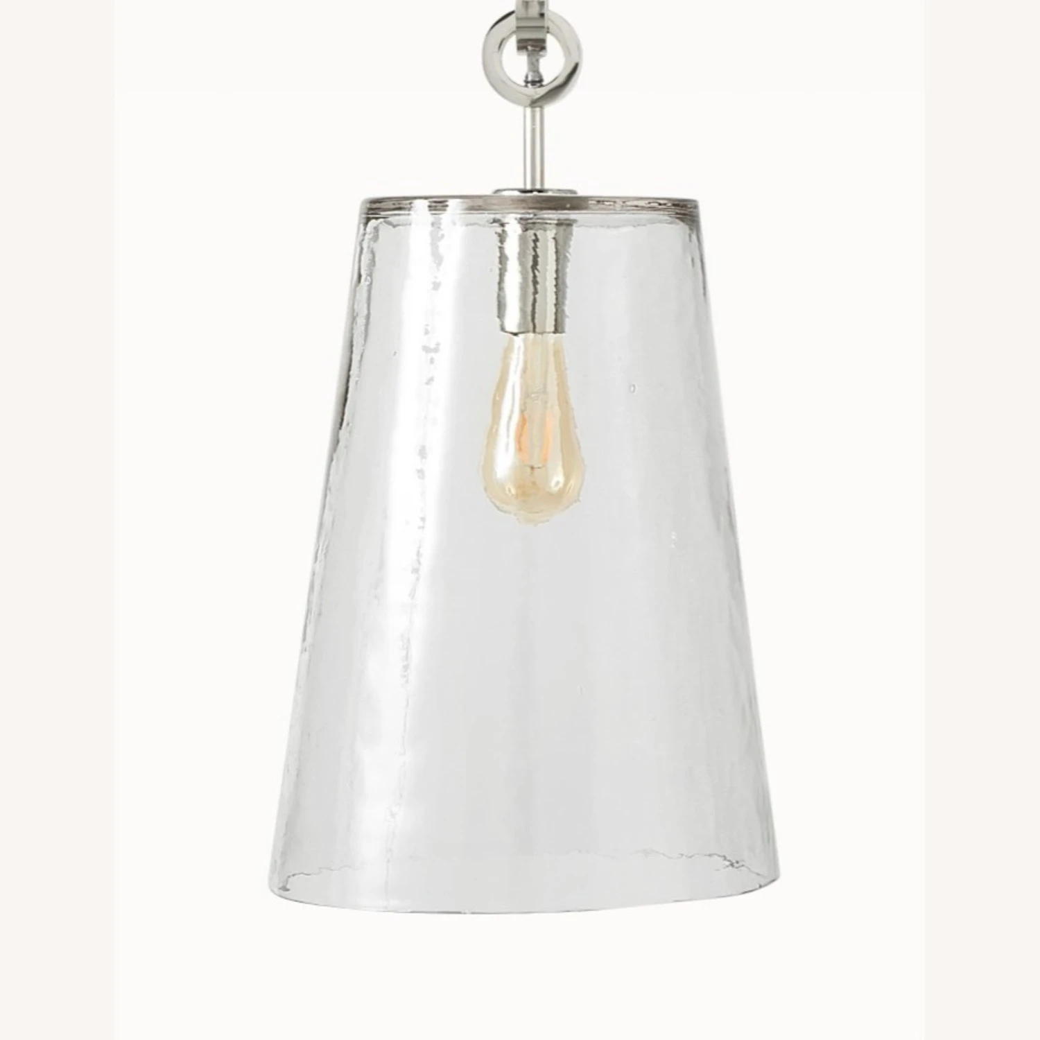 Medium Glass Shade fits Williams Sonoma Chain Link Pendant. 16″ Tall, 12″ Diam. at the base, 8″ Diam. at the top. 1.5″ Diam. ring opening.
